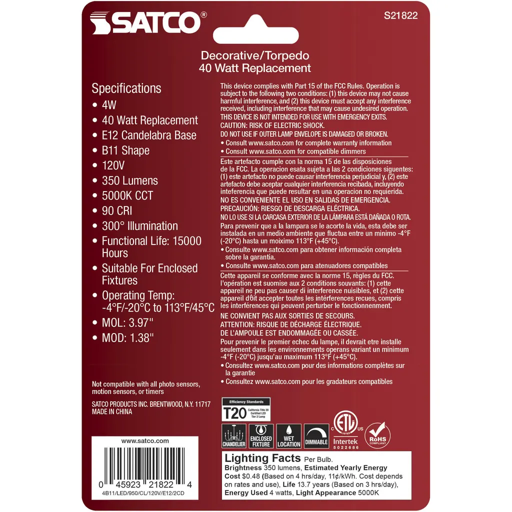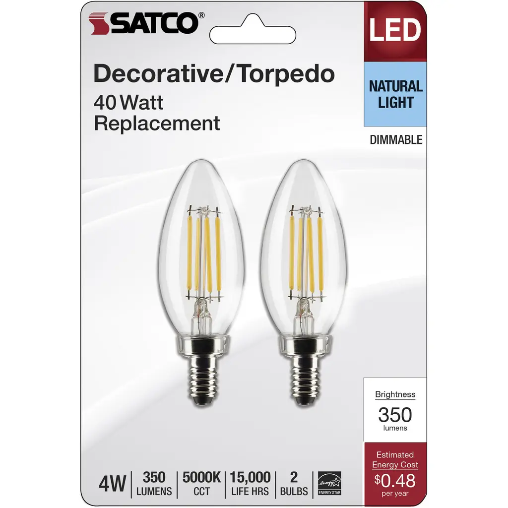 4-Watt B11 LED - Clear - Candelabra Base - 5000K - 350 Lumens - 120 Volts - 2-Pack
