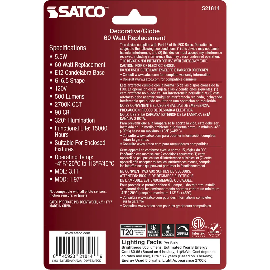 5.5-Watt G16.5 LED - White - Candelabra Base - 2700K - 500 Lumens - 120 Volts - 2-Pack