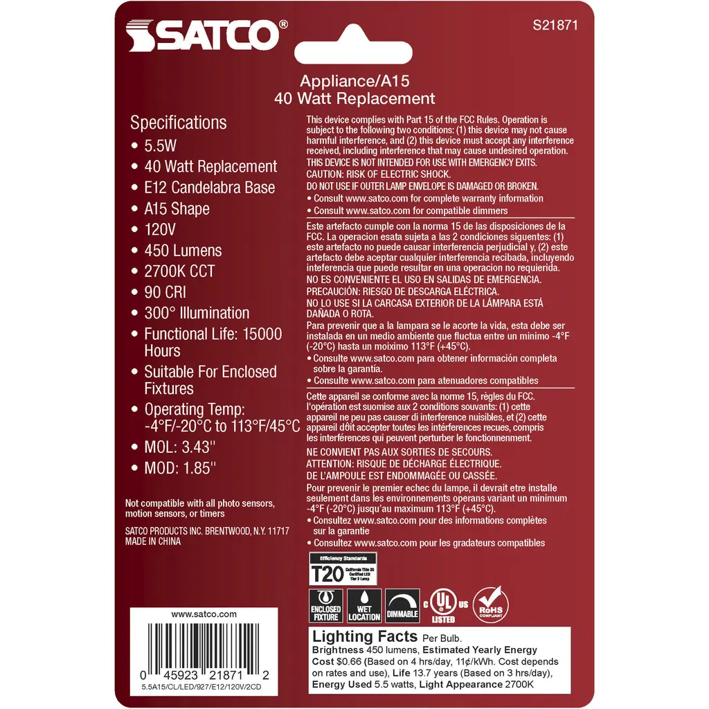 5.5-Watt A15 LED - Clear - Candelabra Base - 2700K - 450 Lumens - 2-Pack