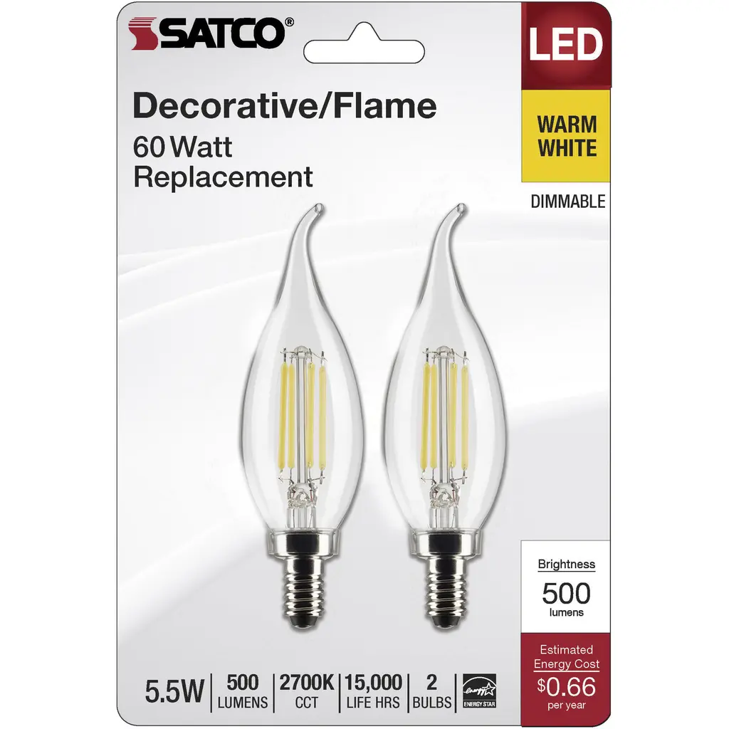 5.5-Watt CA10 LED - Clear - Candelabra Base - 2700K - 500 Lumens - 120 Volts - 2-Pack