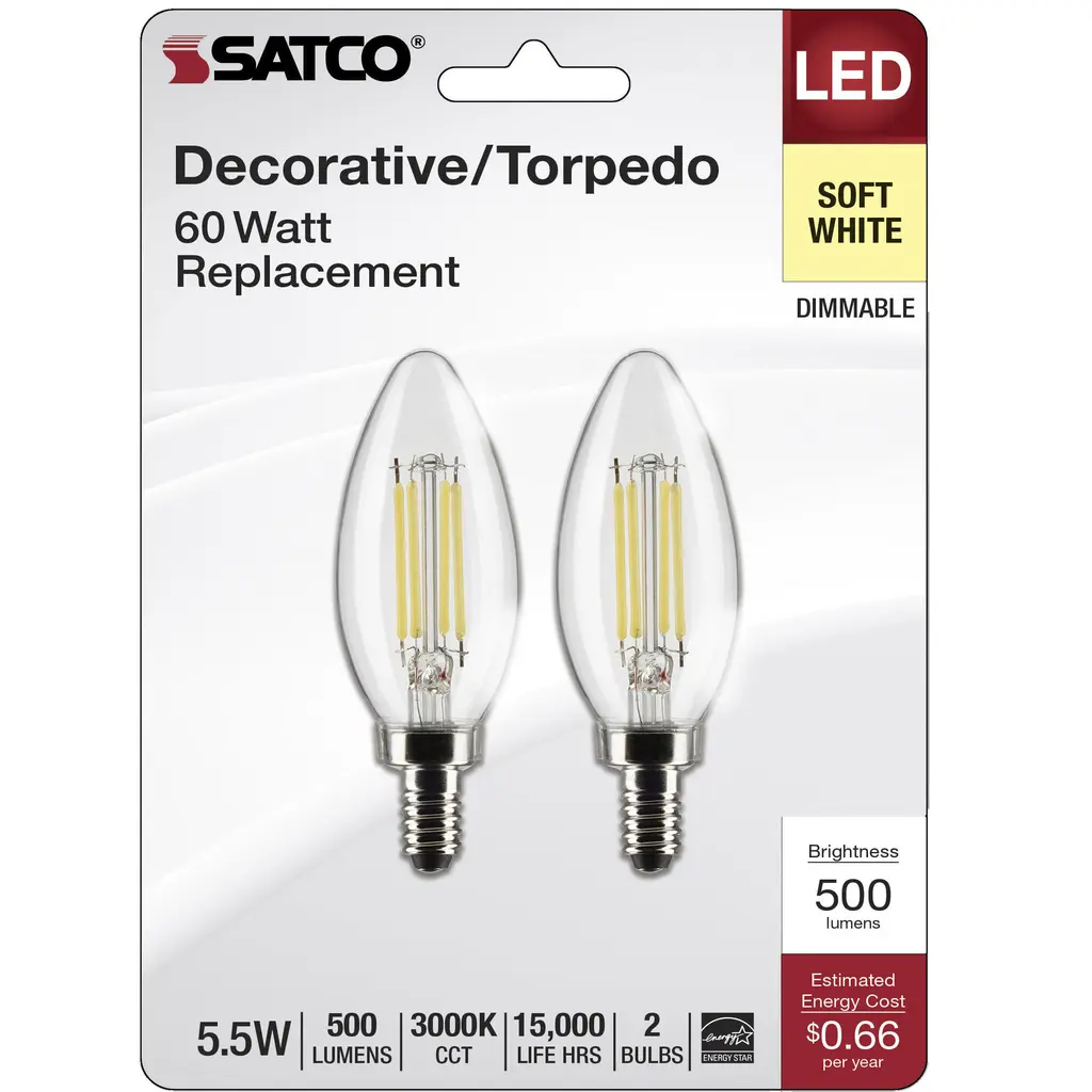 5.5-Watt B11 LED - Clear - Candelabra Base - 3000K - 500 Lumens - 120 Volts - 2-Pack