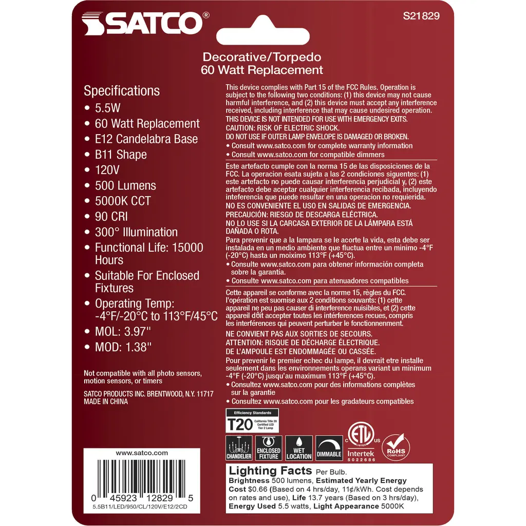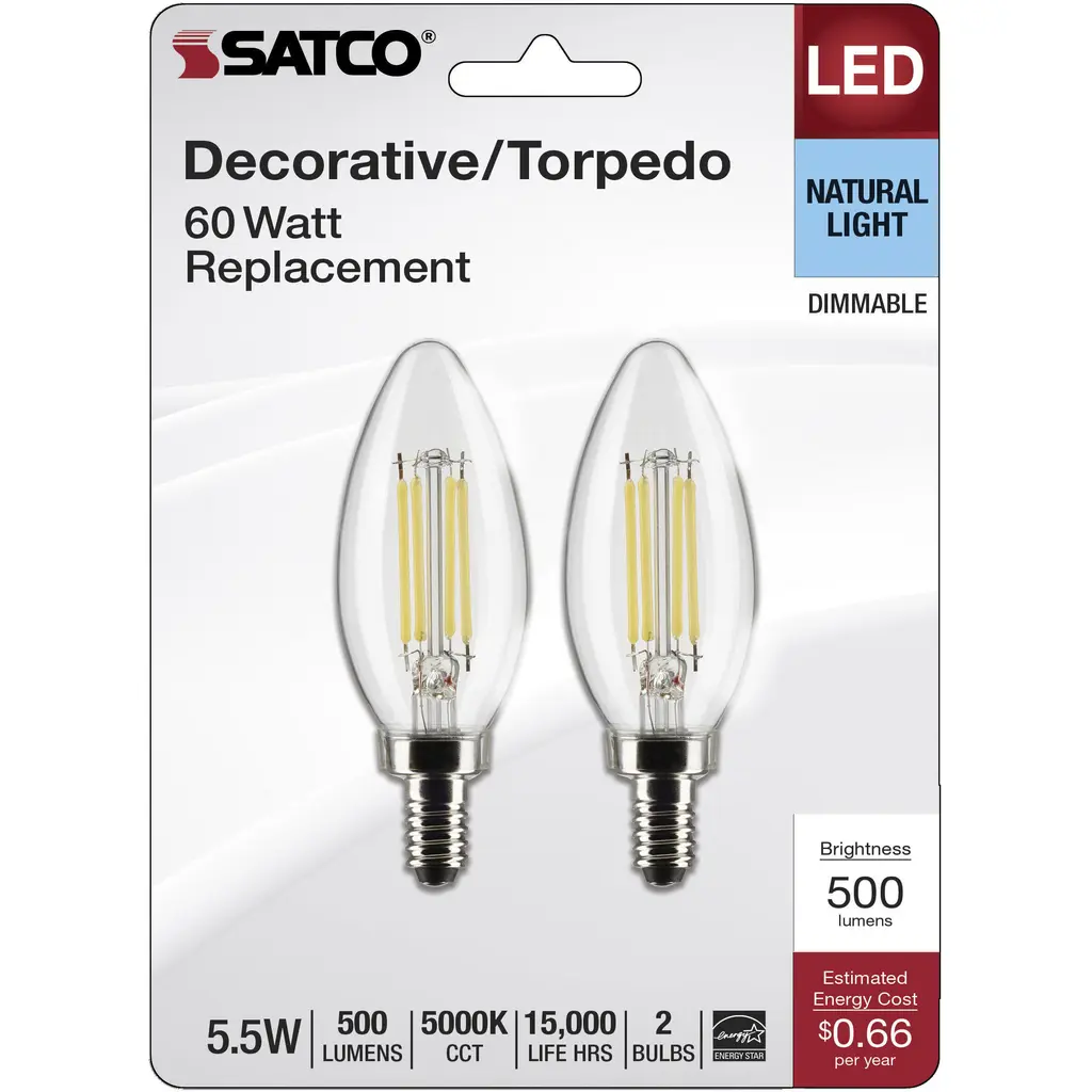 5.5-Watt B11 LED - Clear - Candelabra Base - 5000K - 500 Lumens - 120 Volts - 2-Pack