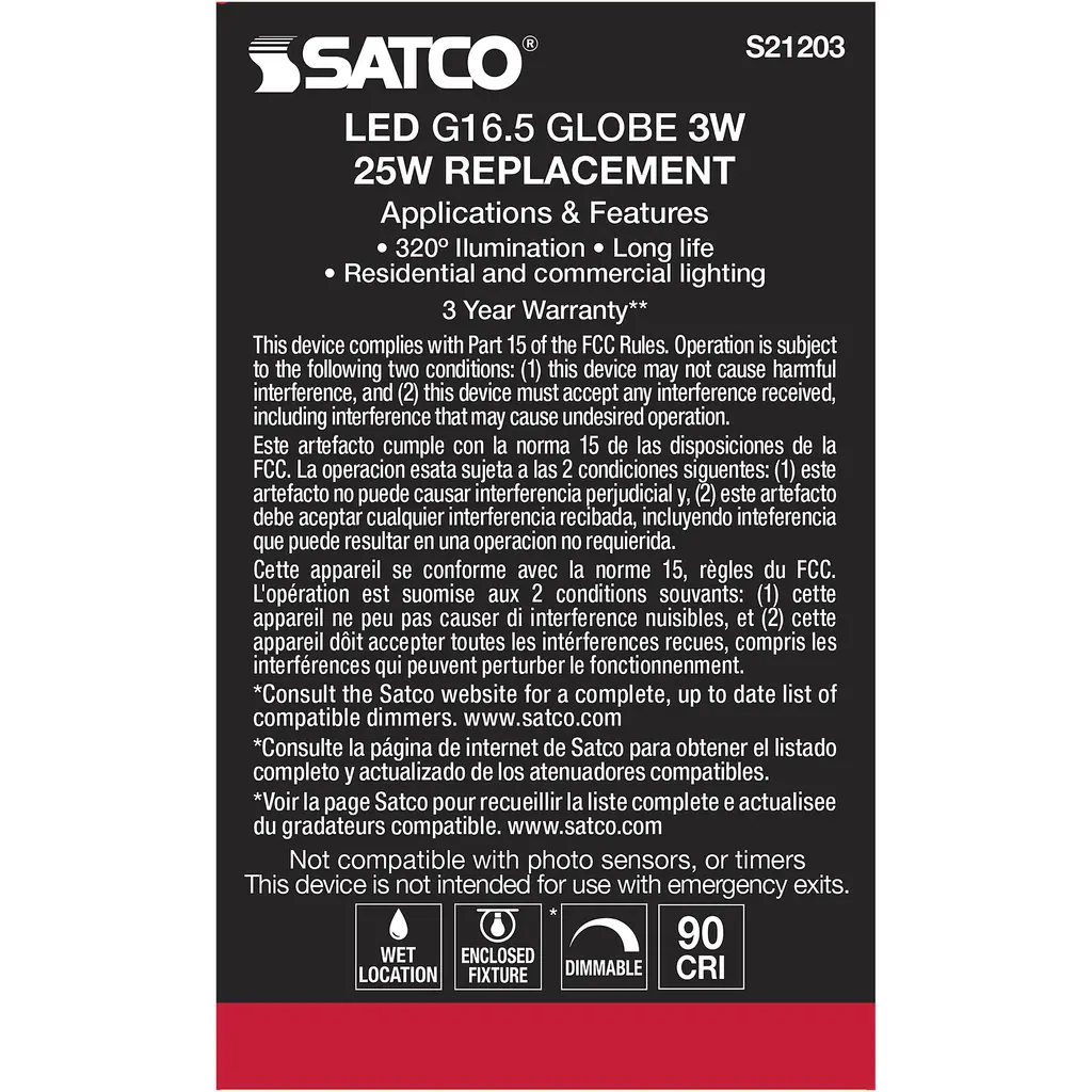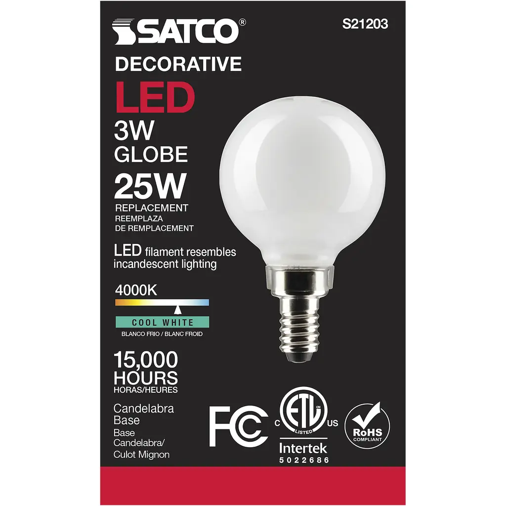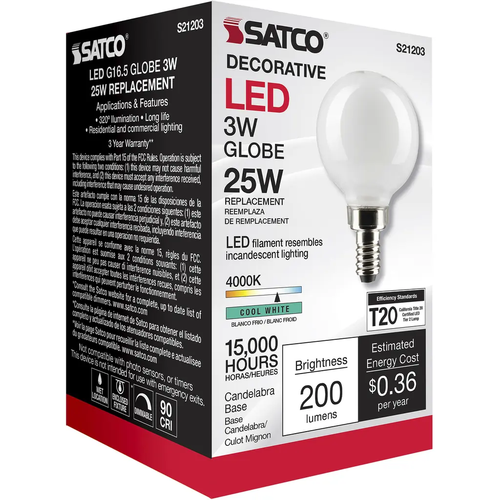 3 Watt G16.5 LED Lamp - White - Candelabra Base - 90 CRI - 400K - 120 Volts