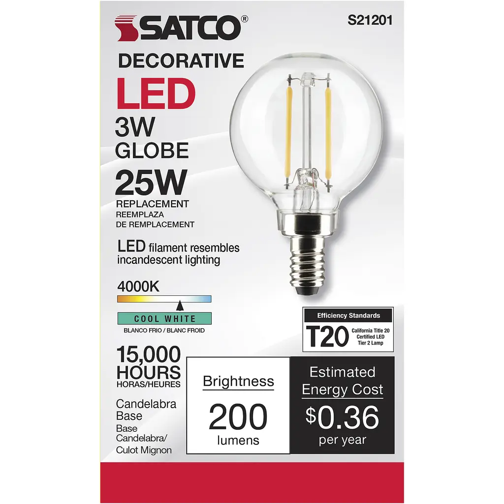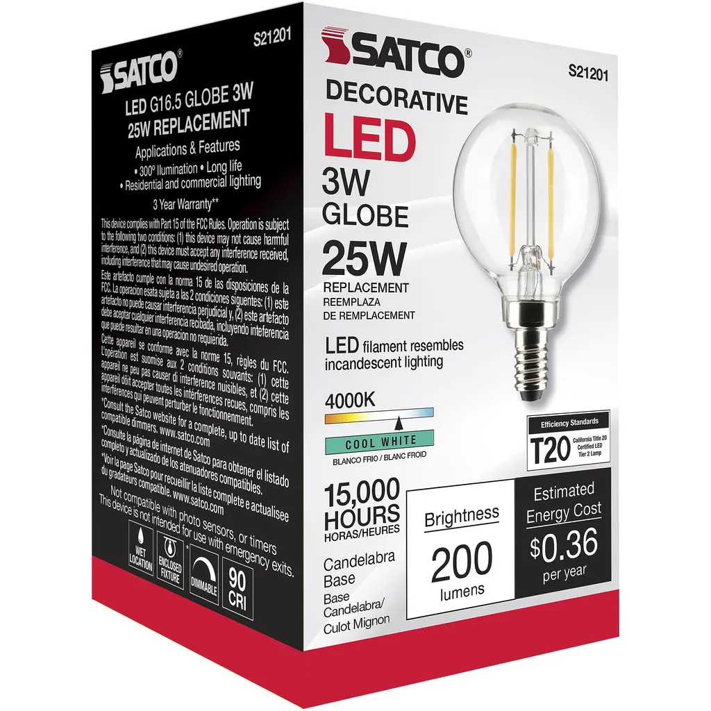 3 Watt G16.5 LED Lamp - Clear - Candelabra Base - 90 CRI - 400K - 120 Volts