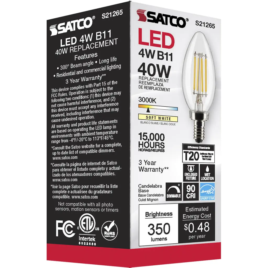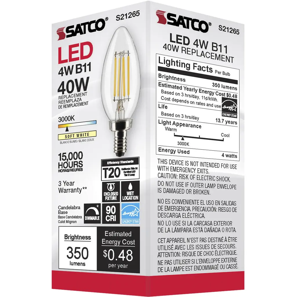 4 Watt B11 LED Lamp - Clear - Candelabra Base - 90 CRI - 3000K - 120 Volts