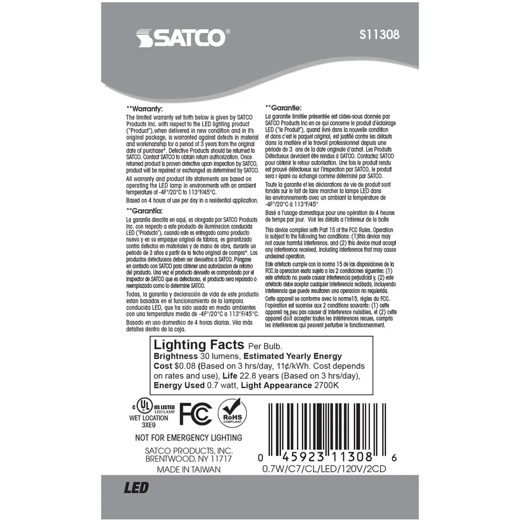 0.7 Watt LED - C7 - Clear - 2700K - Candelabra Base - 120 Volt - Carded 2-Pack