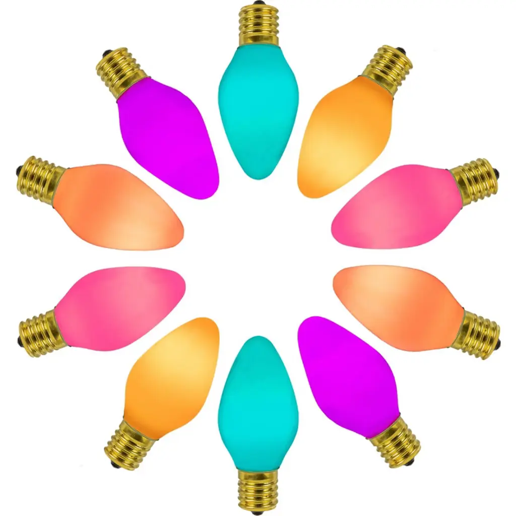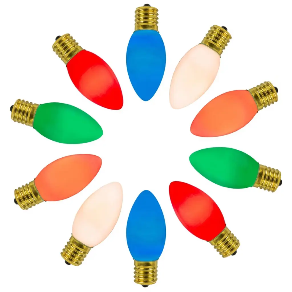 Luxrite C7 LED Colored Light Bulbs - Express yourself with these colored LED string light bulbs that will enrich your space during the holiday season. The perfect replacement bulbs to your existing string lights or night lights that add fun, rich color whether used indoors or outdoors. Available in a variety of colors, so you can mix and match other colored bulbs together for a unique twist to your space. Each light bulb only uses 0.5 watts of power, which means not only will you get to enjoy a colorful decor but you will also save energy while doing it. With it's enclosed fixture rating and wet location rating, you'll be able to use these in almost any location without issue. Along with it's energy savings, these will also last longer than traditional lights with it's 15,000 hour lifetime. You can use these lights year after year and not have to think about getting additional replacements. Zero flickering light, zero delay, and zero worry with Luxrite color light bulbs that are UL listed for your safety and come with a 2 Year Warranty.