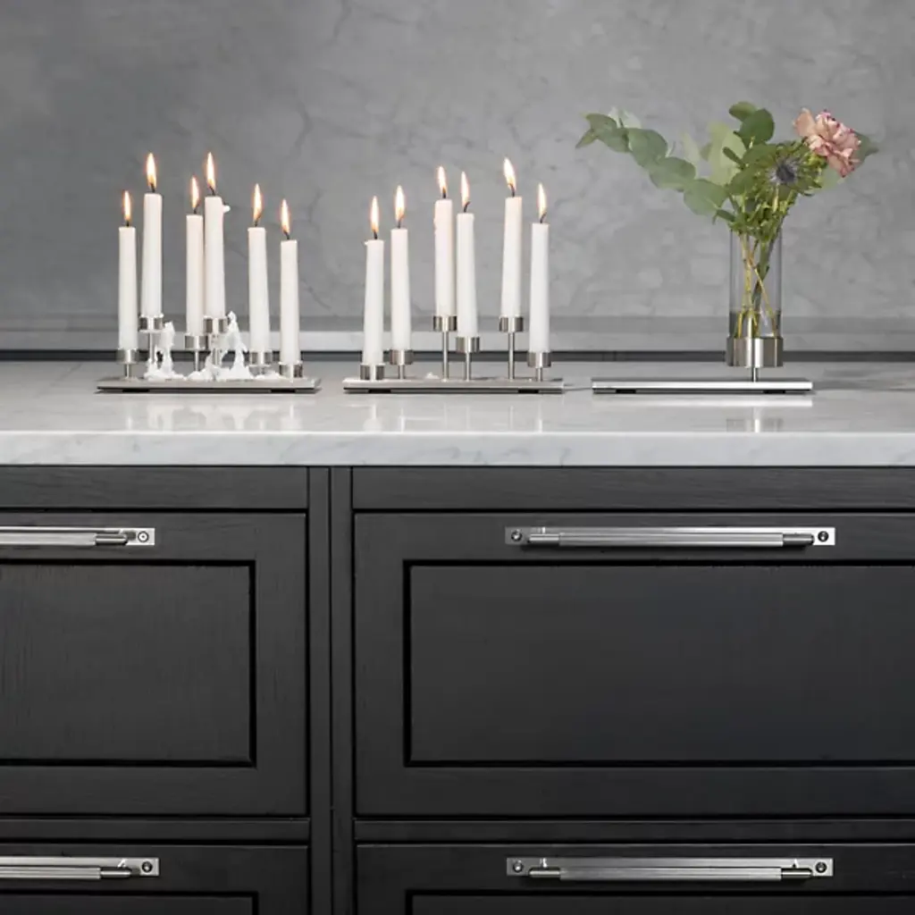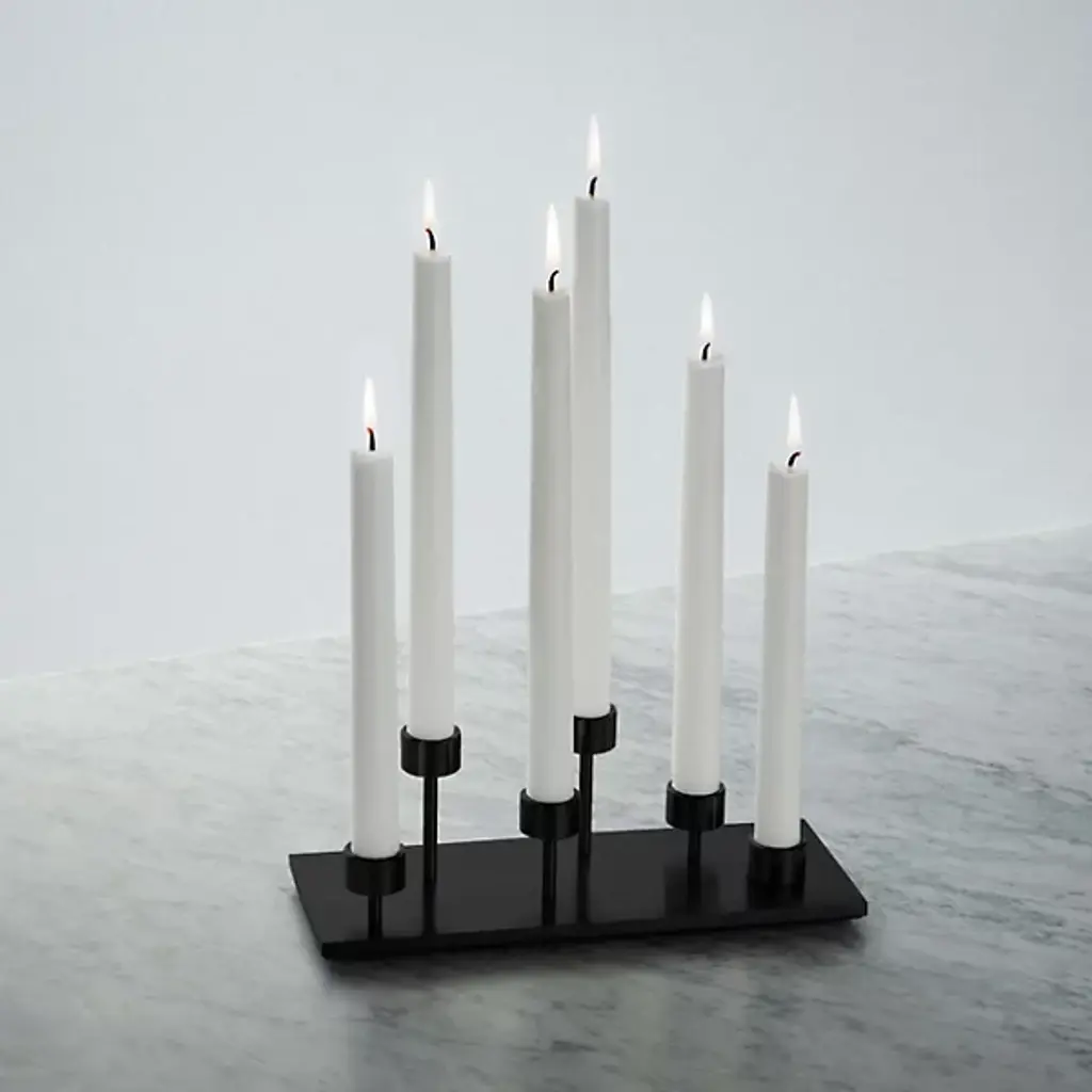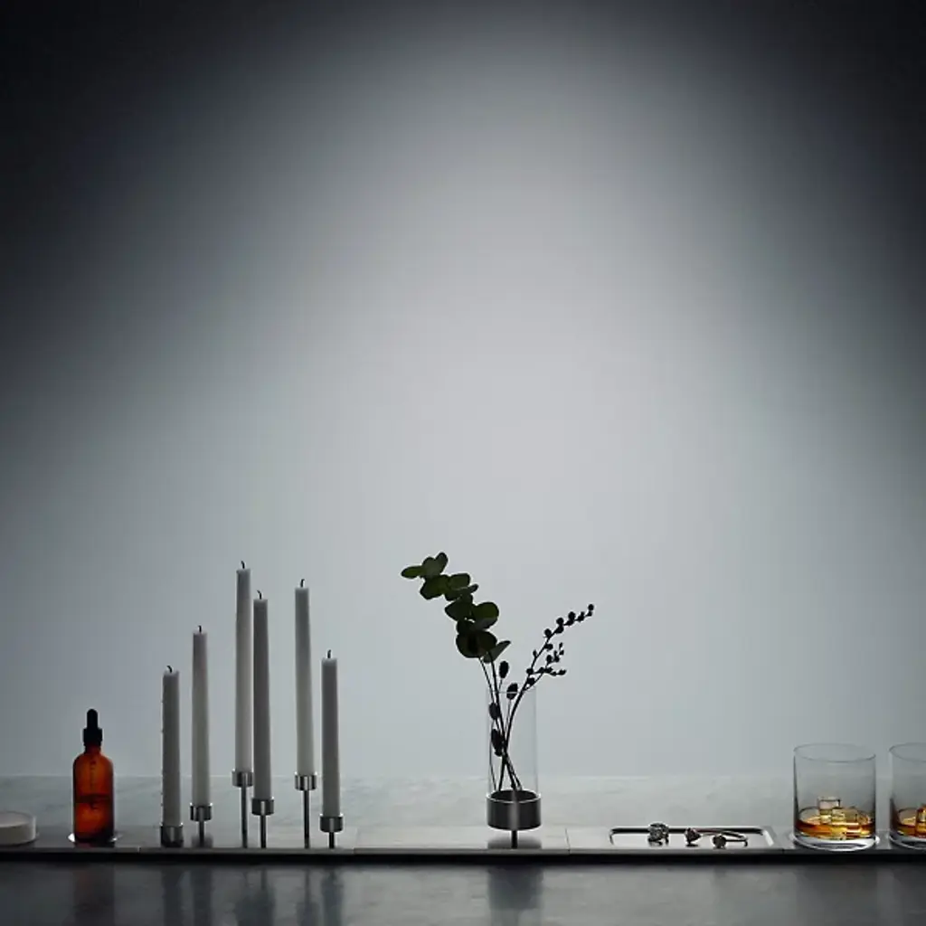 The Machined Candelabra from Buster + Punch elevates the ambiance of your living space. Made with industrial elegance, a collection of meticulously machined holders is arranged to bring your candles to different heights. The encasements rest upon a metal plate, forming a mesmeric visual spectacle. The interplay of light and shadows from your candles dances across your space, adding depth and character to your decor.