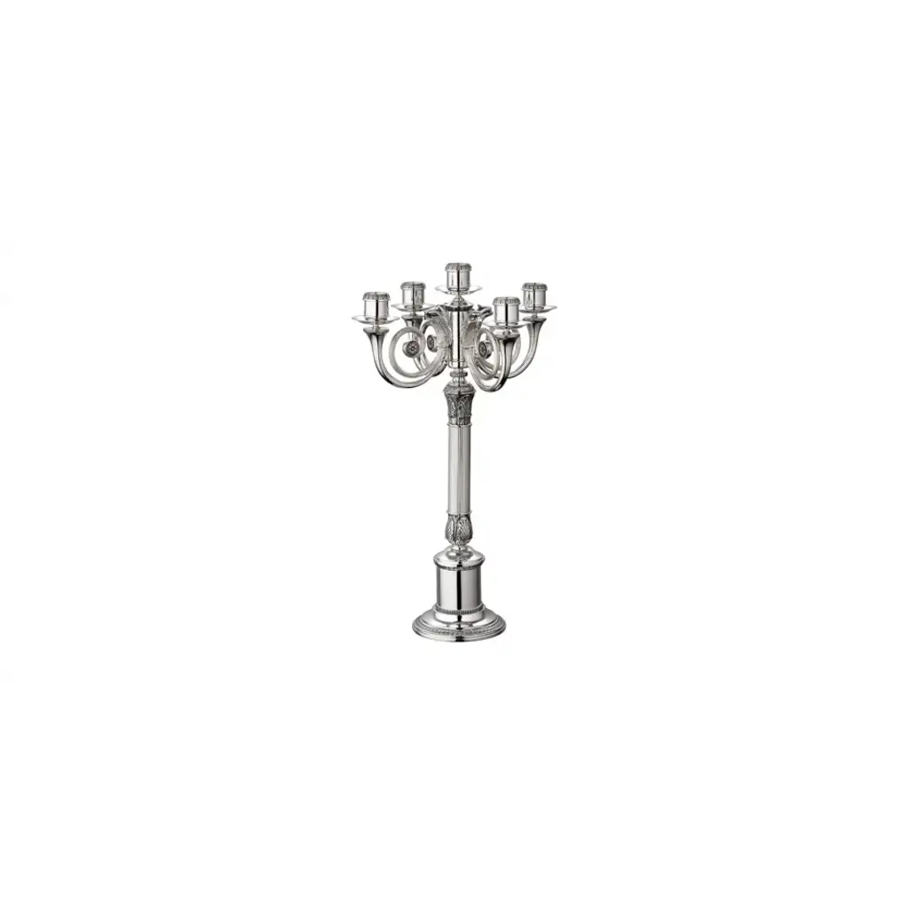 This silver plated Malmaison candelabra, which can hold up to five candles, adds refinement and elegance to any room. One of Christofle's most historic patterns, Malmaison typifies the Empire style, with its frieze of delicate palm and lotus leaves and symmetrical design. The name is a nod to the Chateau de la Malmaison, a favored Parisian residence of Napoleon Bonaparte and Empress Josephine. It is also the only line that includes a caviar service. H. 16 1/2" (41.9 CM) Thanks to its creations in silver, Christofle is a symbol of luxury and elegance. Since its founding in the mid-19th century, it has been a continous innovative force and has infused each era with a new art of living. Thus, over time, this prestigious company has revolutionized styles, techniques, and methods for the production and distribution of silver plate and the decorative arts. A player in and privileged witness to the evolution of taste, customs, and traditions, Christofle has always seen its name associated with major creative trends, renowned artists such as Man Ray or Jean Cocteau, avant-garde architects such as Gio Ponti, and modernist silversmiths such as Lino Sabattini and Christian Fjerdingsatd, as well as present-day designers such as Andrée Putman, Martin Szekely or Ora ïto. Today, as in the past, whether gracing the tables of emperors, princes, or maharajas, in palaces, on board the Trans-Siberian Railway, Orient Express, or transatlantic ocean liners, or in the contemporary restaurants, Christofle continues to make an impression.