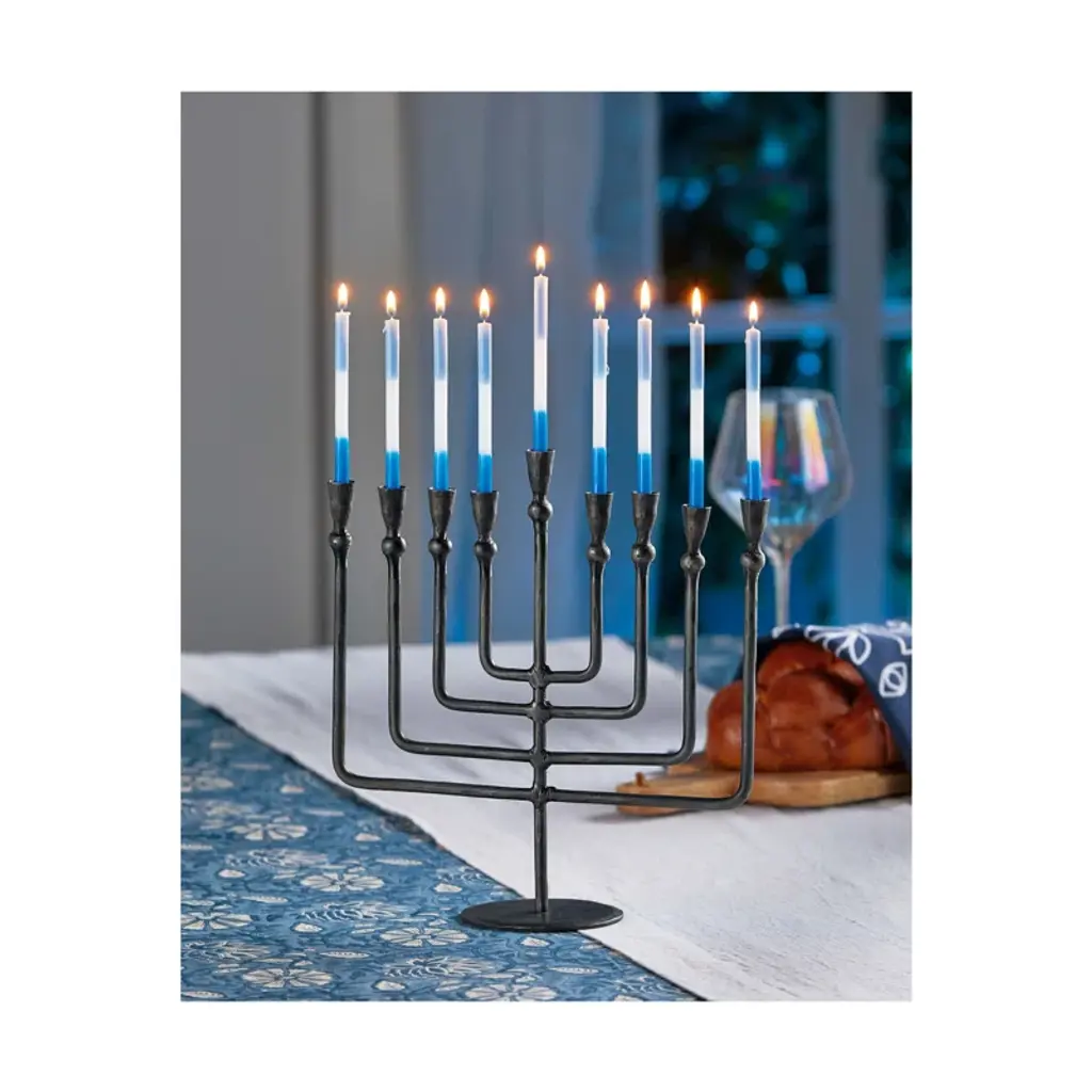 this taper holder is a unique and stylish way to celebrate hanukkah. the black iron menorah is modern and sophisticated, and it will make a beautiful statement on your mantel or table.