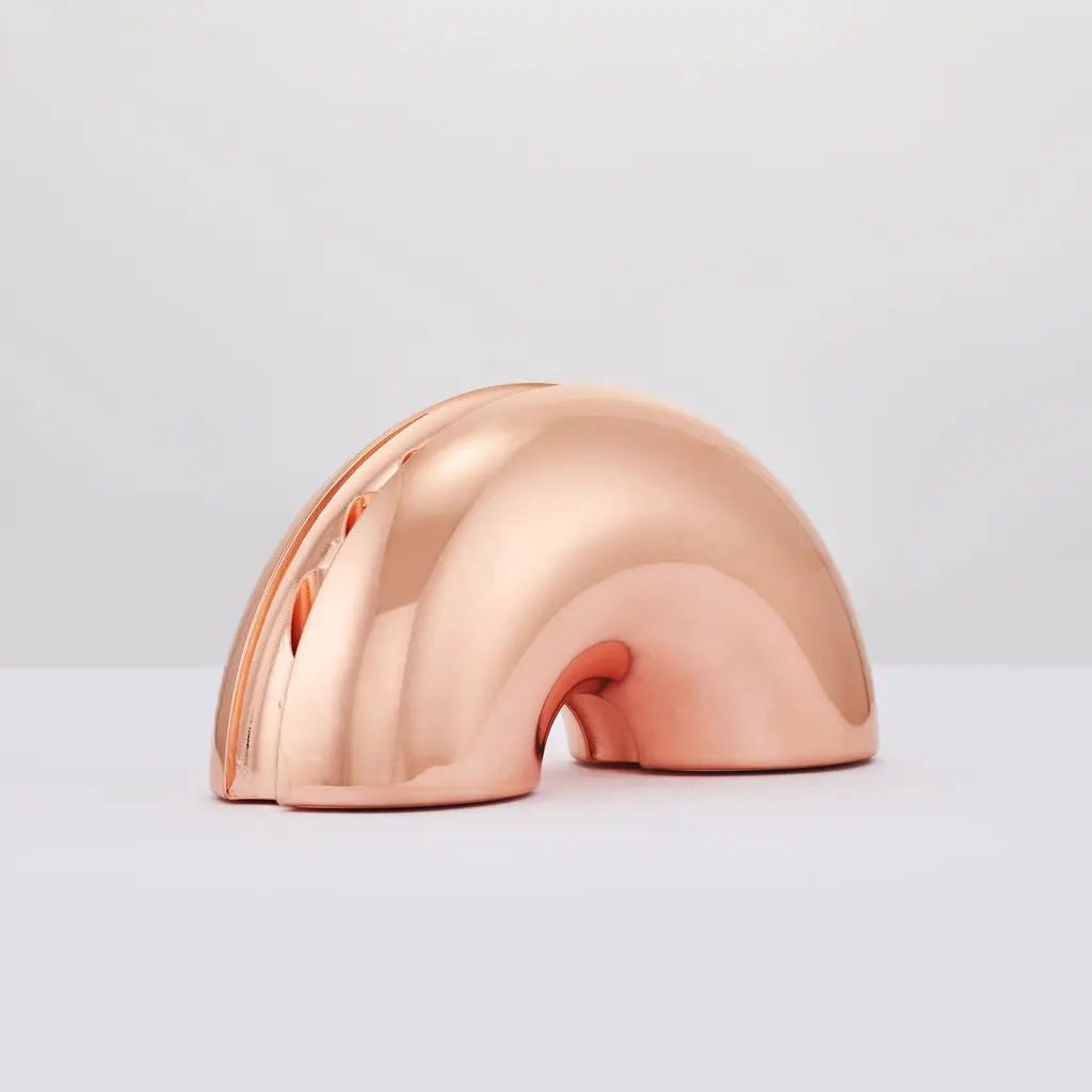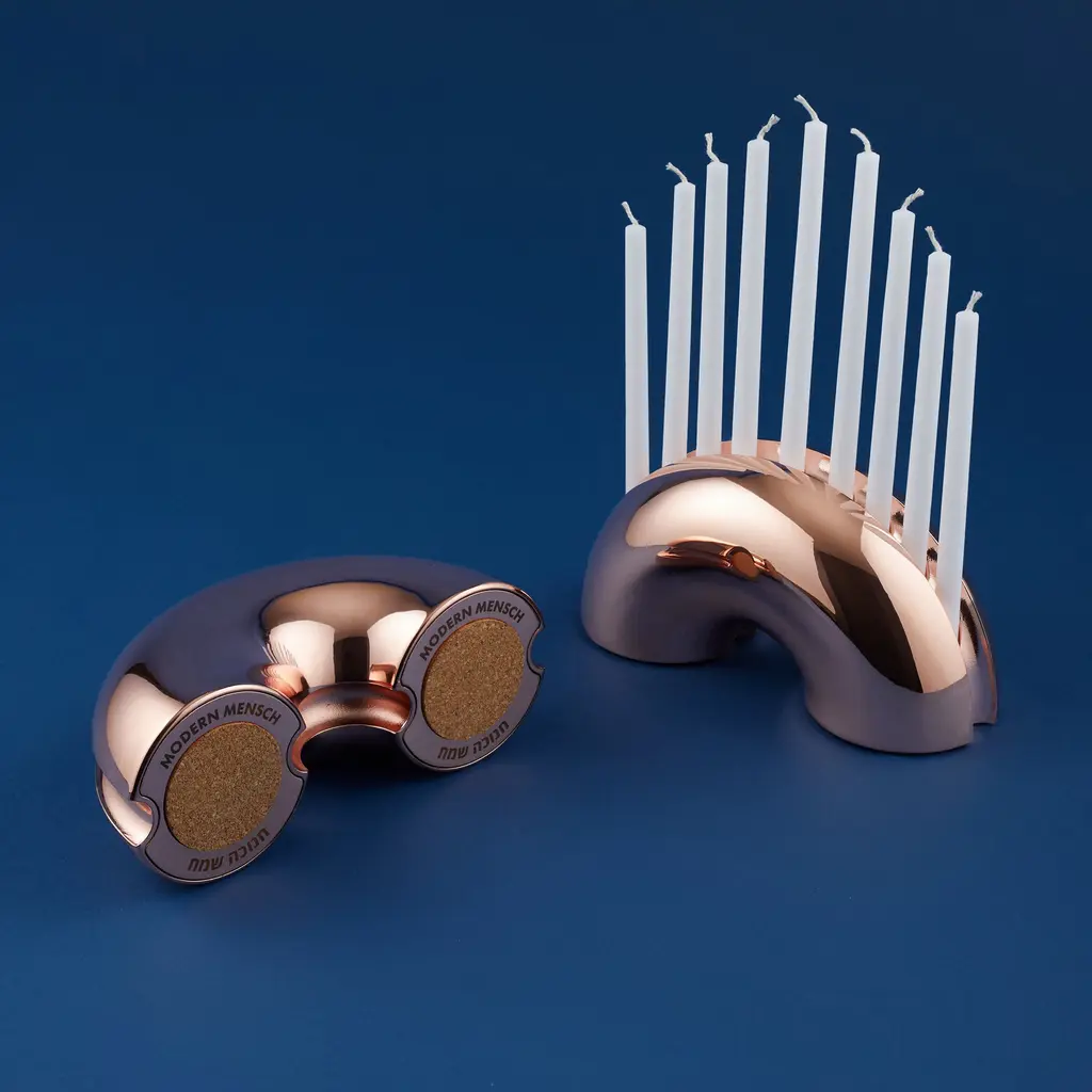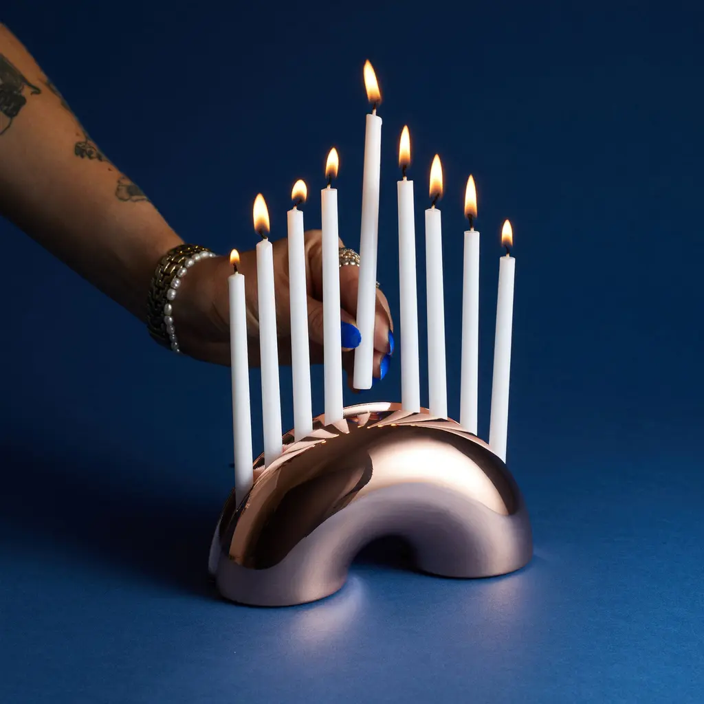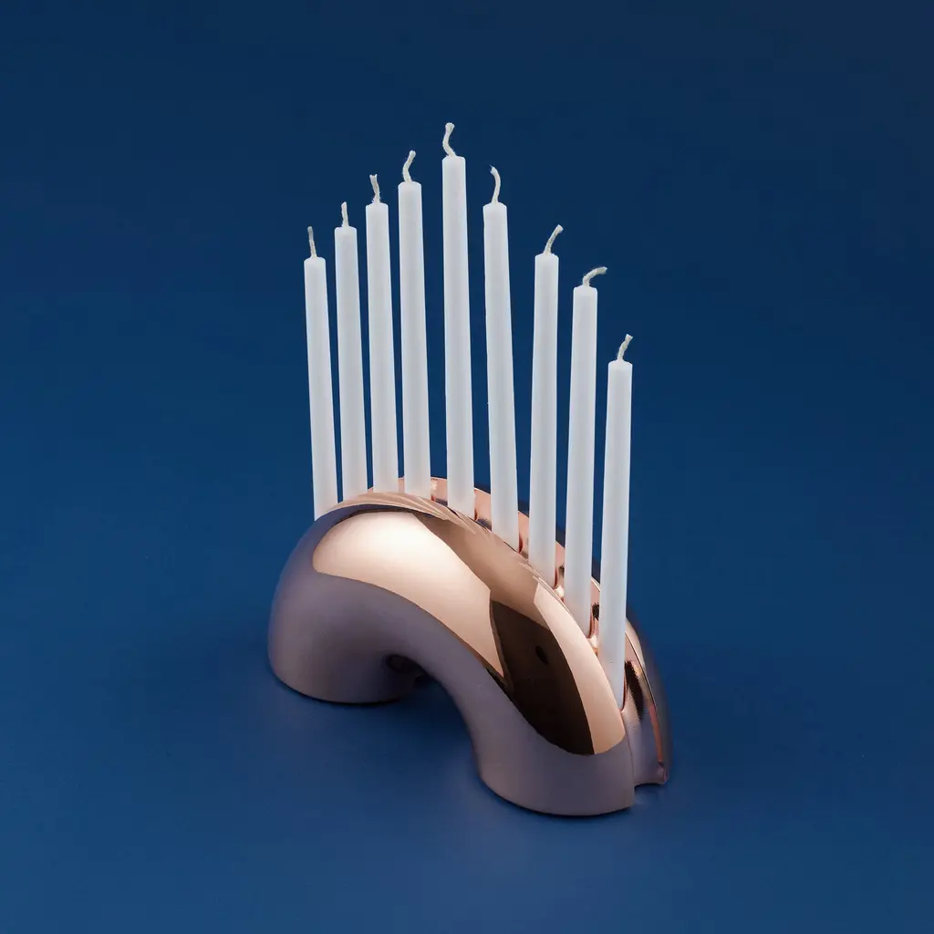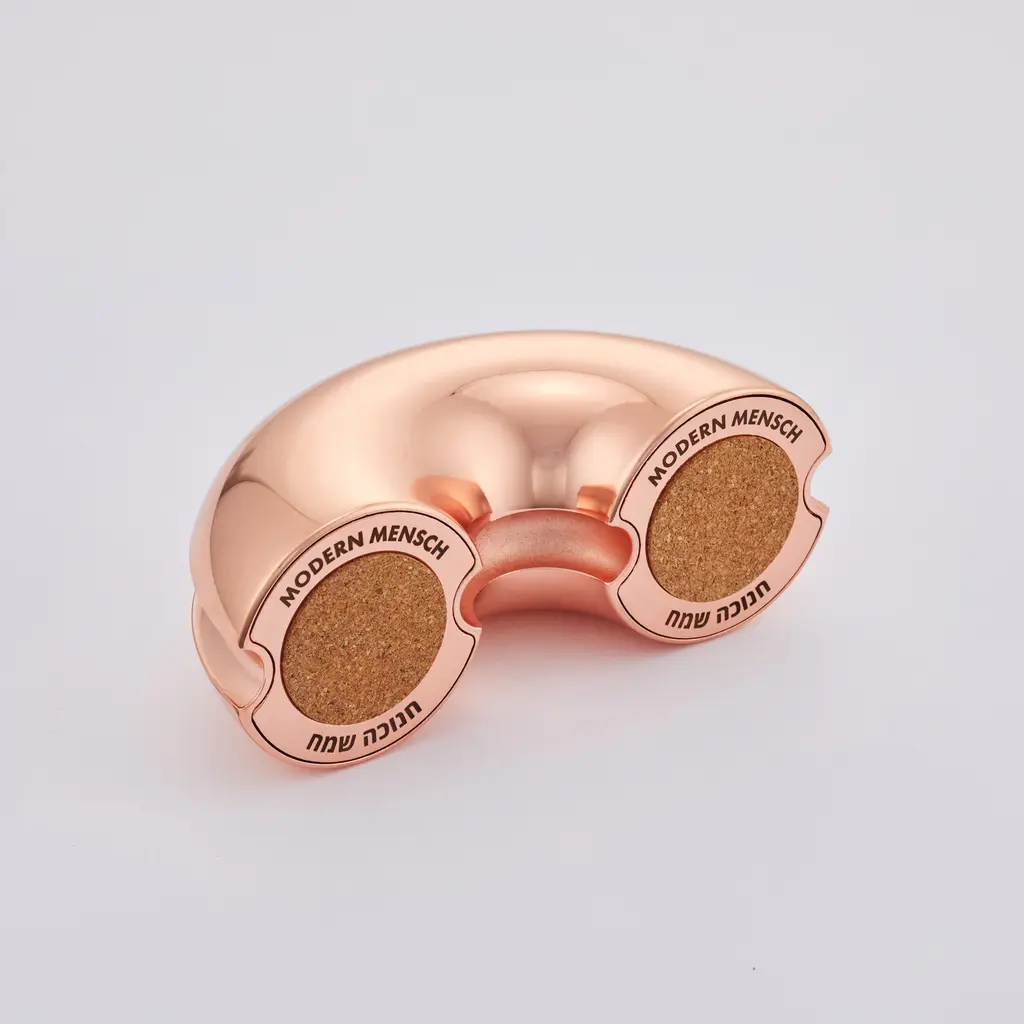 The Rose Gold Nosh Menorah showcases exceptional craftsmanship, crafted from premium metal and meticulously plated to achieve a stunning mirrored finish. To ensure stability, each of its two feet is thoughtfully furnished with a gentle cork pad. Drawing inspiration from a cherished Jewish culinary delight, the bagel, this rose gold menorah is designed to radiate its brilliance in your home, whether adorned with candles throughout the traditional eight nights or as an elegant decorative piece.