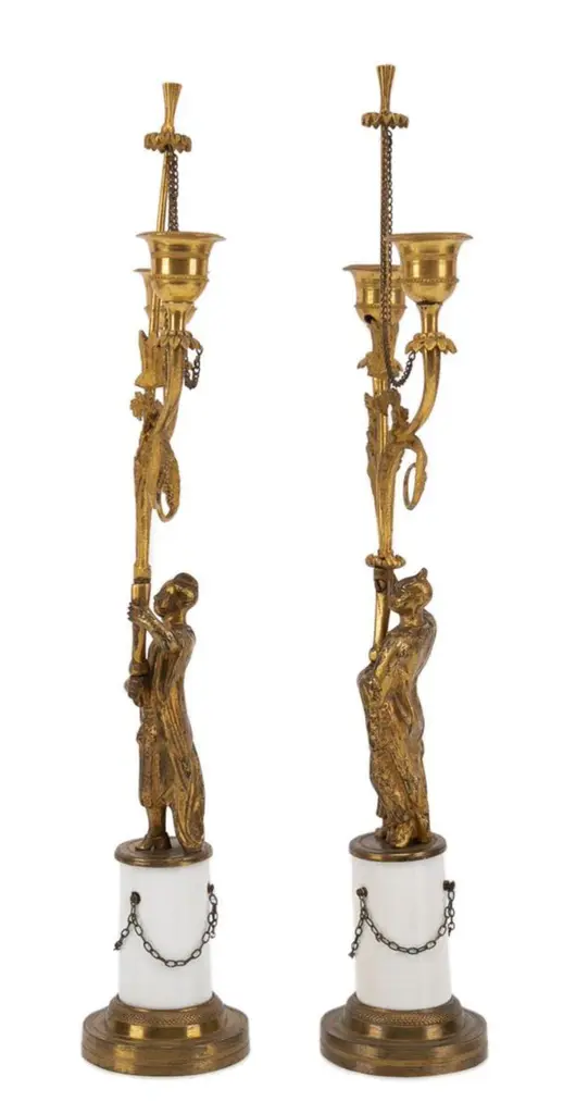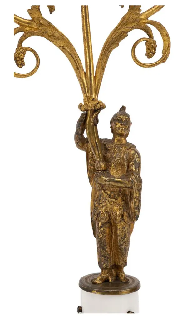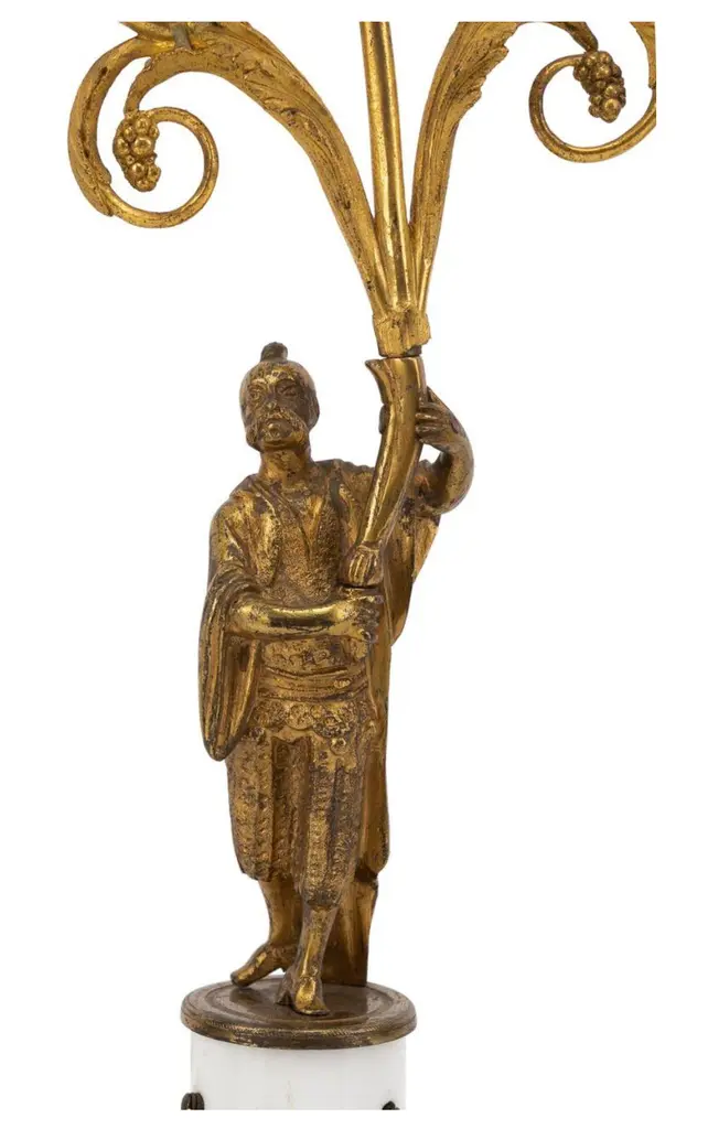 A beautiful and graceful pair of Regency gilt bronze and marble candelabras. Made in the Early 19th Century.