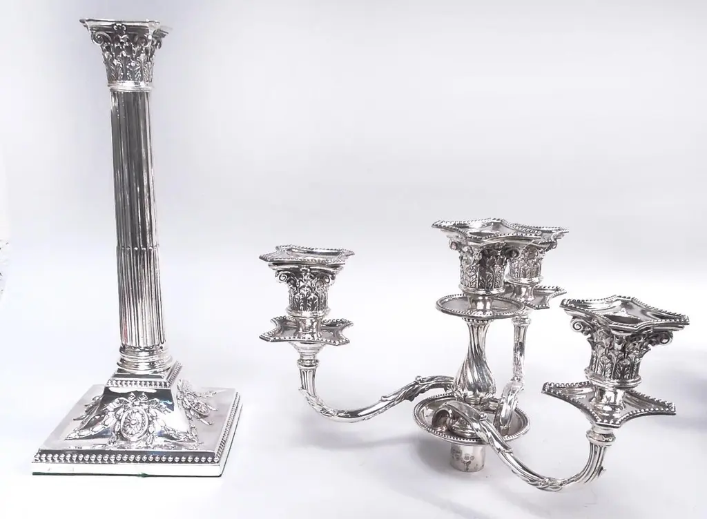 Pair of English Victorian Neoclassical sterling silver 4-light candelabra. Made by Hawksworth, Eyre & Co Ltd in Sheffield in 1882. Each: Central Corinthian capital socket mounted to round wax pan in turn mounted to baluster with twisted fluting; disc support also mounted with 3 leaf-capped fluted arms, each terminating in same socket with chamfered and concave wax pan. Columnar shaft with same capital and stop fluting; raised square base with applied ribboned garlands and pendant flowers and paterae. Beading. Fully marked. Weighted.