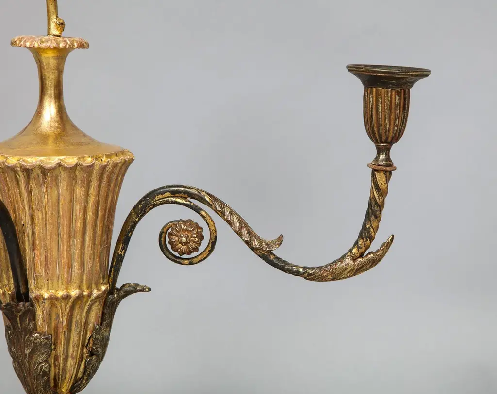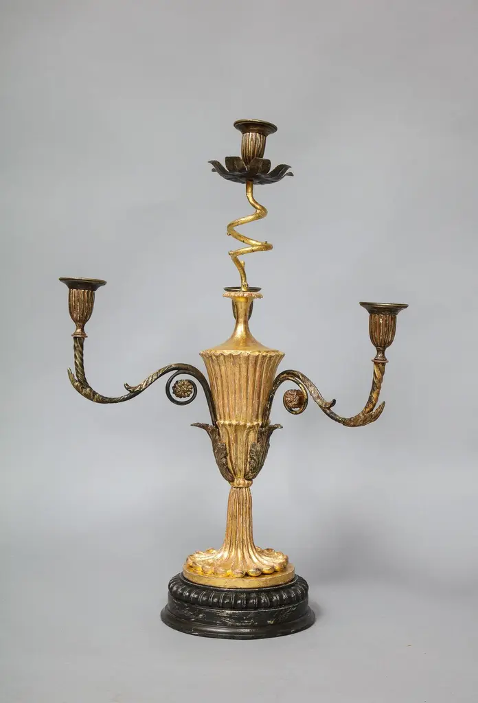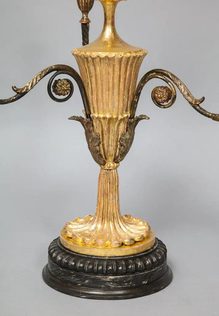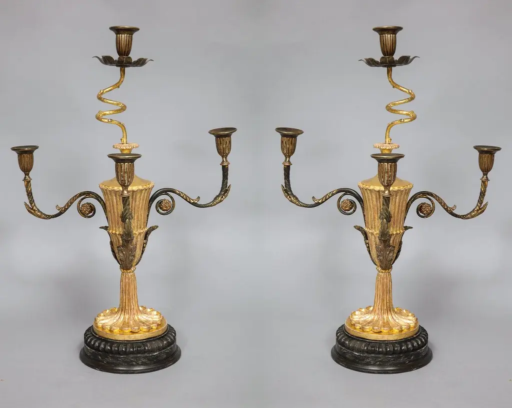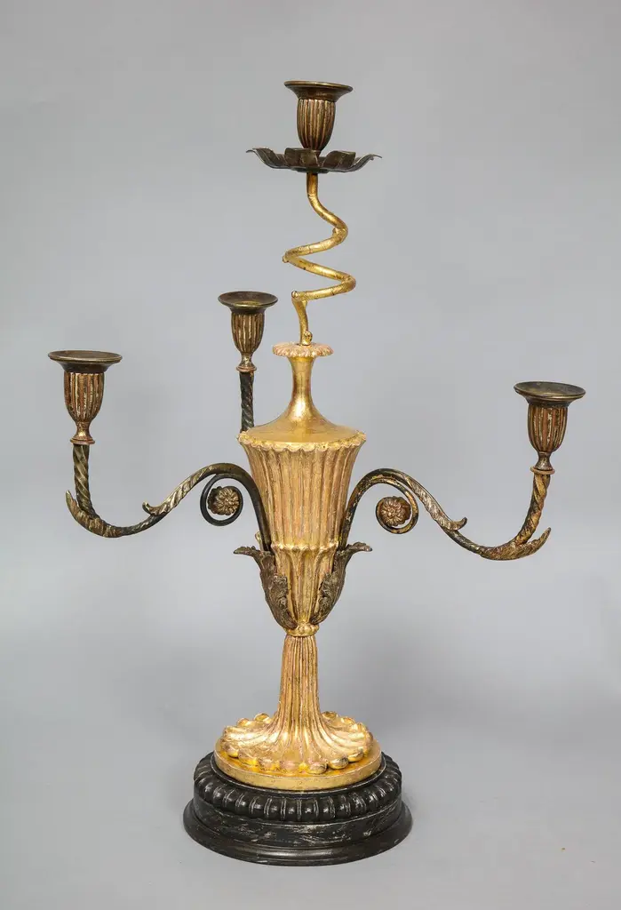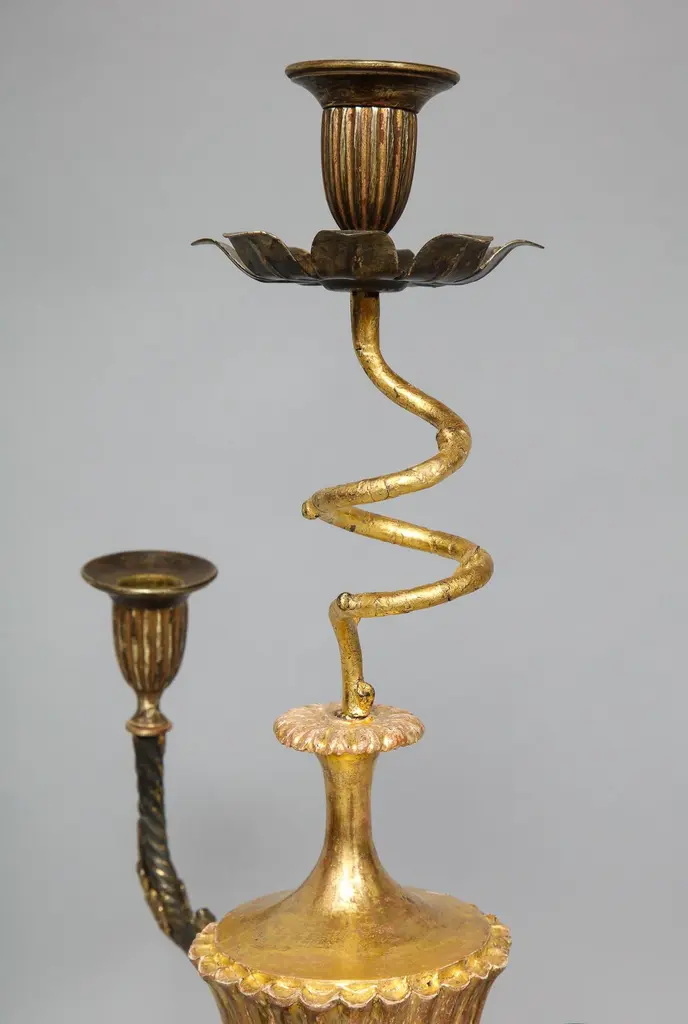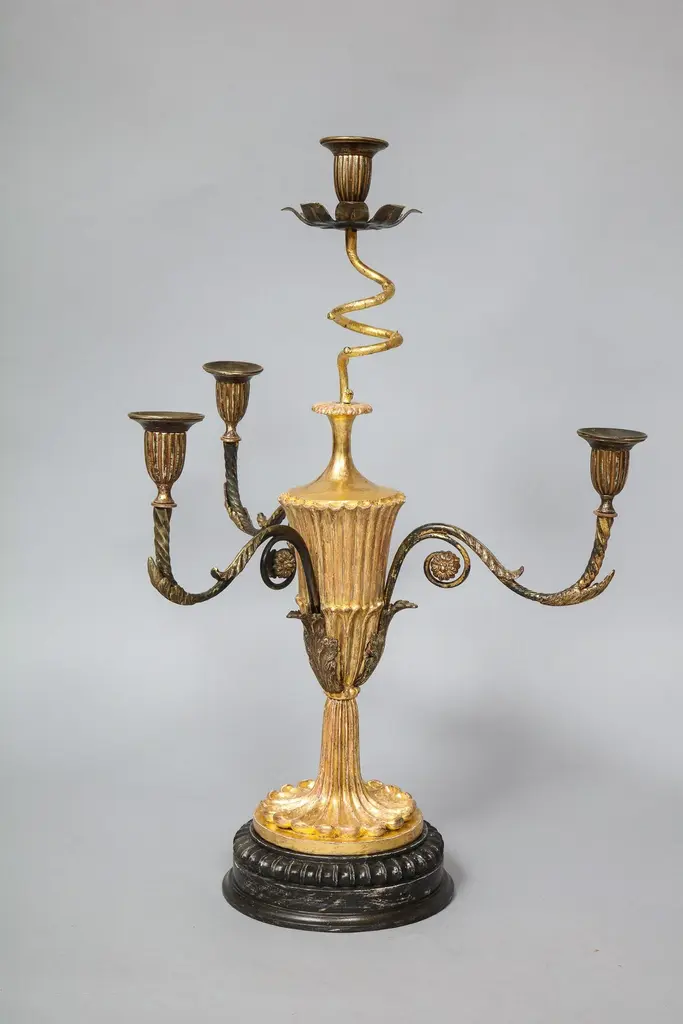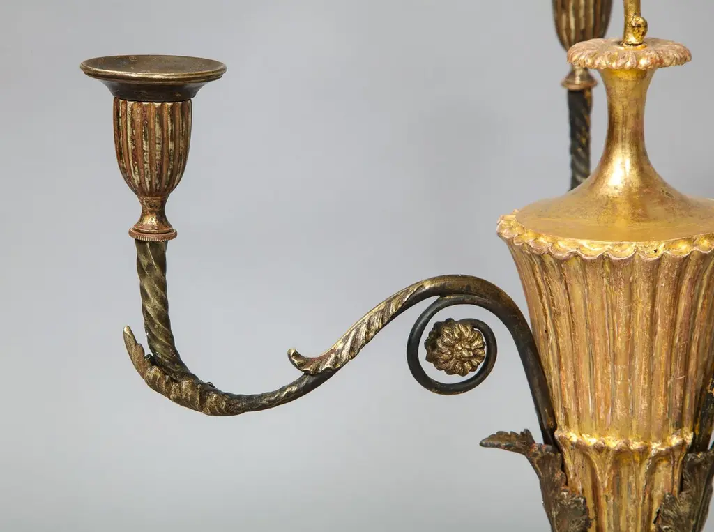 Fine pair of George III carved and giltwood candelabra in the manner of Thomas Chippendale the Younger, the four candle sockets with ribbed sides, the central arm with corkscrew shaft having later drip pan, the three side lights with fire gilt brass arms with foliate and scroll decoration, the central urn with ribbing and fluted stem standing on later gadrooned socle plinth bases. England, circa 1780.The ribbed brass candle sockets on this pair are identical to those on a pair of documented candelabra by Thomas Chippendale Jr. (illustrations 199 and 201 in Judith Goodison's "The Life and Work of Thomas Chippendale Junior" Philip Wilson Publishers 2017). The carving of central urns and honeysuckle motif stems relates to several known examples by Chippendale Sr. and Jr.