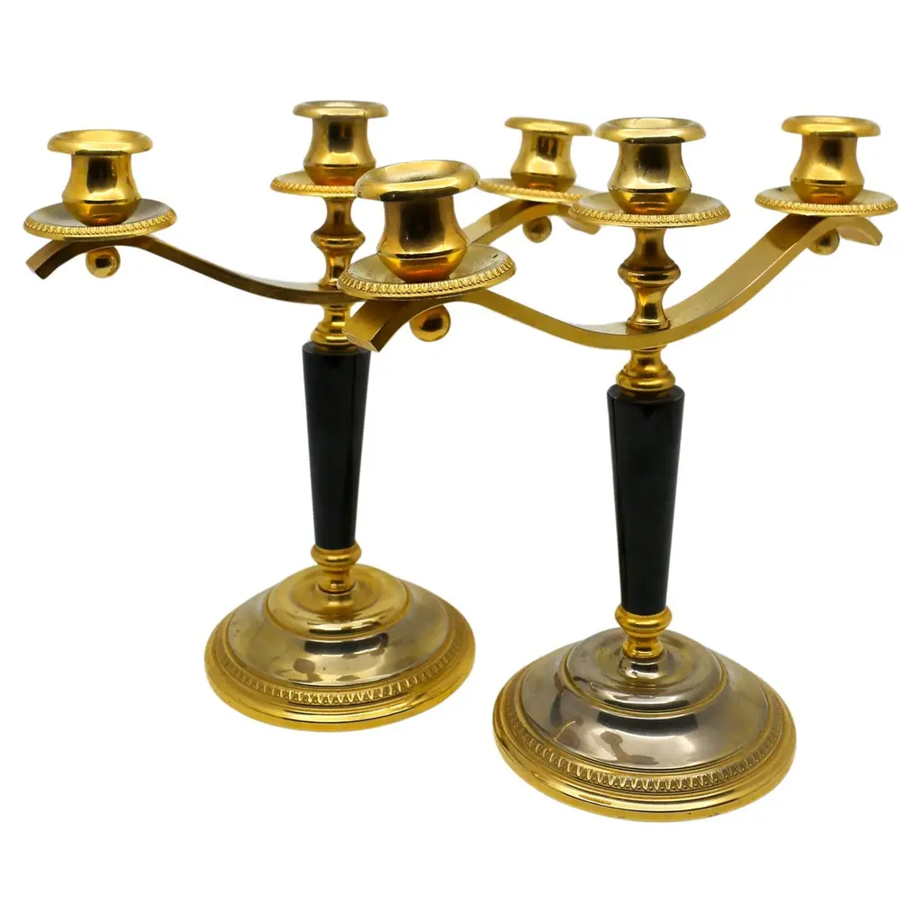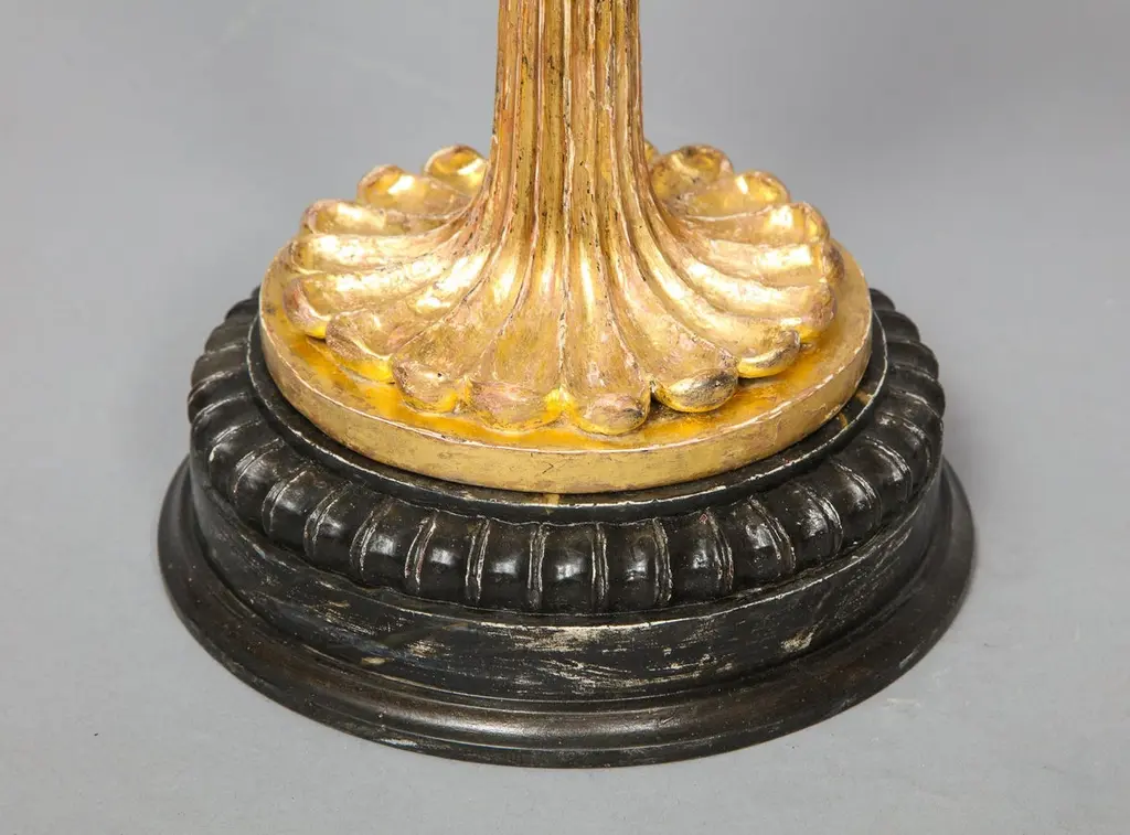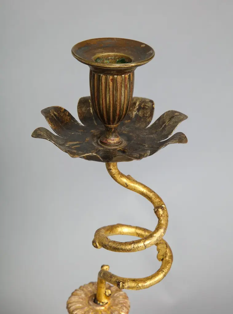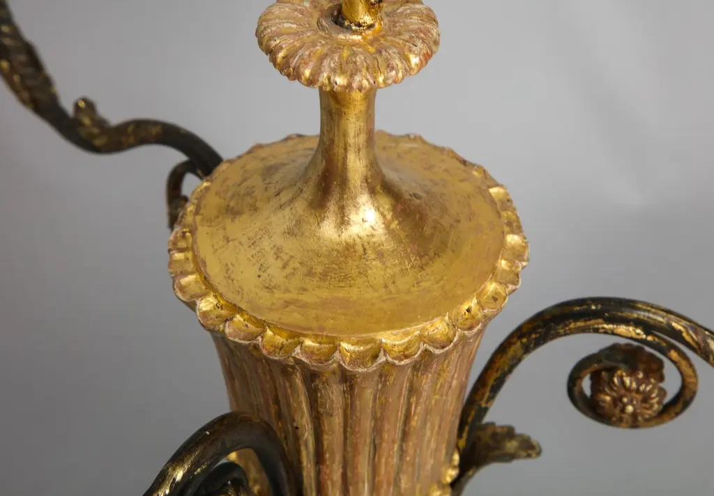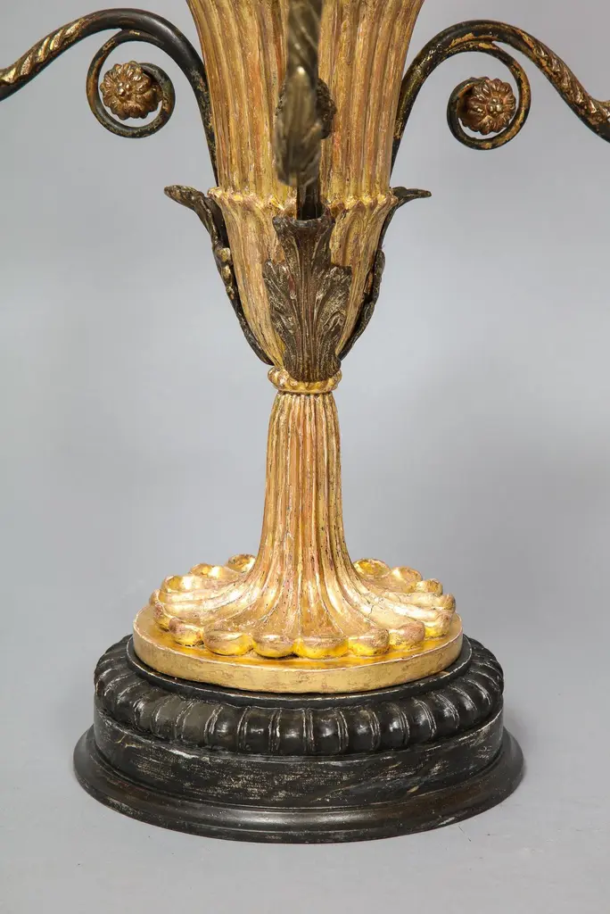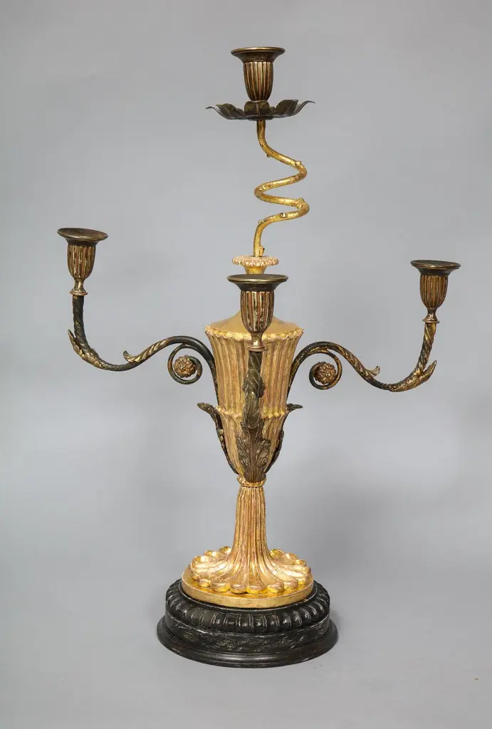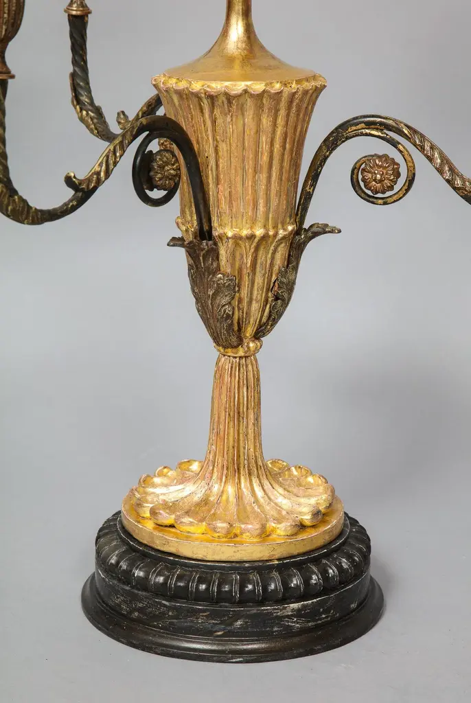 Fine pair of George III carved and giltwood candelabra in the manner of Thomas Chippendale the Younger, the four candle sockets with ribbed sides, the central arm with corkscrew shaft having later drip pan, the three side lights with fire gilt brass arms with foliate and scroll decoration, the central urn with ribbing and fluted stem standing on later gadrooned socle plinth bases. England, circa 1780.The ribbed brass candle sockets on this pair are identical to those on a pair of documented candelabra by Thomas Chippendale Jr. (illustrations 199 and 201 in Judith Goodison's "The Life and Work of Thomas Chippendale Junior" Philip Wilson Publishers 2017). The carving of central urns and honeysuckle motif stems relates to several known examples by Chippendale Sr. and Jr.