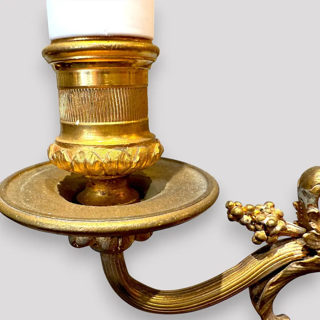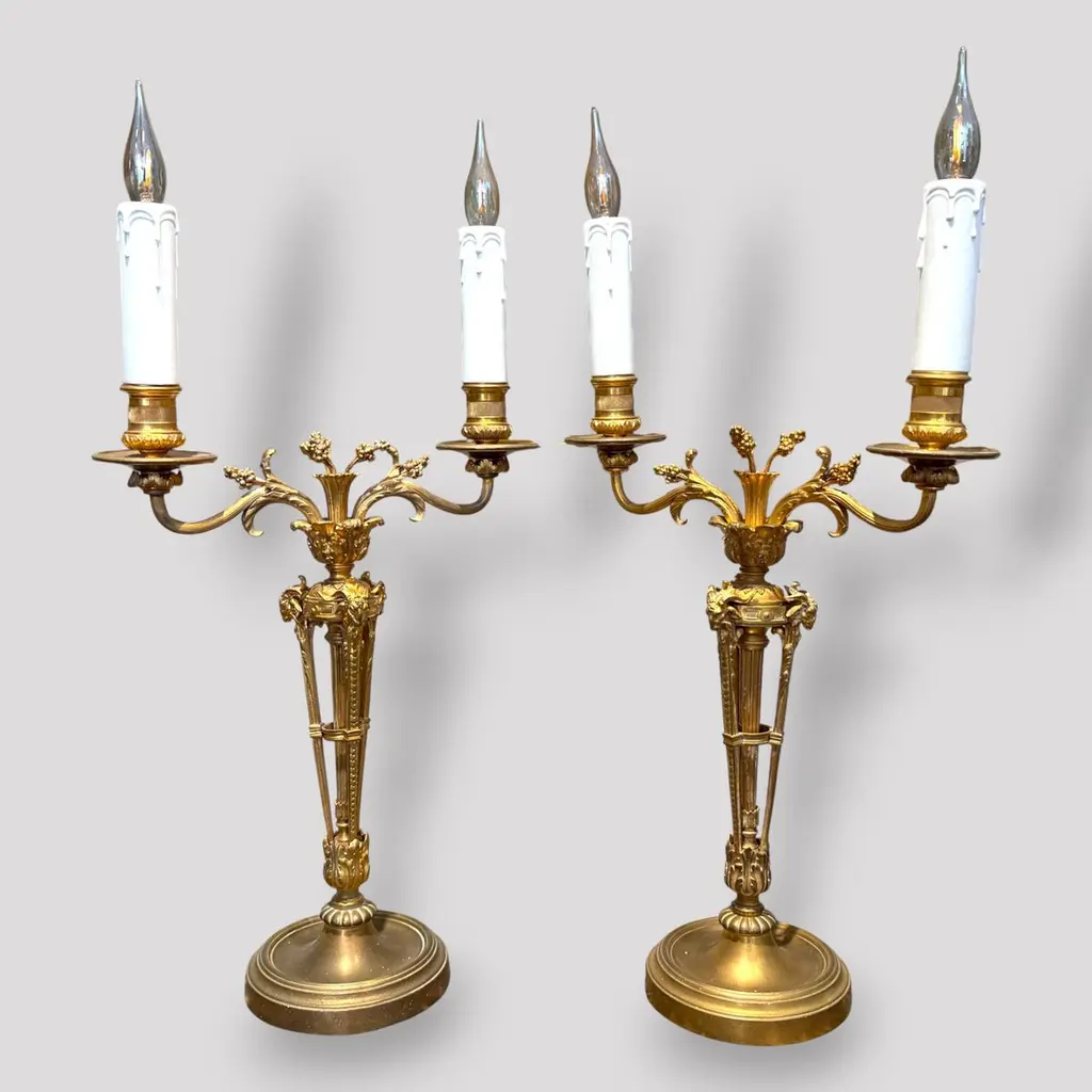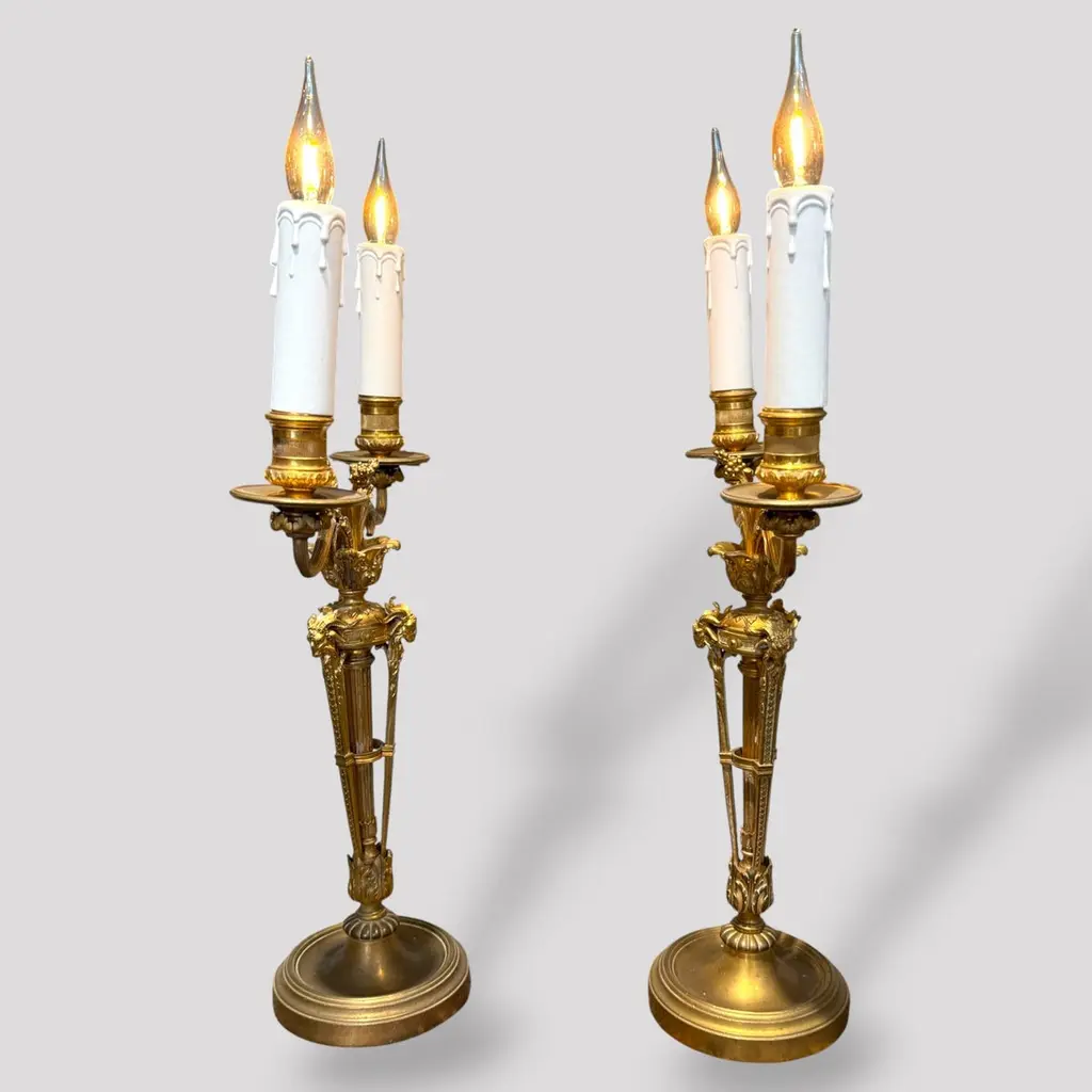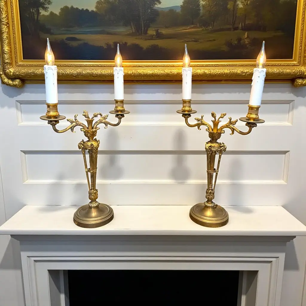 A pair of gilt bronze candelabra lamps, elegantly transformed into electric lighting while preserving their timeless grandeur. Each piece is masterfully crafted with intricate neoclassical detailing, featuring gracefully scrolled arms, delicate foliate ornamentation, and finely chased motifs that embody refined sophistication. The bases are richly decorated with classical embellishments, lending a sense of balance and harmony to their slender, sculptural form. The faux candle sleeves with dripping wax design and flame-shaped bulbs add a warm, atmospheric glow, perfectly evoking the romantic allure of candlelight while offering modern functionality. These lamps exude an aura of opulence and distinction, making them a superb addition to both traditional and eclectic interiors, whether placed upon a console, mantel, or sideboard to enrich the ambience with understated luxury.