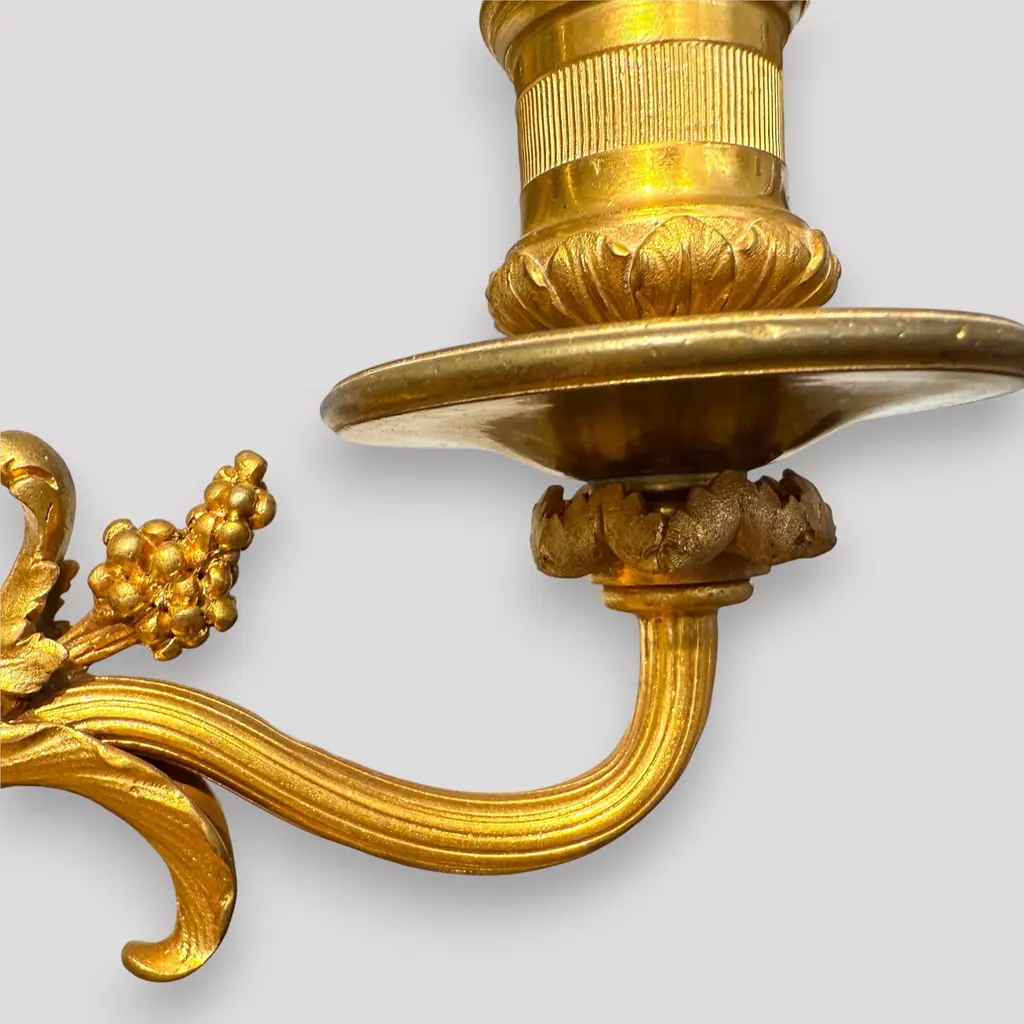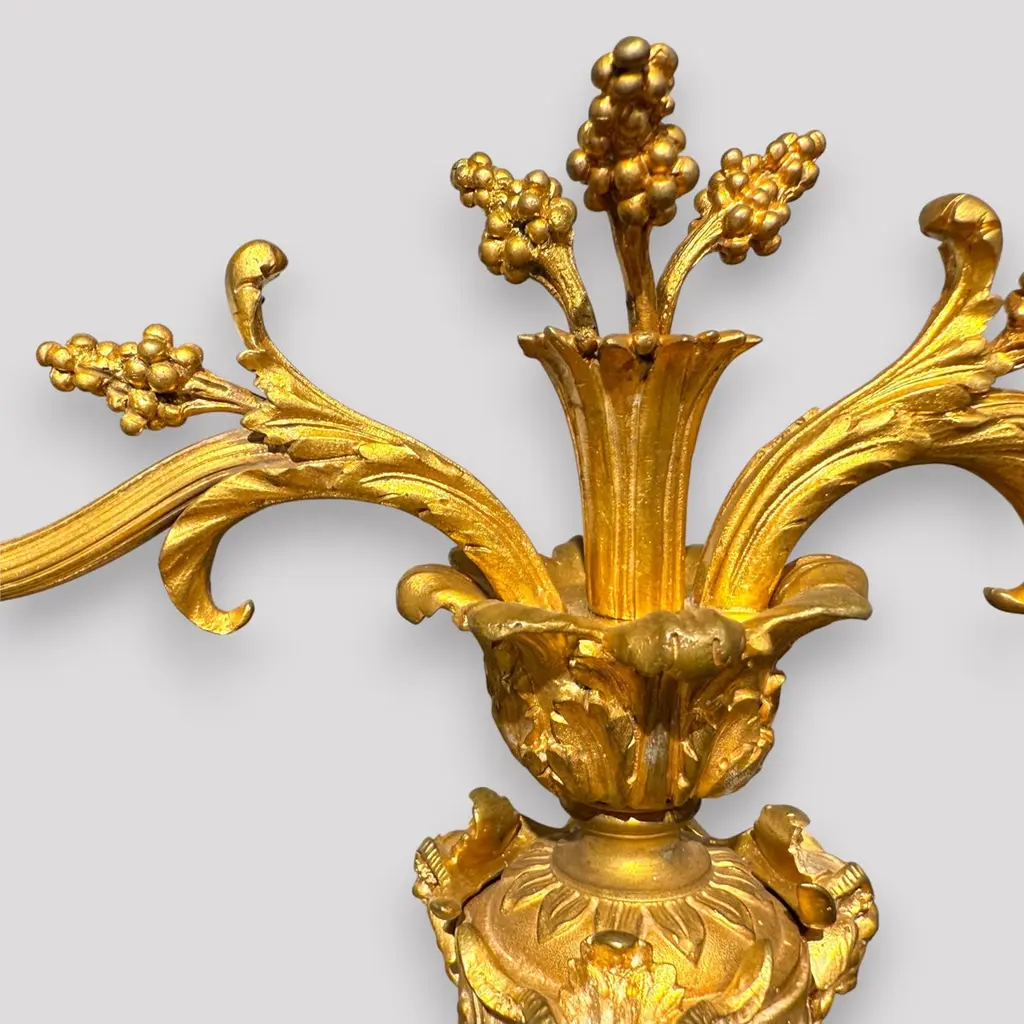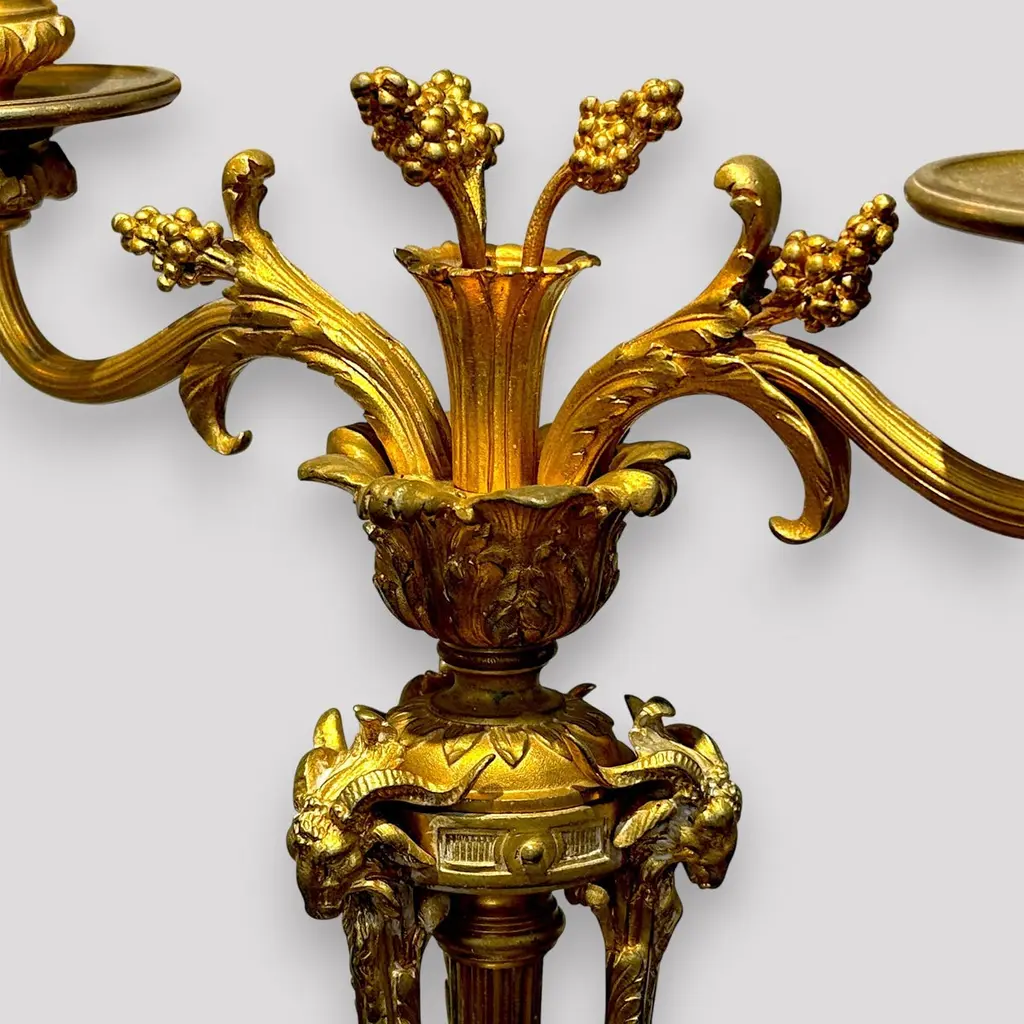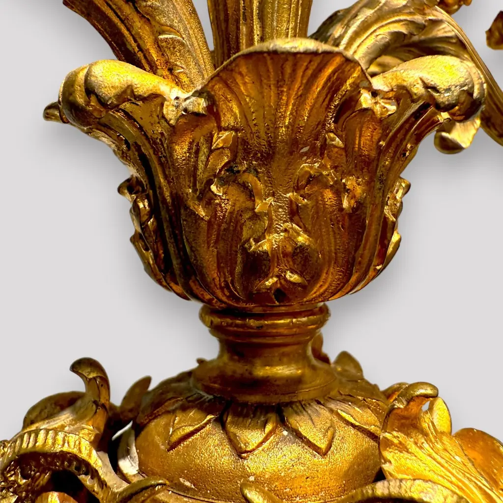 A pair of gilt bronze candelabra lamps, elegantly transformed into electric lighting while preserving their timeless grandeur. Each piece is masterfully crafted with intricate neoclassical detailing, featuring gracefully scrolled arms, delicate foliate ornamentation, and finely chased motifs that embody refined sophistication. The bases are richly decorated with classical embellishments, lending a sense of balance and harmony to their slender, sculptural form. The faux candle sleeves with dripping wax design and flame-shaped bulbs add a warm, atmospheric glow, perfectly evoking the romantic allure of candlelight while offering modern functionality. These lamps exude an aura of opulence and distinction, making them a superb addition to both traditional and eclectic interiors, whether placed upon a console, mantel, or sideboard to enrich the ambience with understated luxury.