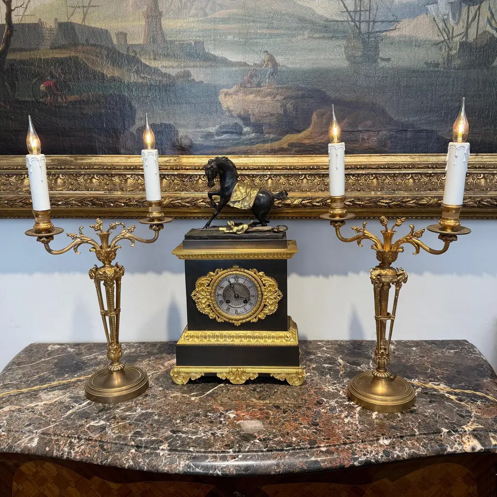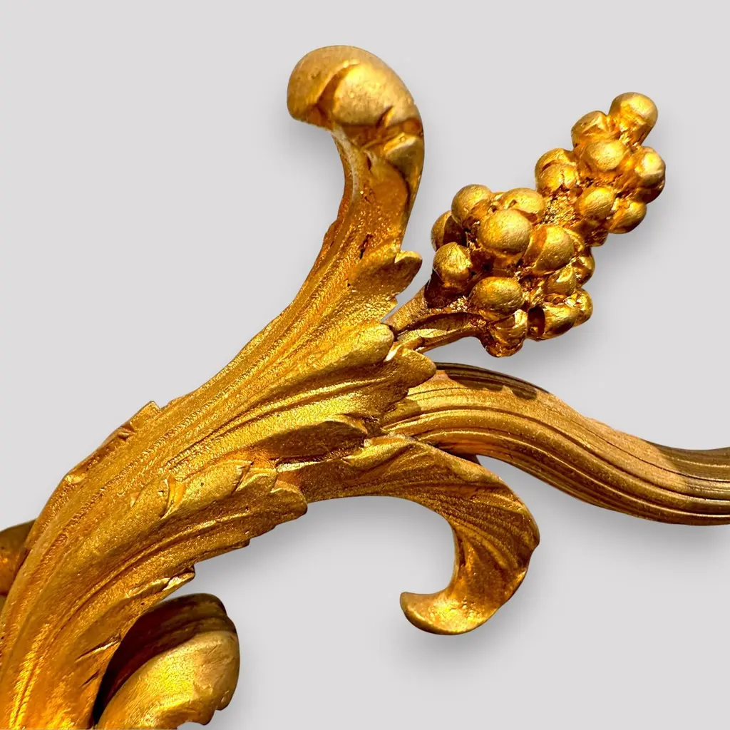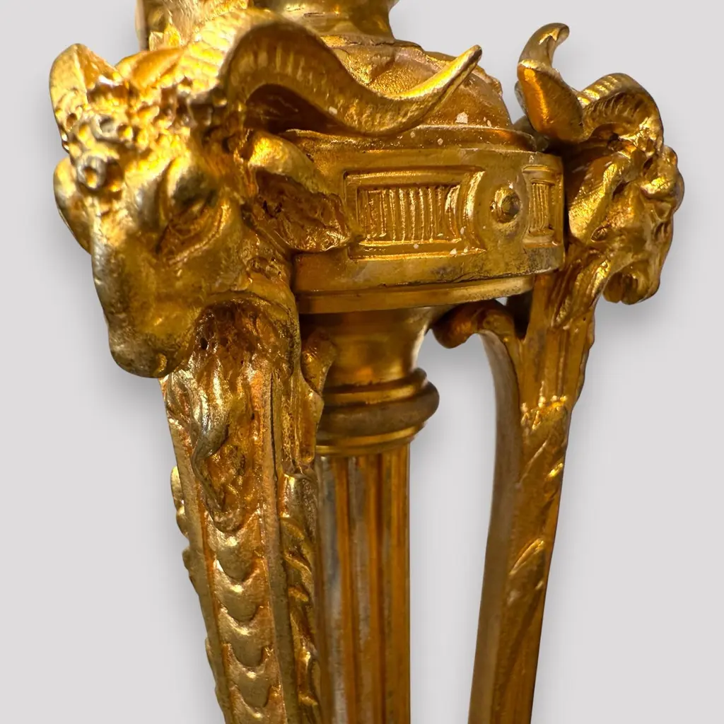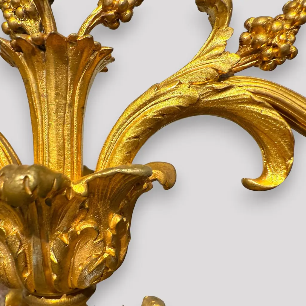 A pair of gilt bronze candelabra lamps, elegantly transformed into electric lighting while preserving their timeless grandeur. Each piece is masterfully crafted with intricate neoclassical detailing, featuring gracefully scrolled arms, delicate foliate ornamentation, and finely chased motifs that embody refined sophistication. The bases are richly decorated with classical embellishments, lending a sense of balance and harmony to their slender, sculptural form. The faux candle sleeves with dripping wax design and flame-shaped bulbs add a warm, atmospheric glow, perfectly evoking the romantic allure of candlelight while offering modern functionality. These lamps exude an aura of opulence and distinction, making them a superb addition to both traditional and eclectic interiors, whether placed upon a console, mantel, or sideboard to enrich the ambience with understated luxury.