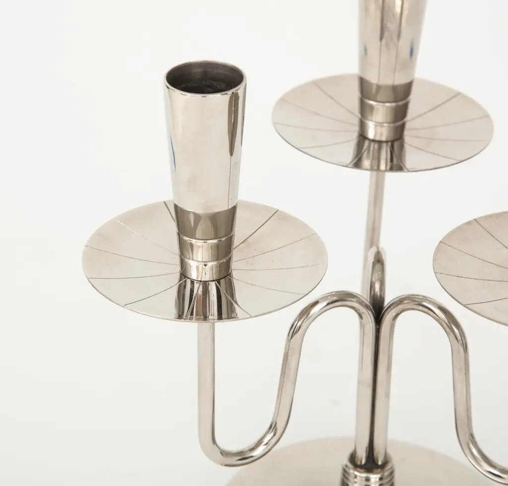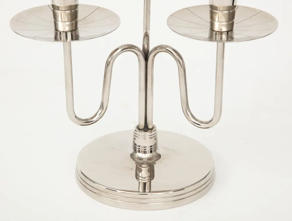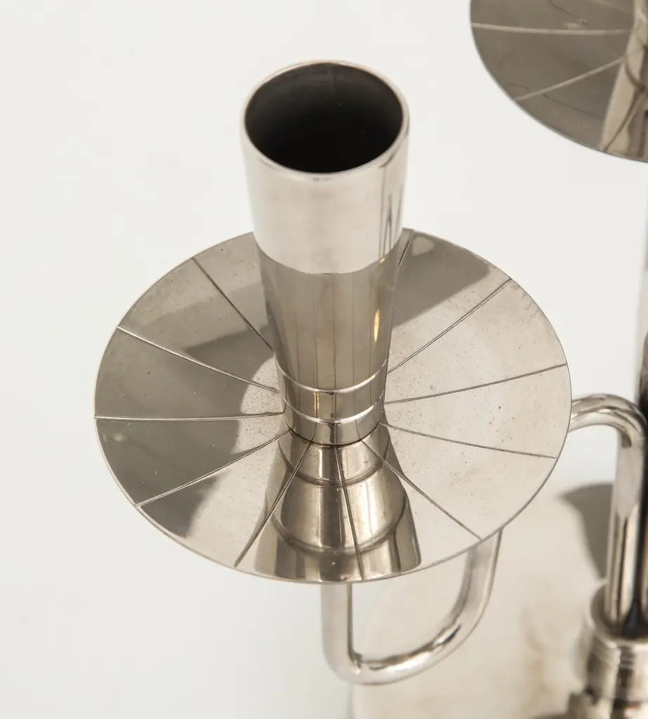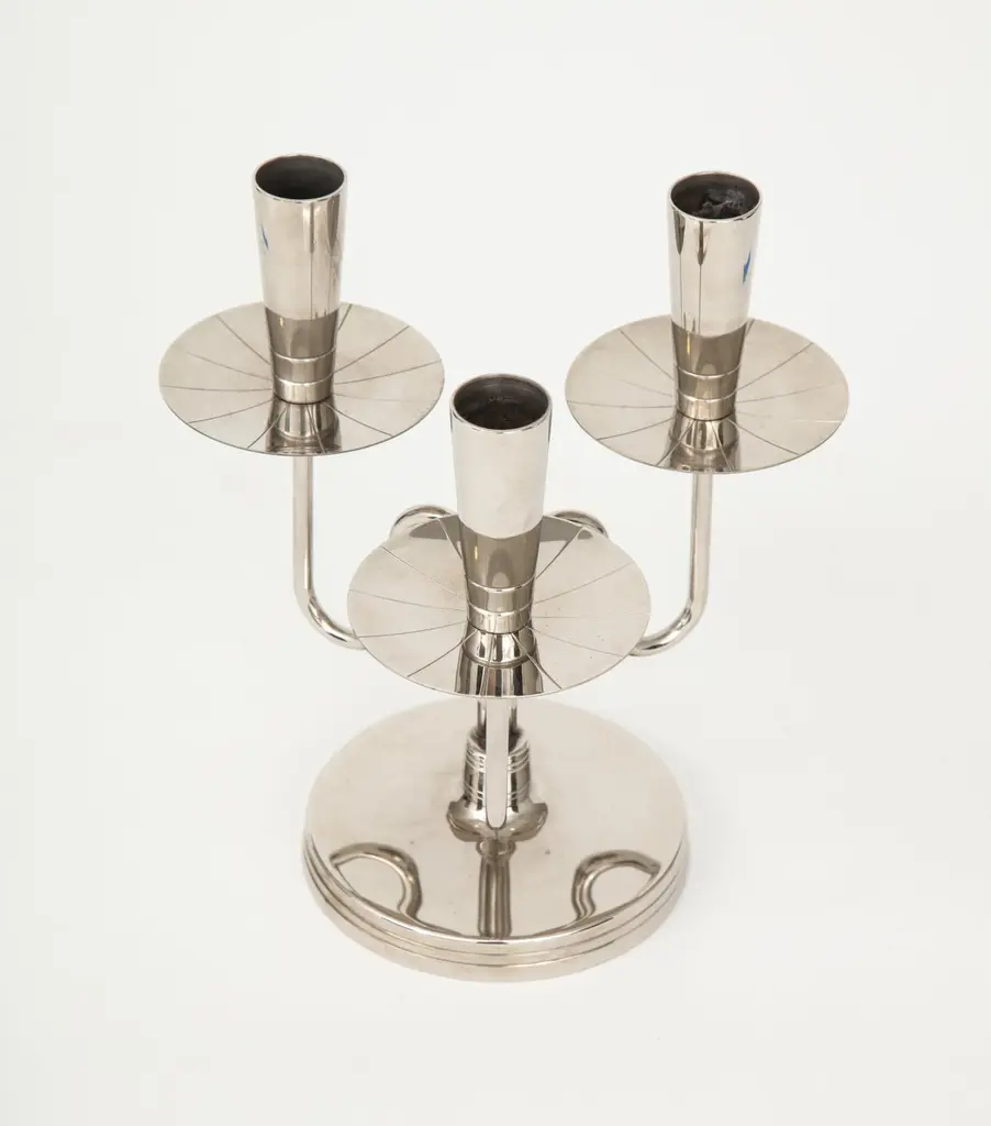 Midcentury elegant and Classic 3-arm polished nickel candelabras designed by Tommi Parzinger for Dorlyn Silversmiths. Professionally plated and polished.