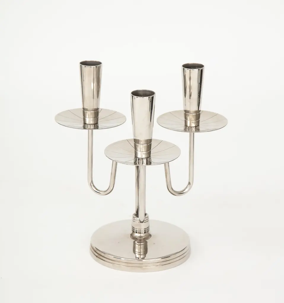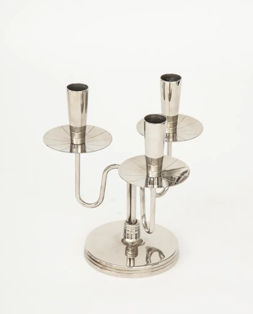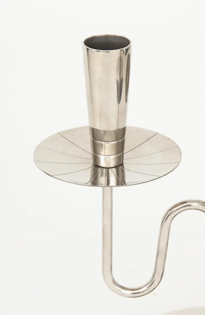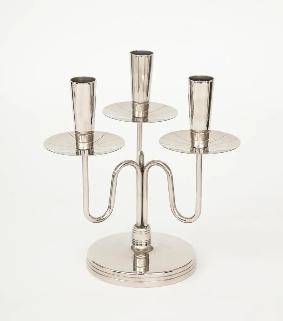 Midcentury elegant and Classic 3-arm polished nickel candelabras designed by Tommi Parzinger for Dorlyn Silversmiths. Professionally plated and polished.