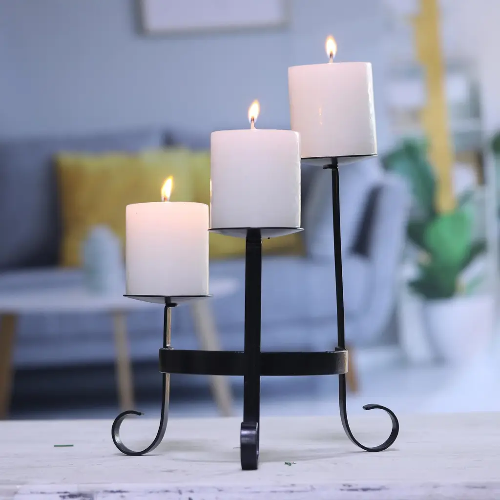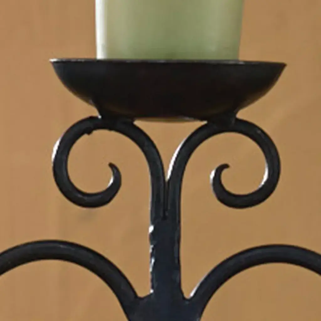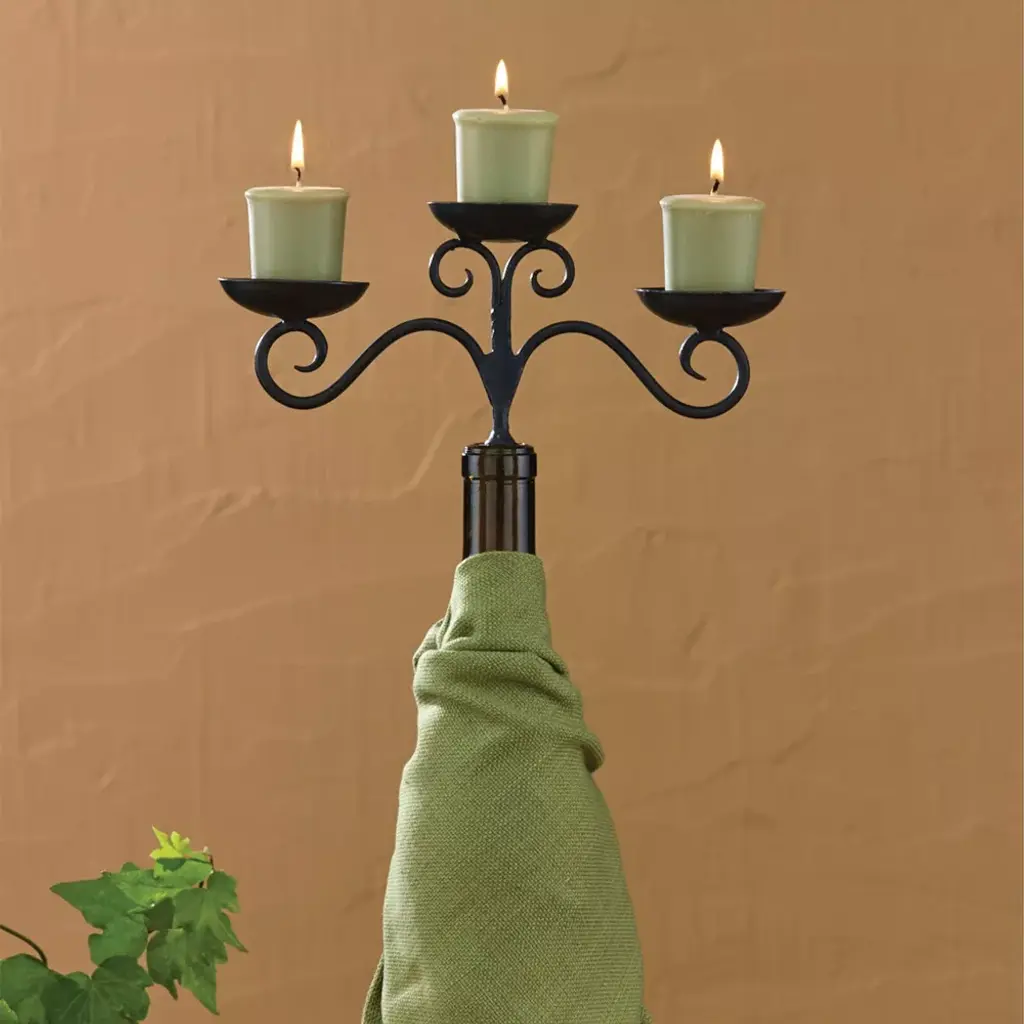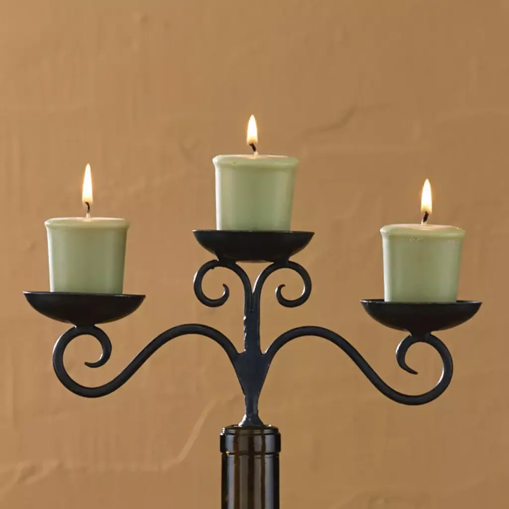 The Wine Bottle Topper features forged iron scroll design holds 3 votive candles with a beautiful smooth black powder coated finish. Create a bold statement piece for your table using an old bottle, transforming it into a beautiful decoration. Rubber stopper at the base for easy placement into the top of any wine bottle. Perfect for your farmhouse or country home decor.