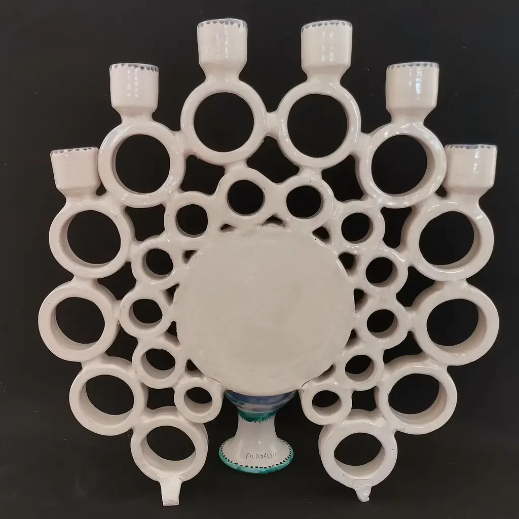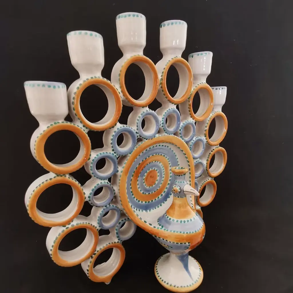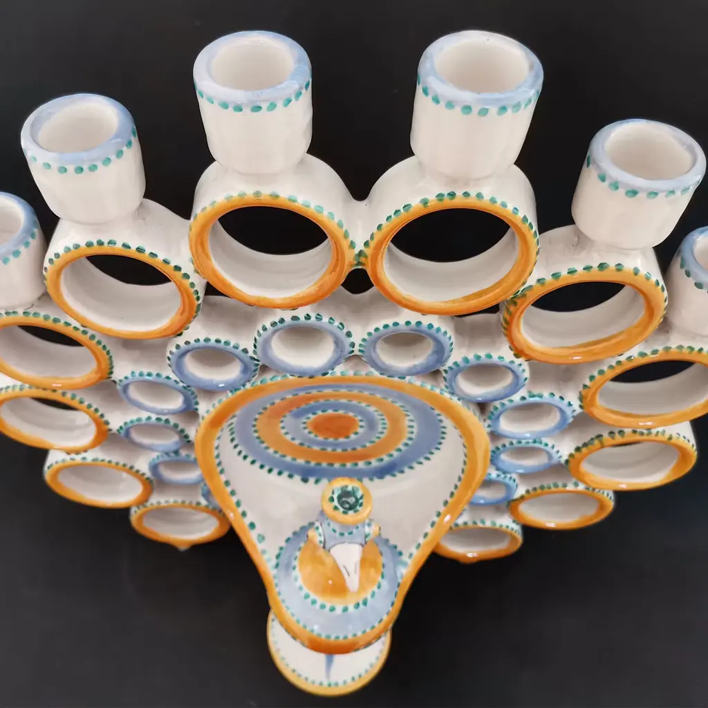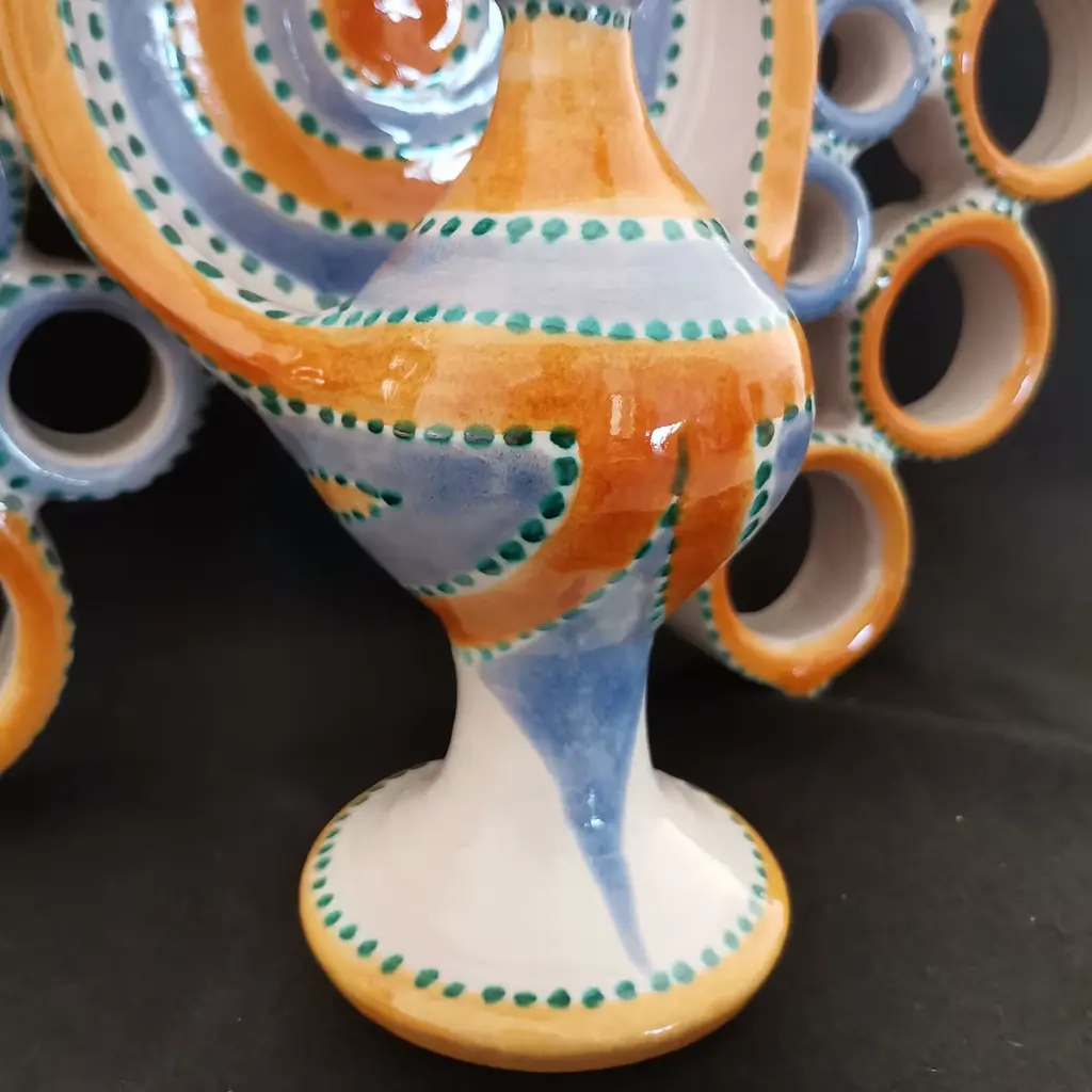 Culminating in six slots where to arrange as many candles, this ceramic candelabra is a true show-stopper with its spectacular peacock-like design. Vivid shades of azure and orange at once enhance its inspiration and workmanship, which can be admired in the triumph of radially arranged rings artfully recreating a peacock's open tail. Other color options are available in the Artemest catalog.