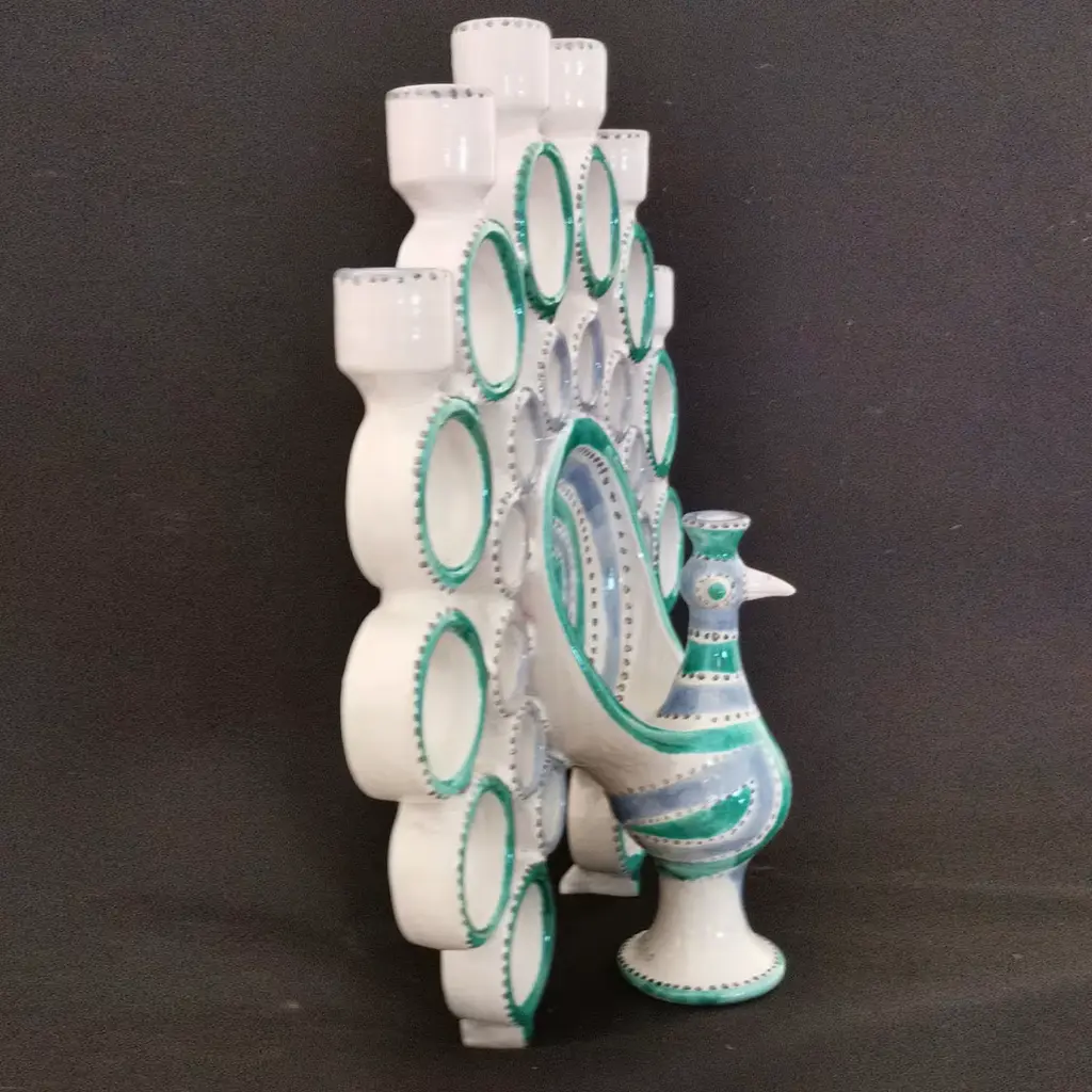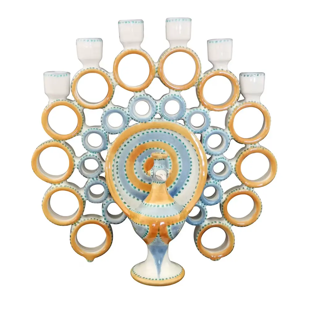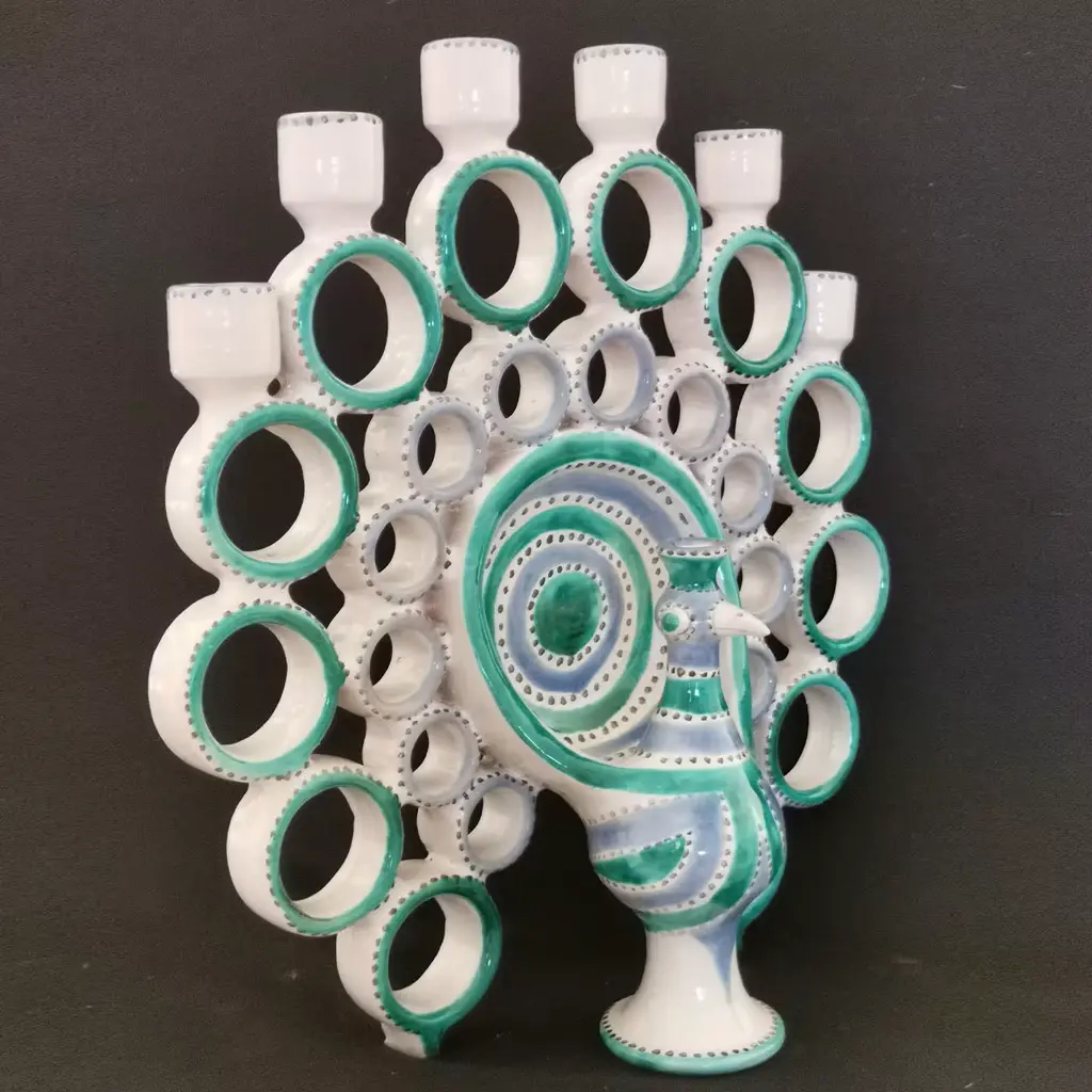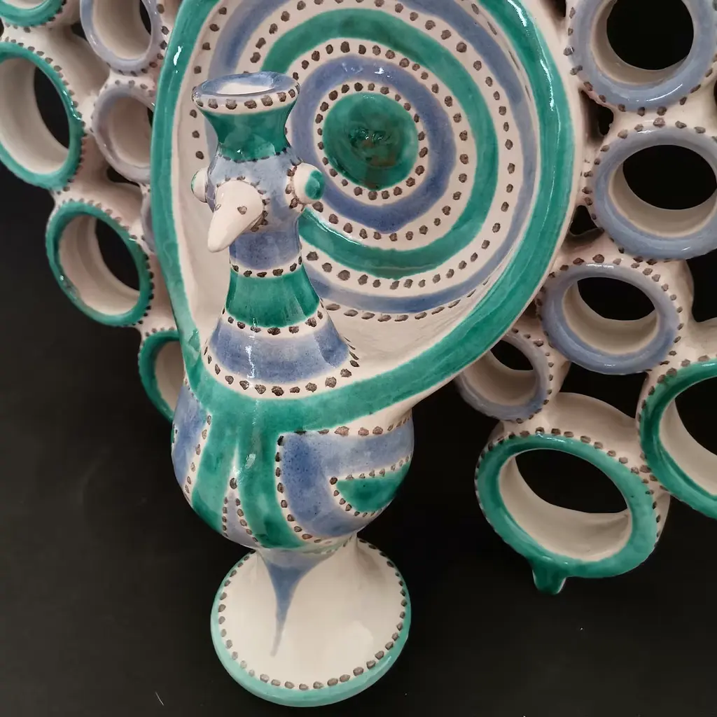 Eccentric and colorful, this ceramic candelabra strikes with its silhouette playfully recreating an open-tail peacock. A masterful artisan process ranging from turning to decoration ensures the entire uniqueness of every single piece, which hypnotizes with its radially-arranged turned rings enhanced by vibrant turquoise and azure traits.