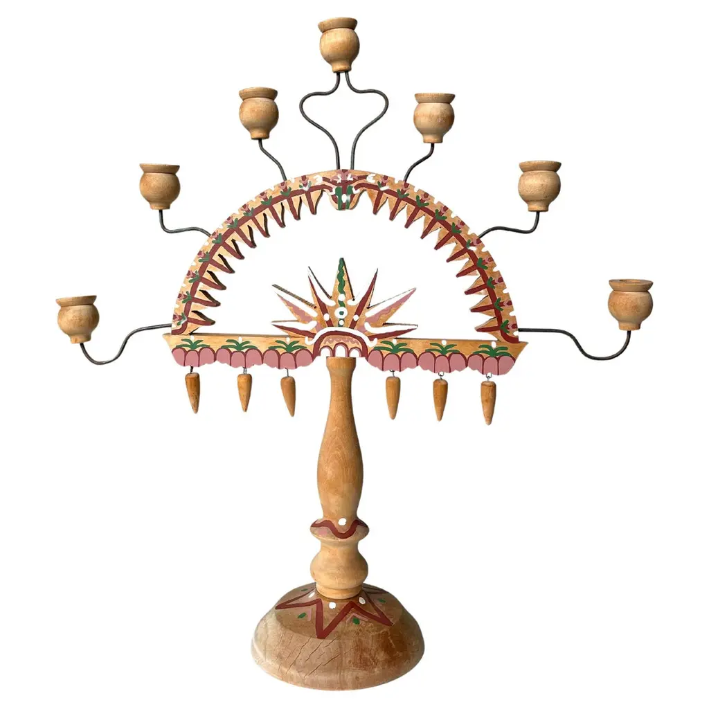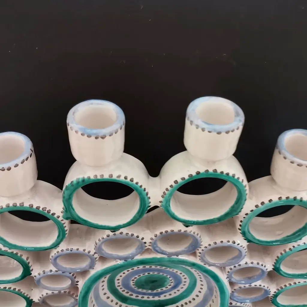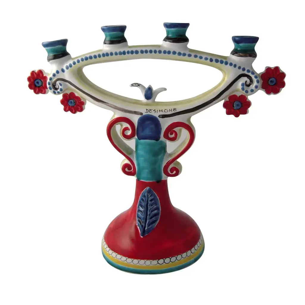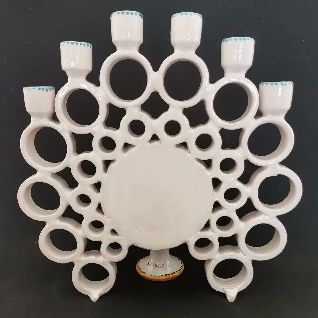 Eccentric and colorful, this ceramic candelabra strikes with its silhouette playfully recreating an open-tail peacock. A masterful artisan process ranging from turning to decoration ensures the entire uniqueness of every single piece, which hypnotizes with its radially-arranged turned rings enhanced by vibrant turquoise and azure traits.