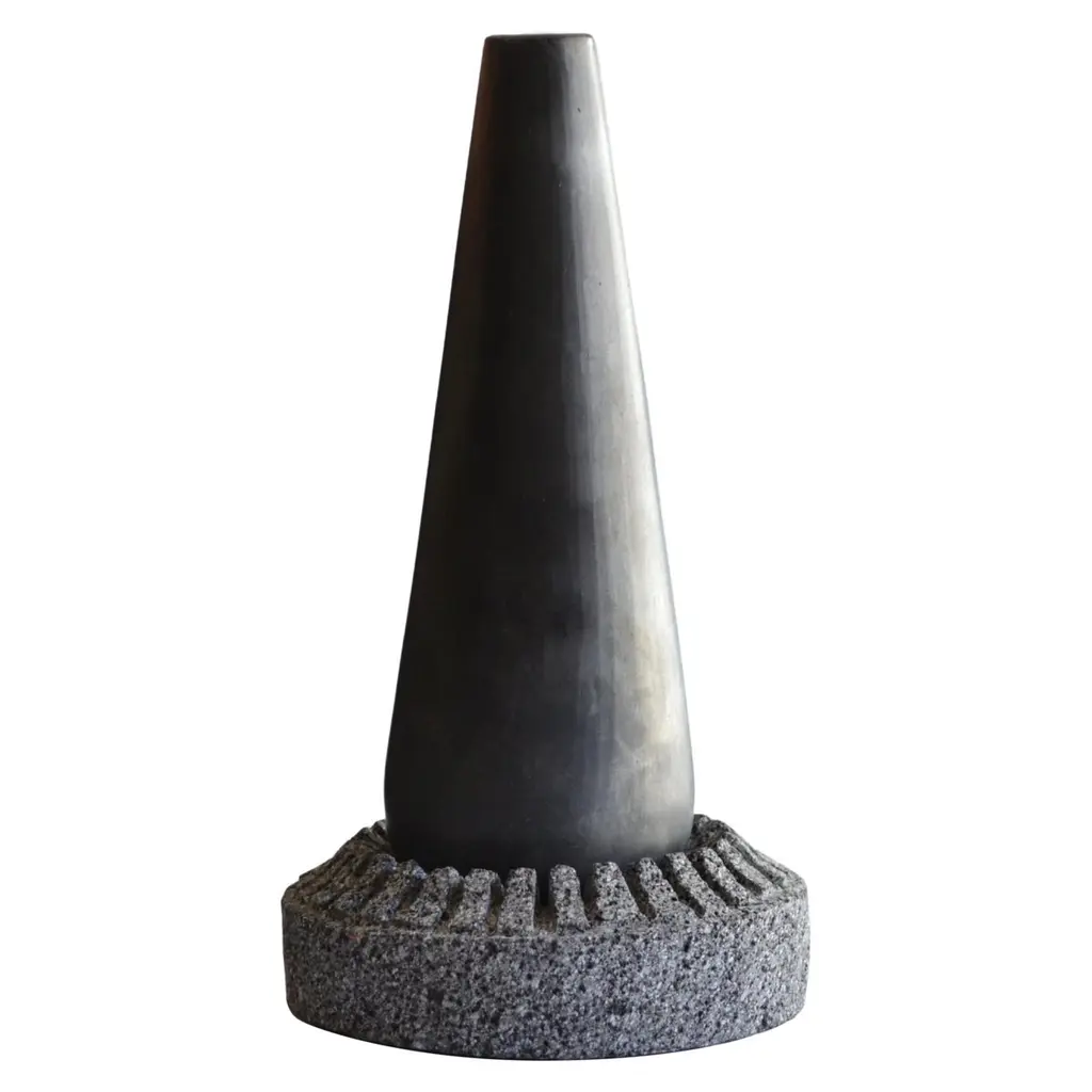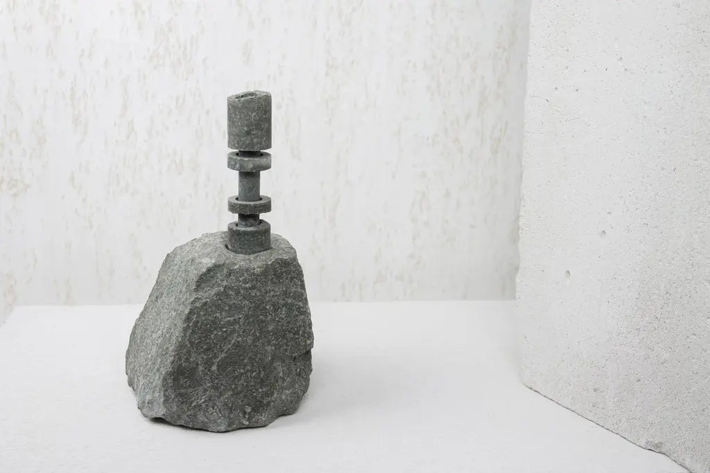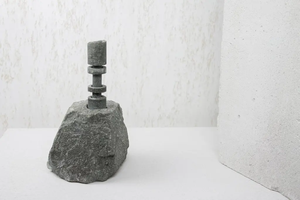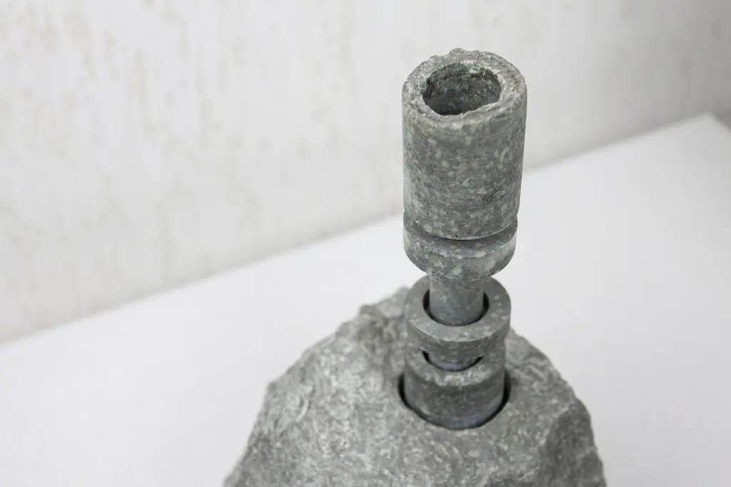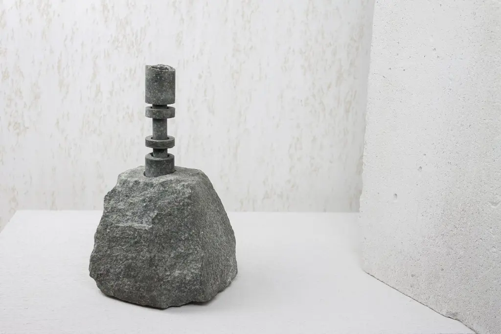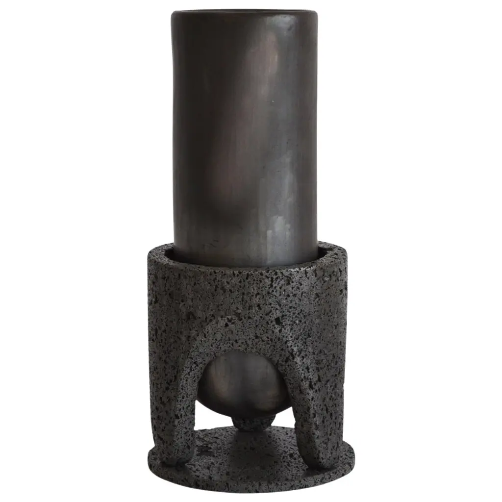 Porfier Abra Candelabra by Studio DODimensions: D 14 x W 13 x H 25.5 cmMaterials: Stone, aluminum.5.7 kg.Stone and fire are connected in an ageless bond. A sparkle created by clashing two stones with each other has been igniting fire over centuries. At the same time stones are used to safely border campfires. The warmth of the stone and intimate flame, reflect here on our interior environment. The classical shapes of candle holders are brought to light by extracting it from the core of a stone. Set in a 21st-century interpretation, it connects a timeless design type with a primitive appearing but contemporary driven technology.Based in Antwerp, Studio DO is a stone cutting atelier founded by Dana Seachuga and Octave Vandeweghe. These two creatives work independently: Dana as a jewellery maker and Octave as an artist. For Studio DO they joined forces and share their creative visions and expertise. Driven by their affection for stone cutting, they research the material and cultural role of (gem)stones within the realm of functional objects. Using basic interventions, shapes and aesthetics, they try to search for the minimal action necessary to give a rock a (traditional) function.Studio DO works on design projects and takes commissions related to stone, art, design objects and jewellery. Label & Labour stand along each other as one, becoming inseparable.