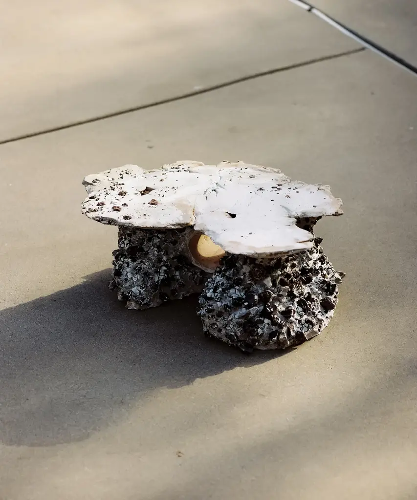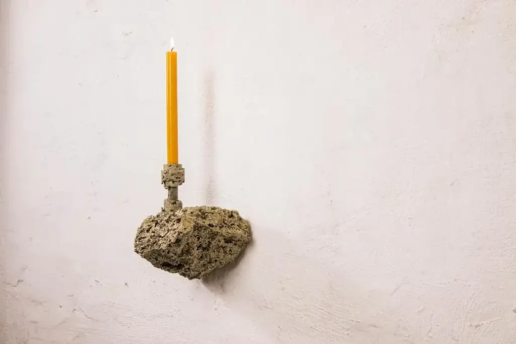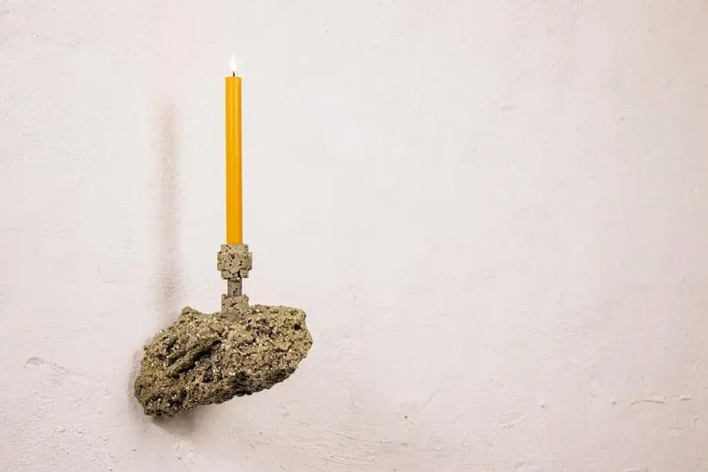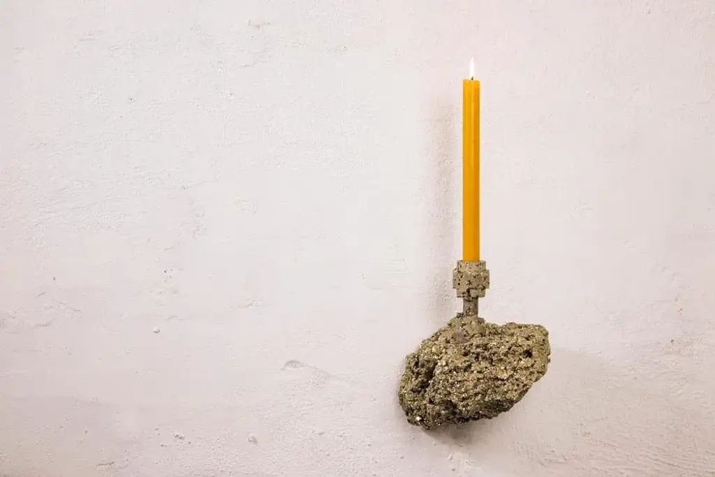 Pyrite abra candelabra by studio do dimensions: d 21 x w 14.5 x h 24 cm materials: pyrite, aluminum. 11.2 kg. stone and fire are connected in an ageless bond. A sparkle created by clashing two stones with each other has been igniting fire over centuries. At the same time stones are used to safely border campfires. The warmth of the stone and intimate flame, reflect here on our interior environment. The classical shapes of candle holders are brought to light by extracting it from the core of a stone. Set in a 21st-century interpretation, it connects a timeless design type with a primitive appearing but contemporary driven technology.