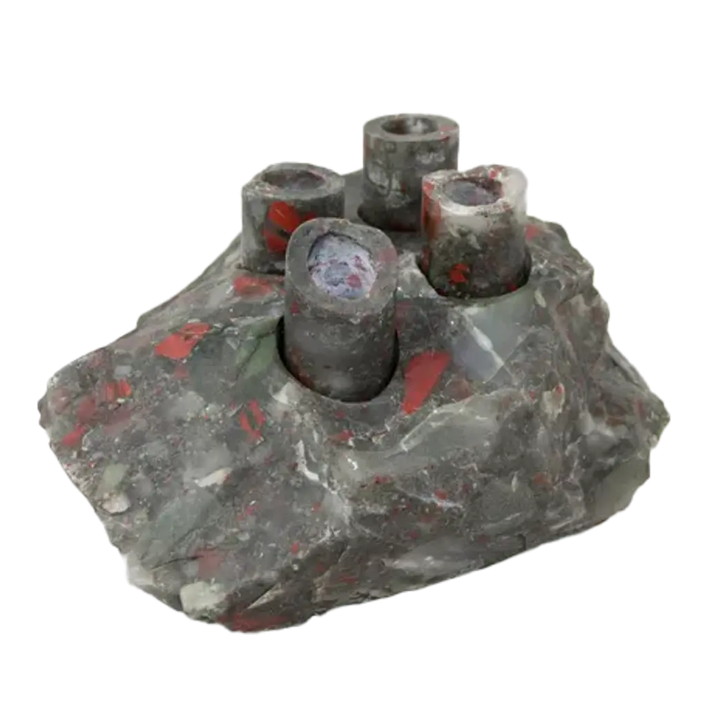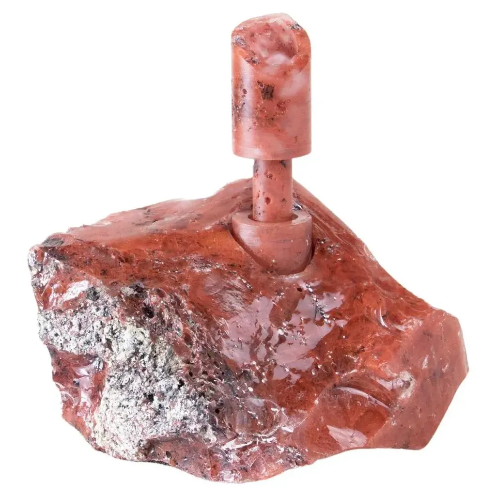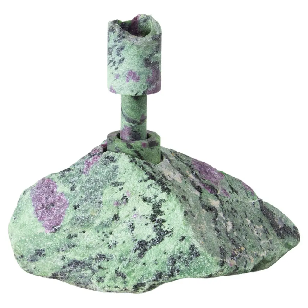 Red glass abra candelabra by studio do dimensions: d 20 x w 16.5 x h 19 cm materials: stone, aluminum. 2.65 kg. Stone and fire are connected in an ageless bond. A sparkle created by clashing two stones with each other has been igniting fire over centuries. At the same time stones are used to safely border campfires. The warmth of the stone and intimate flame, reflect here on our interior environment. The classical shapes of candle holders are brought to light by extracting it from the core of a stone.