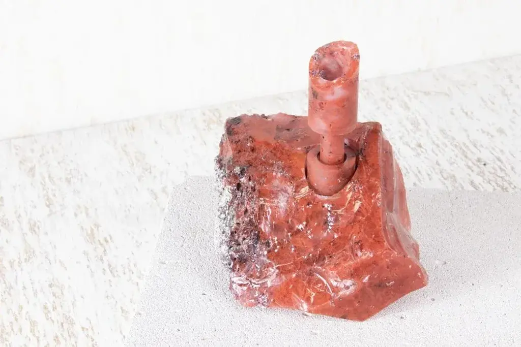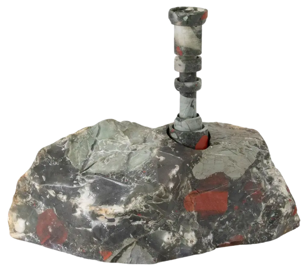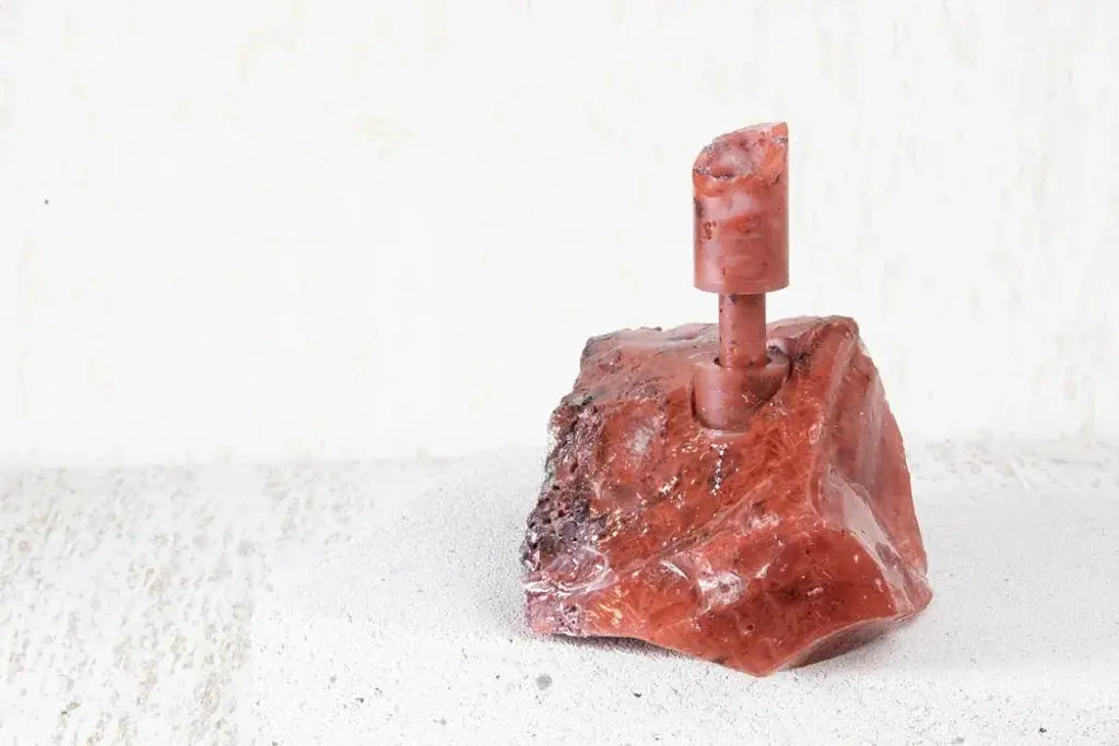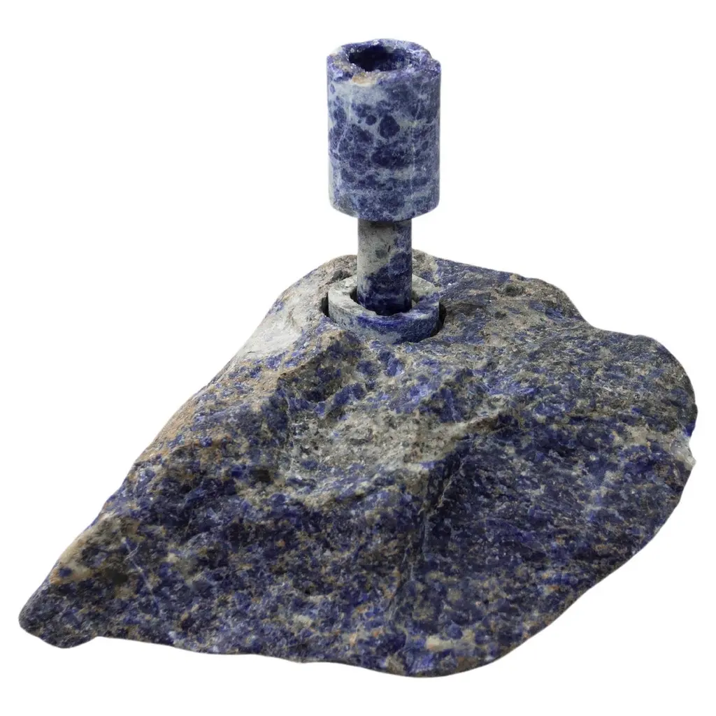 Red glass abra candelabra by studio do dimensions: d 20 x w 16.5 x h 19 cm materials: stone, aluminum. 2.65 kg. Stone and fire are connected in an ageless bond. A sparkle created by clashing two stones with each other has been igniting fire over centuries. At the same time stones are used to safely border campfires. The warmth of the stone and intimate flame, reflect here on our interior environment. The classical shapes of candle holders are brought to light by extracting it from the core of a stone.