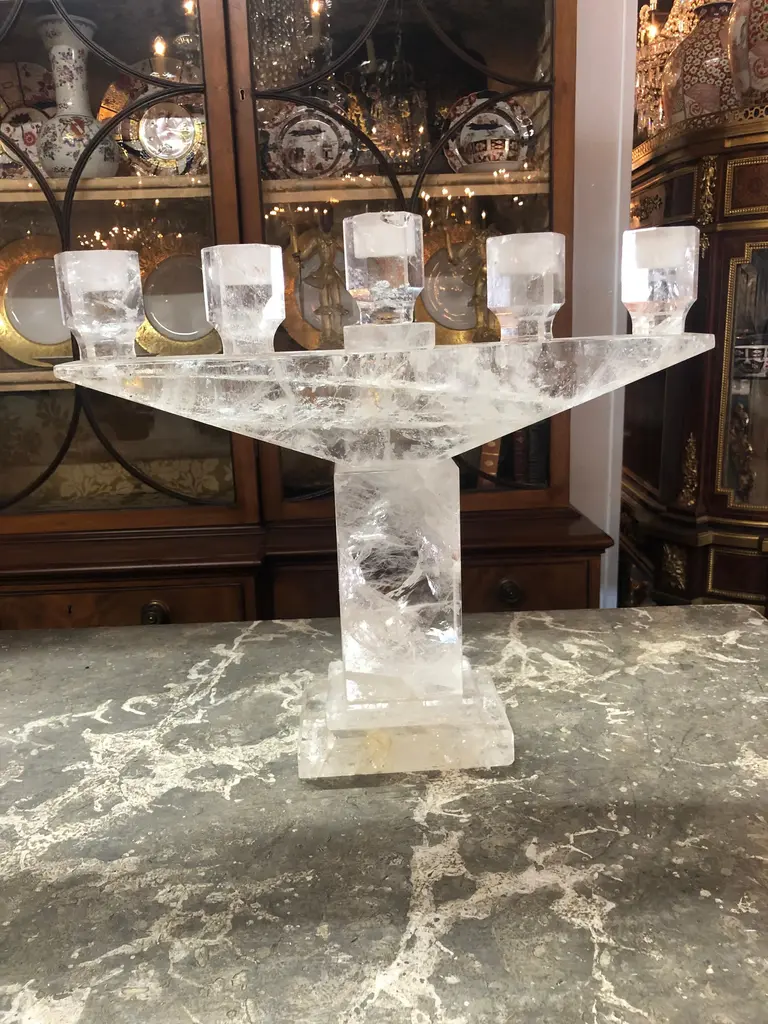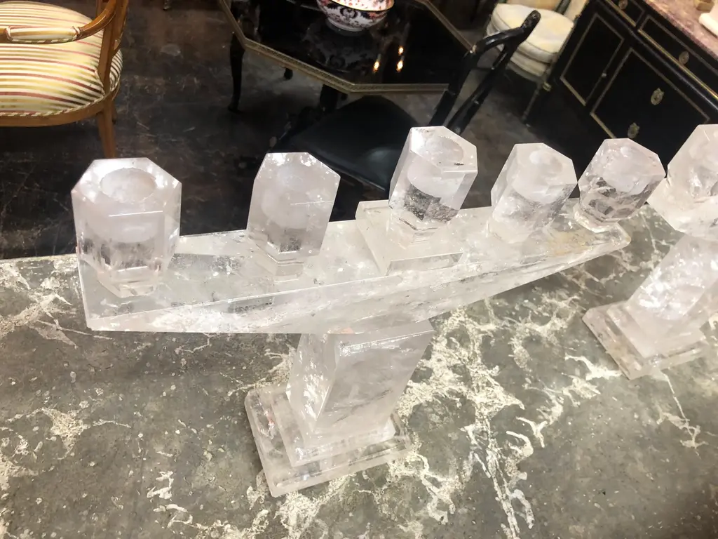 Superb pair of rock crystal 5 light candelabras. Makes a very impressive statement.