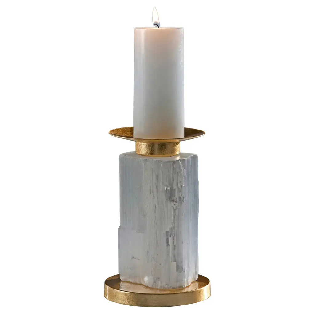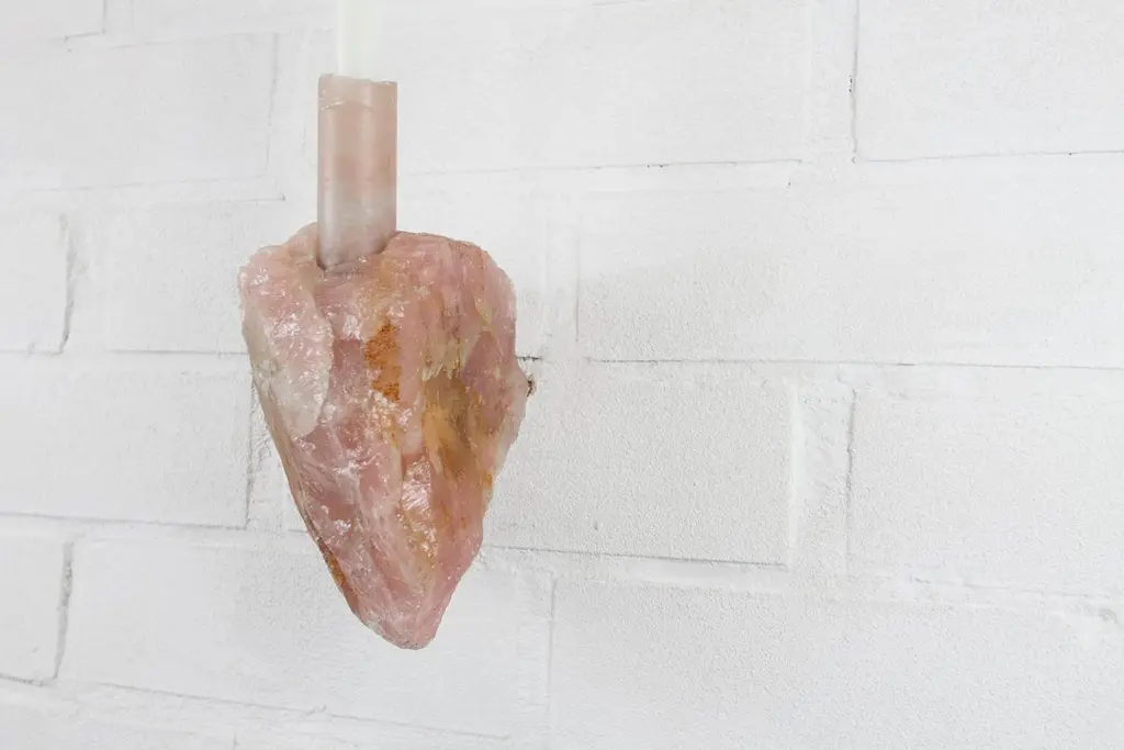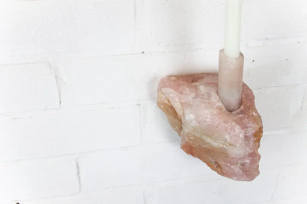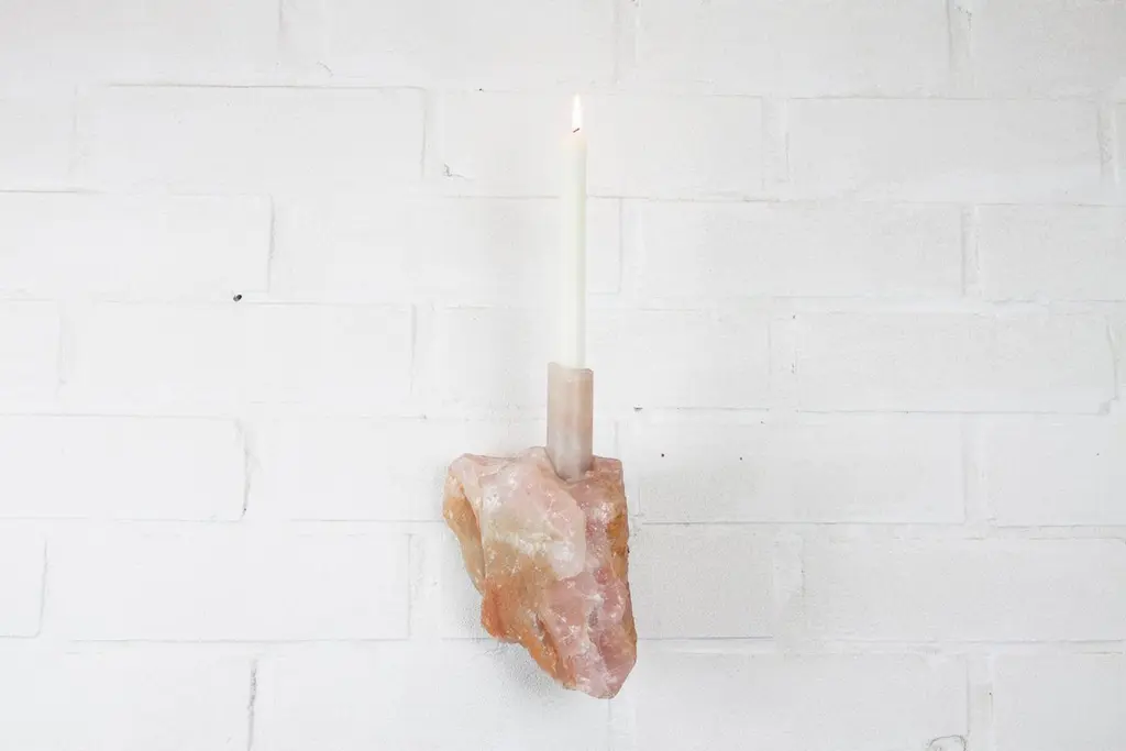 Rose Quartz Abra Candelabra by Studio DODimensions: D 16 x W 14 x H 25.5 cmMaterials: Rose quartz, aluminum.5.4 kg.Stone and fire are connected in an ageless bond. A sparkle created by clashing two stones with each other has been igniting fire over centuries. At the same time stones are used to safely border campfires. The warmth of the stone and intimate flame, reflect here on our interior environment. The classical shapes of candle holders are brought to light by extracting it from the core of a stone. Set in a 21st-century interpretation, it connects a timeless design type with a primitive appearing but contemporary driven technology.Based in Antwerp, Studio DO is a stone cutting atelier founded by Dana Seachuga and Octave Vandeweghe. These two creatives work independently: Dana as a jewellery maker and Octave as an artist. For Studio DO they joined forces and share their creative visions and expertise. Driven by their affection for stone cutting, they research the material and cultural role of (gem)stones within the realm of functional objects. Using basic interventions, shapes and aesthetics, they try to search for the minimal action necessary to give a rock a (traditional) function.Studio DO works on design projects and takes commissions related to stone, art, design objects and jewellery. Label & Labour stand along each other as one, becoming inseparable.