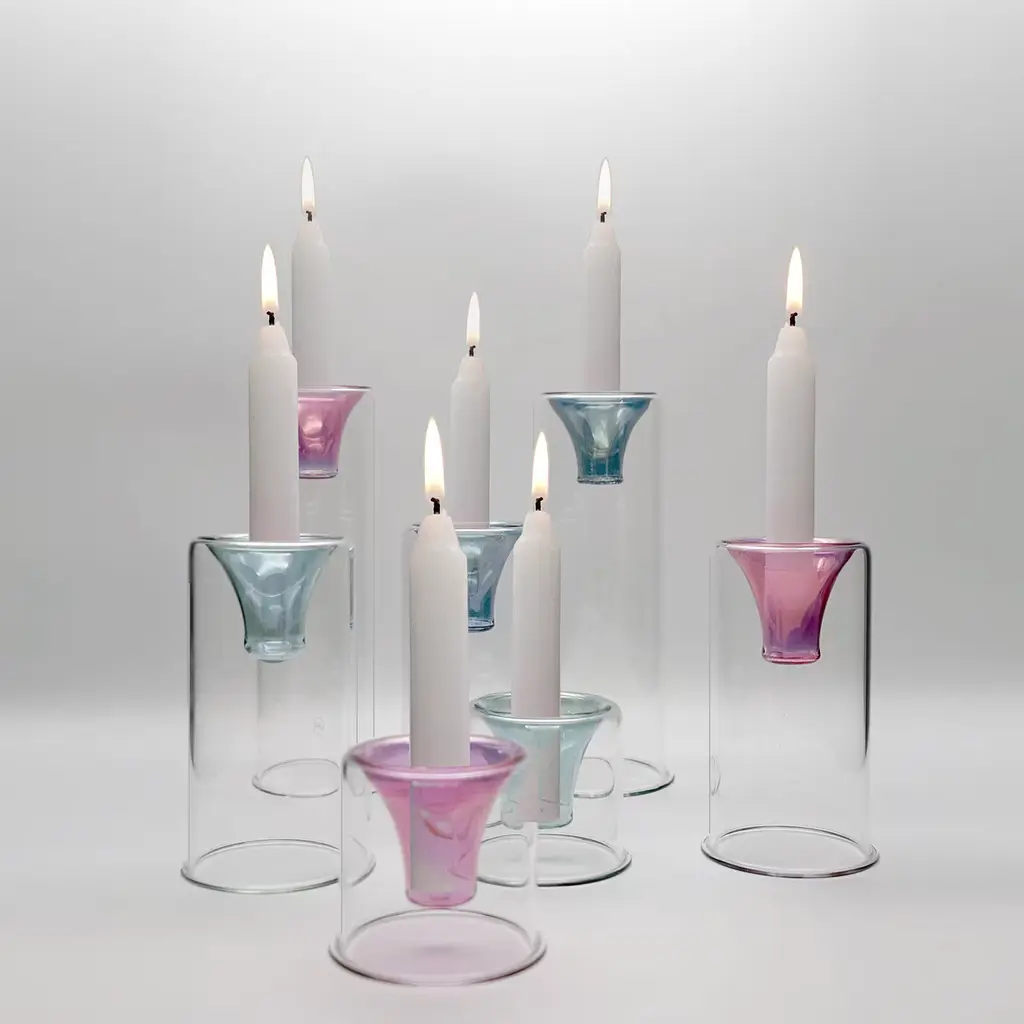 These glass candelabras have a diameter of 6.5cm with a height of 6.5cm, 12.5cm, and 19cm.
