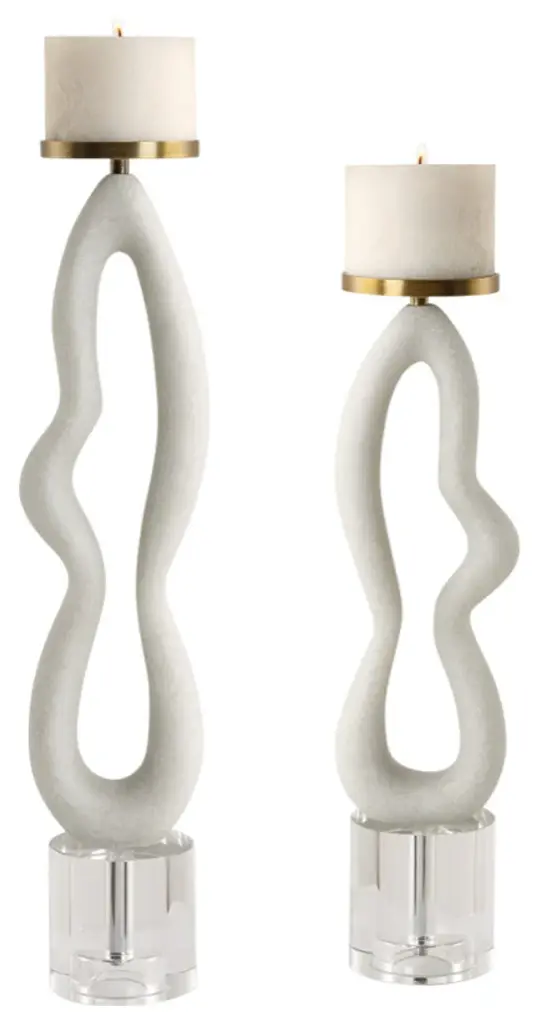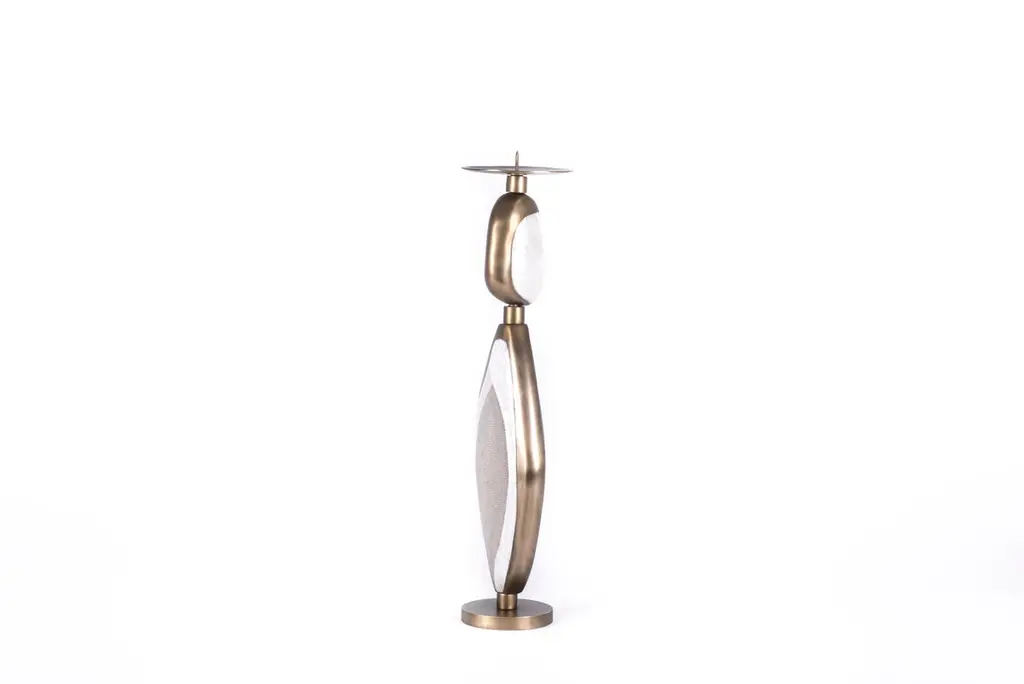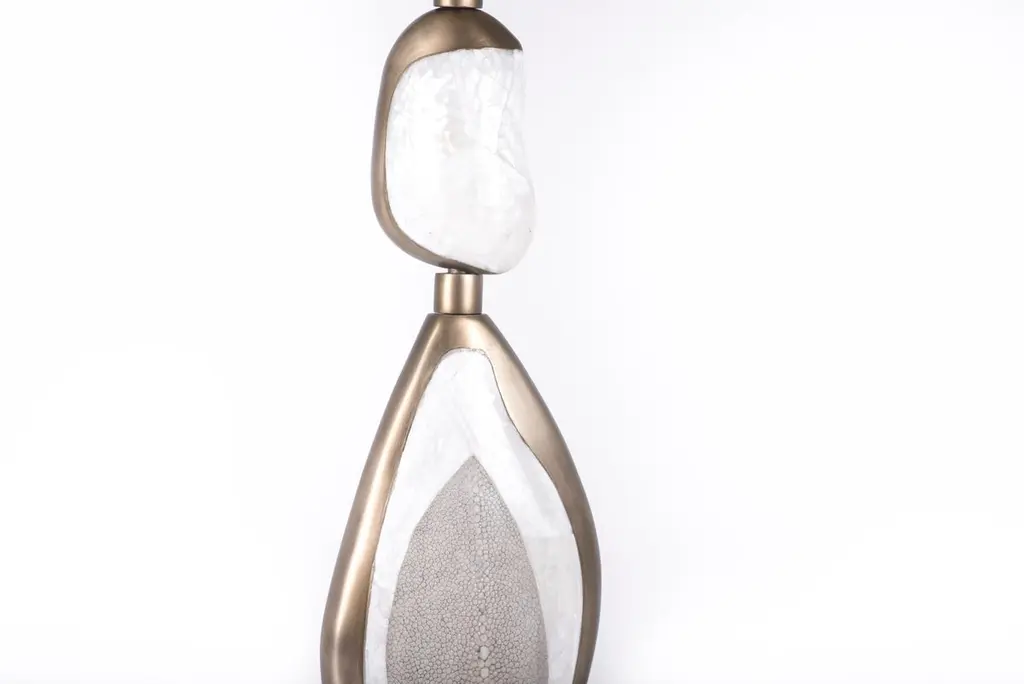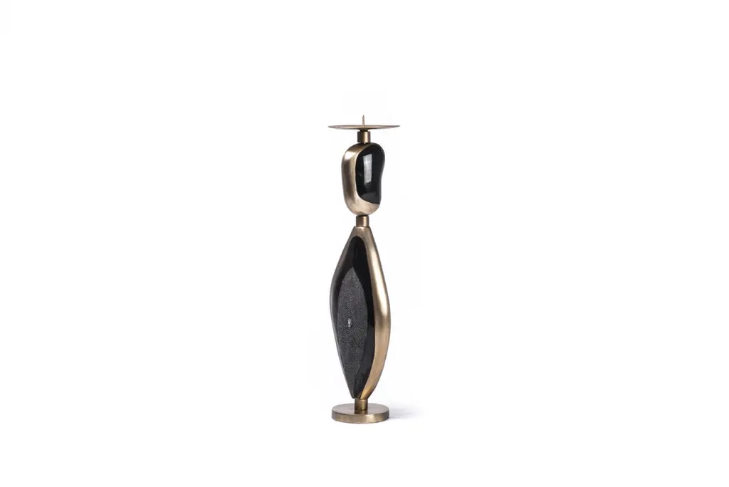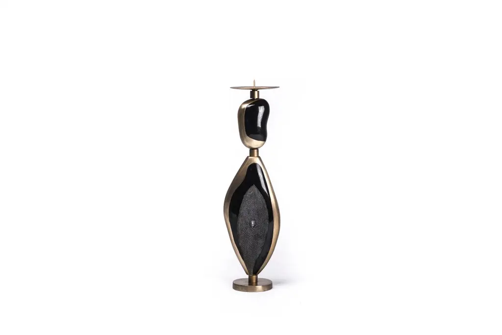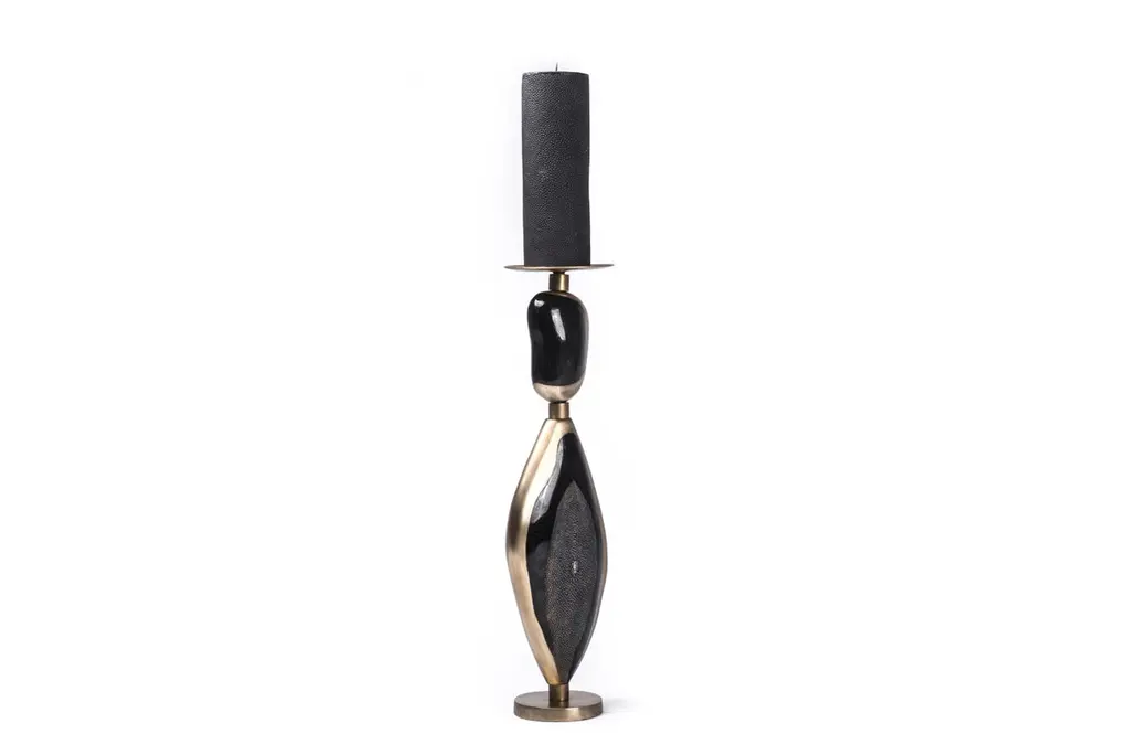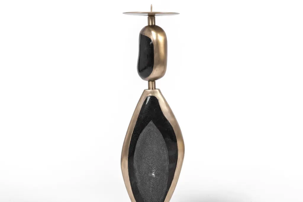 The Paris based label has distinguished themselves since their launch, with their iconic use of shagreen mixed with brass and other exotic materials. All furniture is handcrafted by skilled artisans, ultimately making each piece unique, designed in Paris and produced in the Philippines.The Cosmo candle base is a whimsical and sculptural piece, inlaid in either option 1 black shagreen, black pen shell and bronze-patina brass, or option 2 cream shagreen, mother of pearl and bronze-patina brass. This listing is for option 2. The amorphous shapes on the bottom part can be moved to adjust the angle of each part. Sold with a pillar candle.The dimensions of this piece are 4.25 x 9 x 19.75"All Patrick Coard Paris pieces are handmade by artisans, ultimately making each piece unique. Wipe clean with soft dry cloth Patrick Coard Paris- an Irish/Scandinavian designer, threw the gauntlet down with an awe inspiring collection of candles never seen before. Whilst the market has been saturated with scented candles he went back to basics of non-scented candles. He used his love of this aesthetic to be the first to bring out a collection of candles in shagreen and exotic skin textures, in beautifully hand carved patterns and sculptural shapes with metal inserts. His inspirations from sculptors from the 1930s and 1940s has created a modern collection in which one can utterly relax.Color variants may occur, but this showcases the Parisian label's commitment to creating authentic luxurious products using natural components.