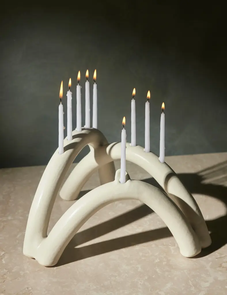 The arching lines of this ceramic menorah offer a sculptural drama that can elevate your tablescape or mantel all year long. Pay homage to tradition with a modern candelabra that folds into your space with a timeless and grounded tone for all year-round.