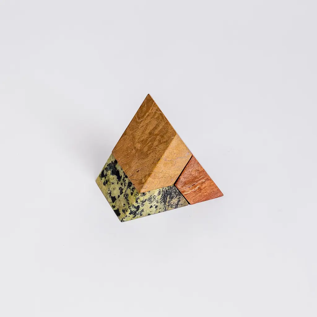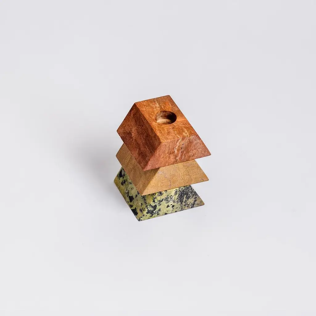 Transform your home with this modular gemstone candelabra. Creative and adaptable design.This sculptural triangle puzzle has a hidden use as a candelabra, allowing endless configurations to stack and play. The weight of the gemstones adds a grounding element to the table as you set your décor with intention. This sculptural piece is a powerful decorative object for any home or office space.Dimension: 3.75 x 3.75 x 2.8 inWeight: 2.1LbMaterial: Serpentine, Soapstone, JasperAbout these Gemstones:• Green Serpentine is a unique stone formed of crystal-like minerals, ranging from lime green to deep pine. This stone is said to stimulate the digestive and glandular system, and shields from invasive vibrations.• Creamy Soapstone varies from pink to gray to yellow tones, depending on the mineral composition. It is valued for helping one prepare for change, promoting rational and creative thinking.• Orange Jasper is a variety of quartz blended with volcanic earth, forming its earth-like colour. Said to be the “Supreme Nurturer,” jasper offers grounding and comfort.