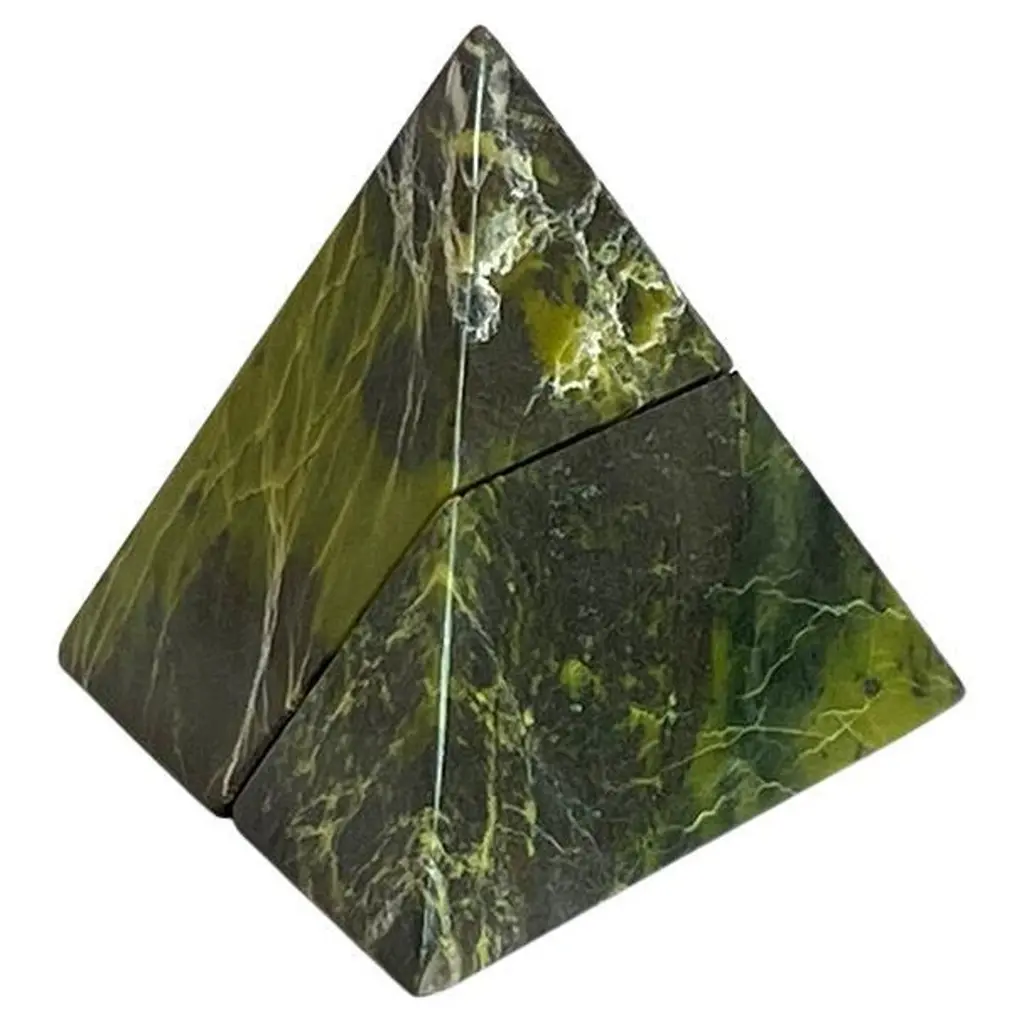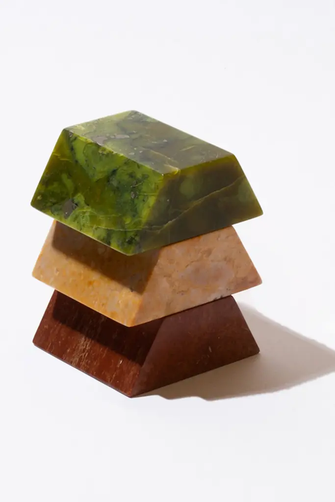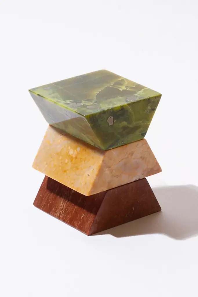 Carved from three unique Andean gemstones, this large sculptural puzzle solves to form a triangle, or stacks as a candelabra to illuminate your table.