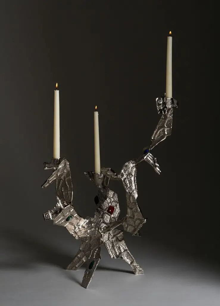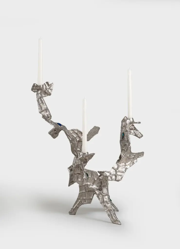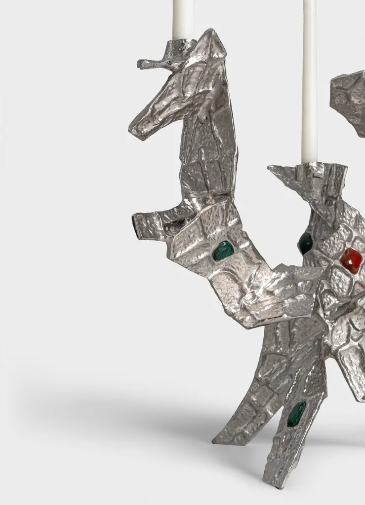 Tutti Frutti Nickel Candelabra in Brass & Semi Precious Stones, Viya by Vikram GoyalForget the Maharajas’ necklace; these brass beauties are a cocktail of reinvention. Semi-precious stones, once adorning royalty, now dance on playful forms, inspired by Cartier's iconic Tutti Frutti whimsical fine jewels. Each brass object inlaid with a burst of semi-precious stones invites you to discover the joy in everyday beauty.Candelabra in brass and nickel with semi precious inserts. Handmade in India.Product DetailsMaterial: BrassInlay: Lapiz Lazuli, Red Jasper, Malachite, Green Aventurine, AbaloneSize: 20"L x 15.5"W x 24"H 50.8 L x 39.4 W x 61 H cmWeight: 8.15 kg 17.93 lbsNumber of Pieces: 1 CandelabraSKU: VCS2753This product has been handcrafted by local artisans. As such, slight variations are a testament to the unique character of a piece made by hand.