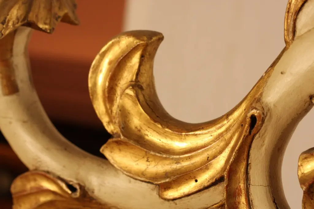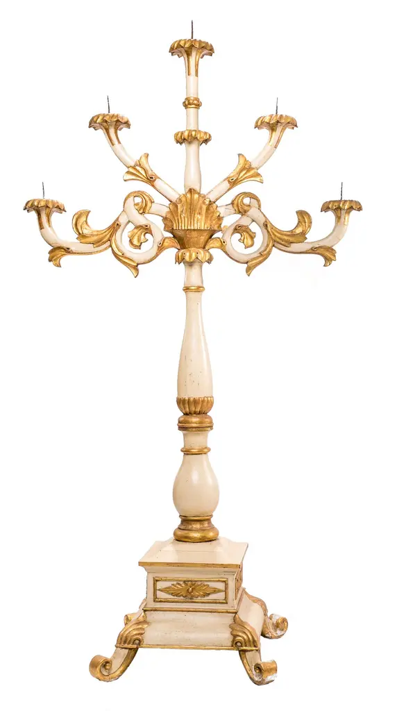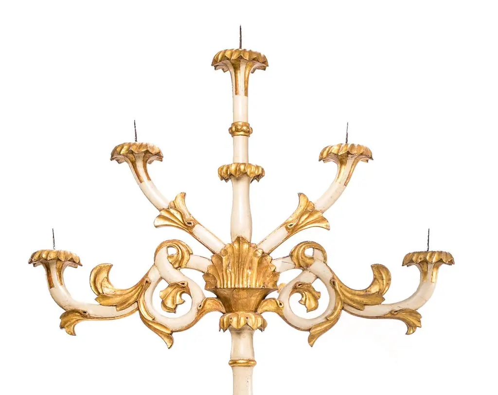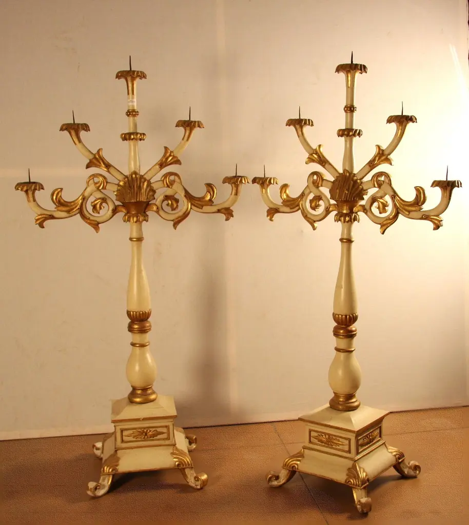 Two five-light candelabra, wooden, gilded and lacqueredSpectacular pair of large 5-light candelabra, wooden completely hand carved and gilded.The wood is lacquered, carved and gilded with gold leaf.The fluted conical shaped stem, rests on a carved base, from which five arms depart, carved with scrolls of acanthus leaves.They are in excellent general condition, intact.They come from the furniture of a Venetian church (Venice).Period: first years of 1800Of high quality and workmanship, optimal for an exclusive and noble furniture.The gilding is still very vivid and bright.Dimensions referred to the single object:- Height 160 cm- Width 90 cmContact us for further clarifications or photographic details.And 'possible to carry out by us any type of restoration (complete or conservative) on all objects offeredWe ship worldwide in maximum security. The shipment is agreed privately.Rif. 6659.