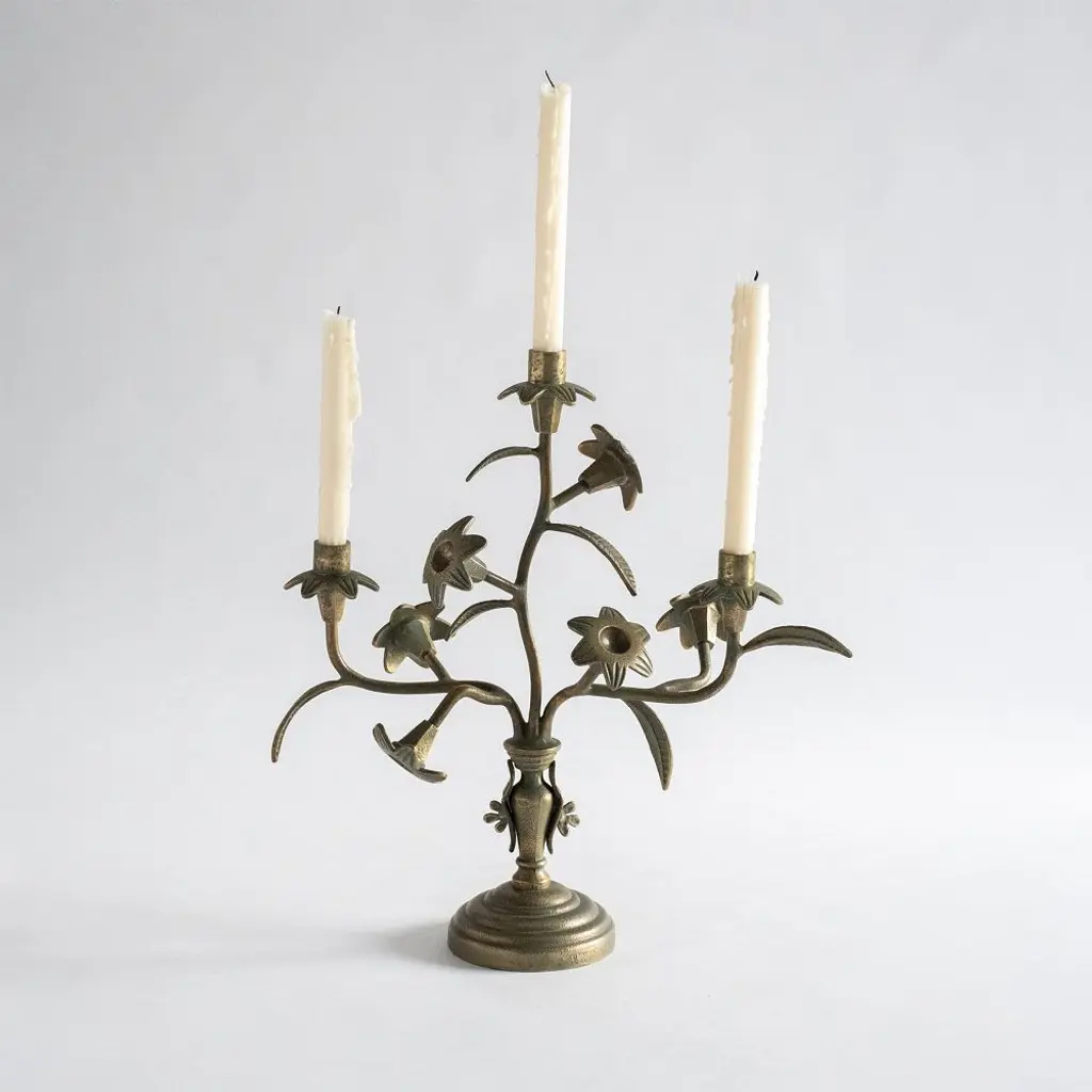Under The Banyan Gold Candelabra in Brass, Viya by Vikram GoyalEchoing ancient whispers of worship, each object captures the essence of the Banyan tree, believed to hold the divine power to fulfil wishes. Crafted with reverence, these pieces pay homage to the tree's sacred names—Vat Vriksha, Bargad, and Bahupata, the latter signifying its multitude of roots connecting earth and heavens. Beyond brass and form, these objects reflect the intricate dance of aerial roots, encapsulating the symbolism of longevity, mortality, and enlightenment.Candle Stand in brass. Handmade in India.Product DetailsMaterial: BrassSize: 15"L x 12"W x 27"H 38.1 L x 30.5 W x 68.6 H cmWeight: 7.6 kg 16.72 lbsPackage Contains : 1 Candle StandSKU: VCS1401This product has been handcrafted by local artisans. As such, slight variations are a testament to the unique character of a piece made by hand.
