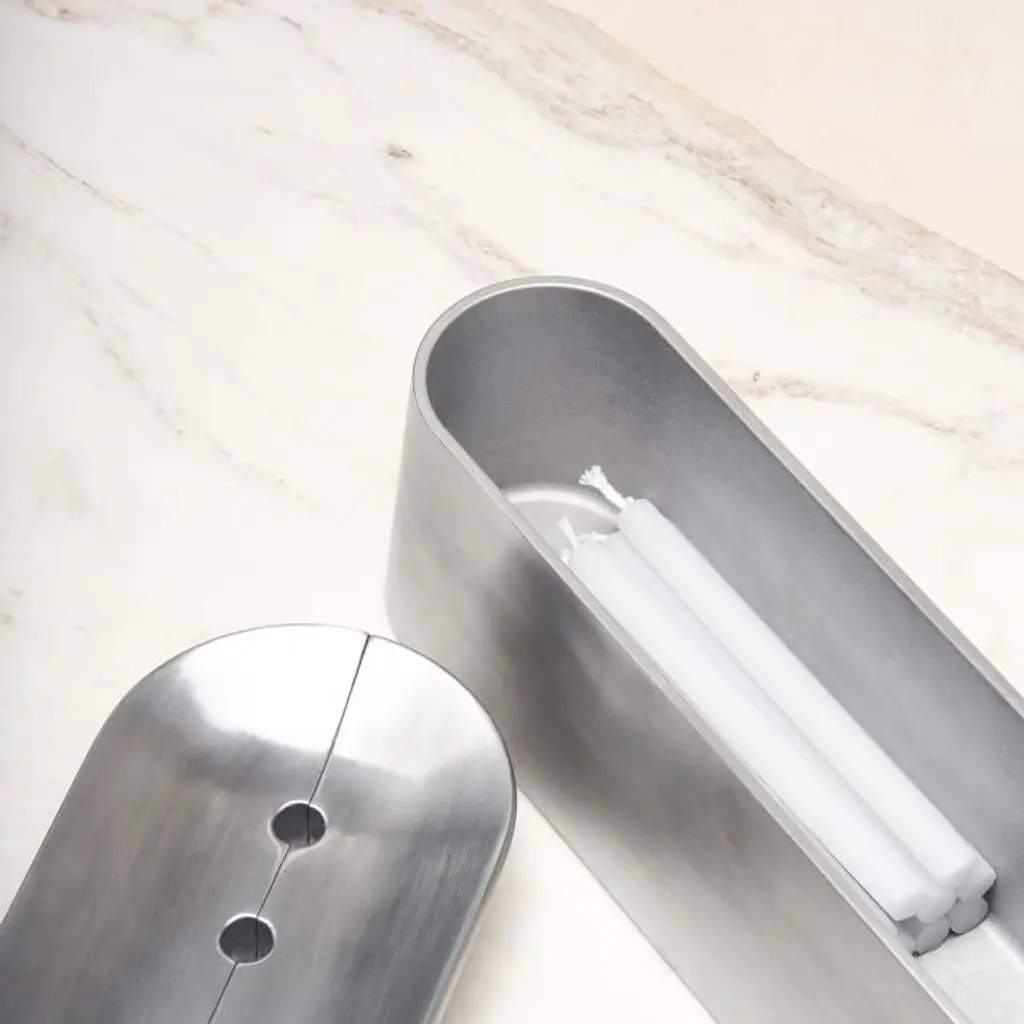 Created by Via Maris. Learn more. 11.42"w x 3.15"d x 3.15"h. Steel and aluminum. Storage compartment fits 44 candles. Candles sold separately. Designed in New York, NY. Made in China. Your purchase of LOCAL items helps support small businesses right in your own backyard. Learn more.