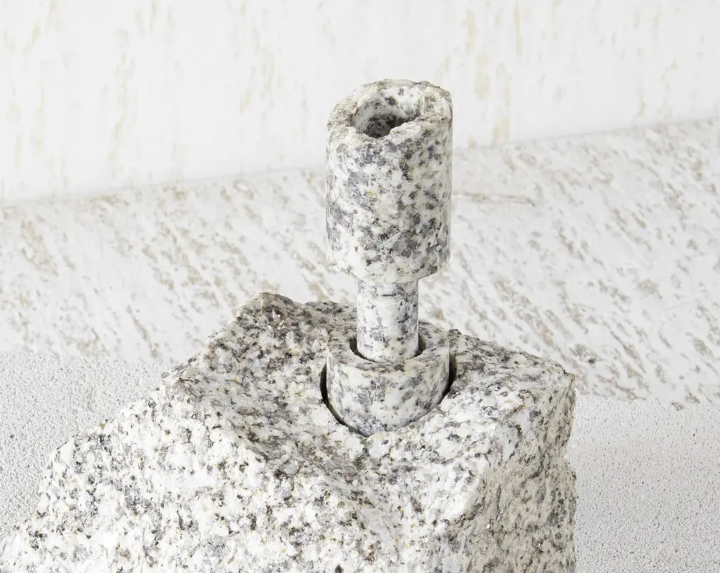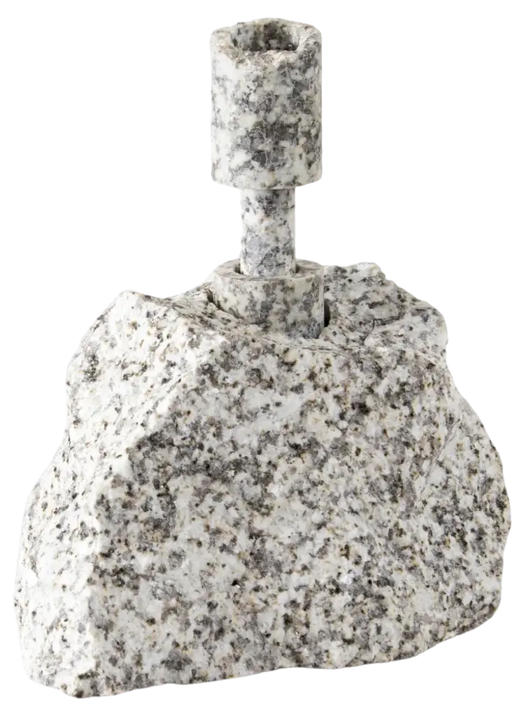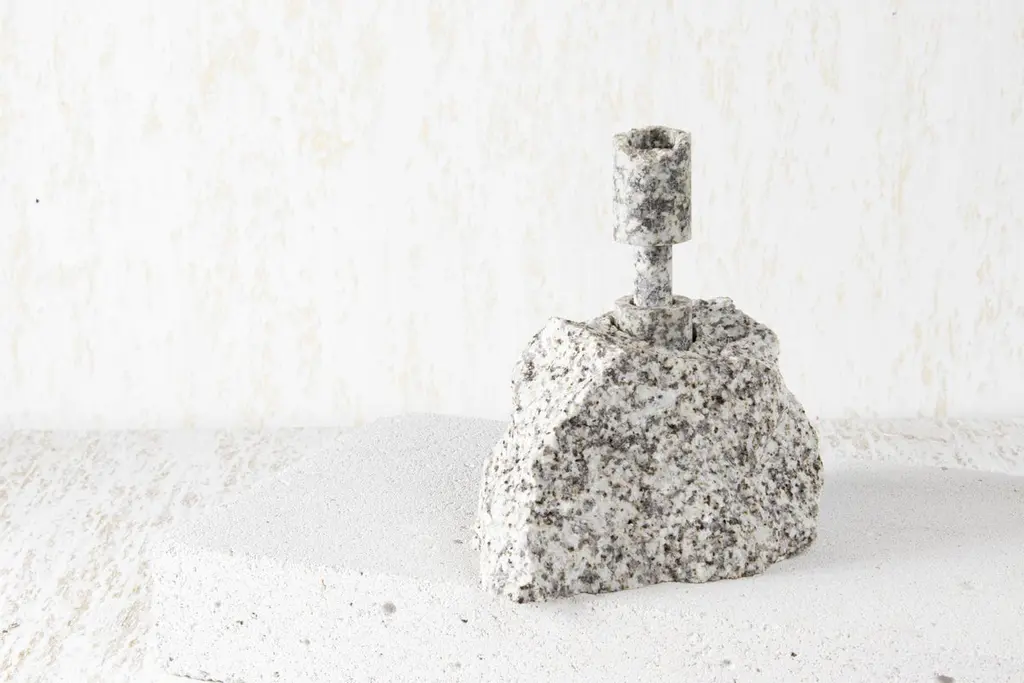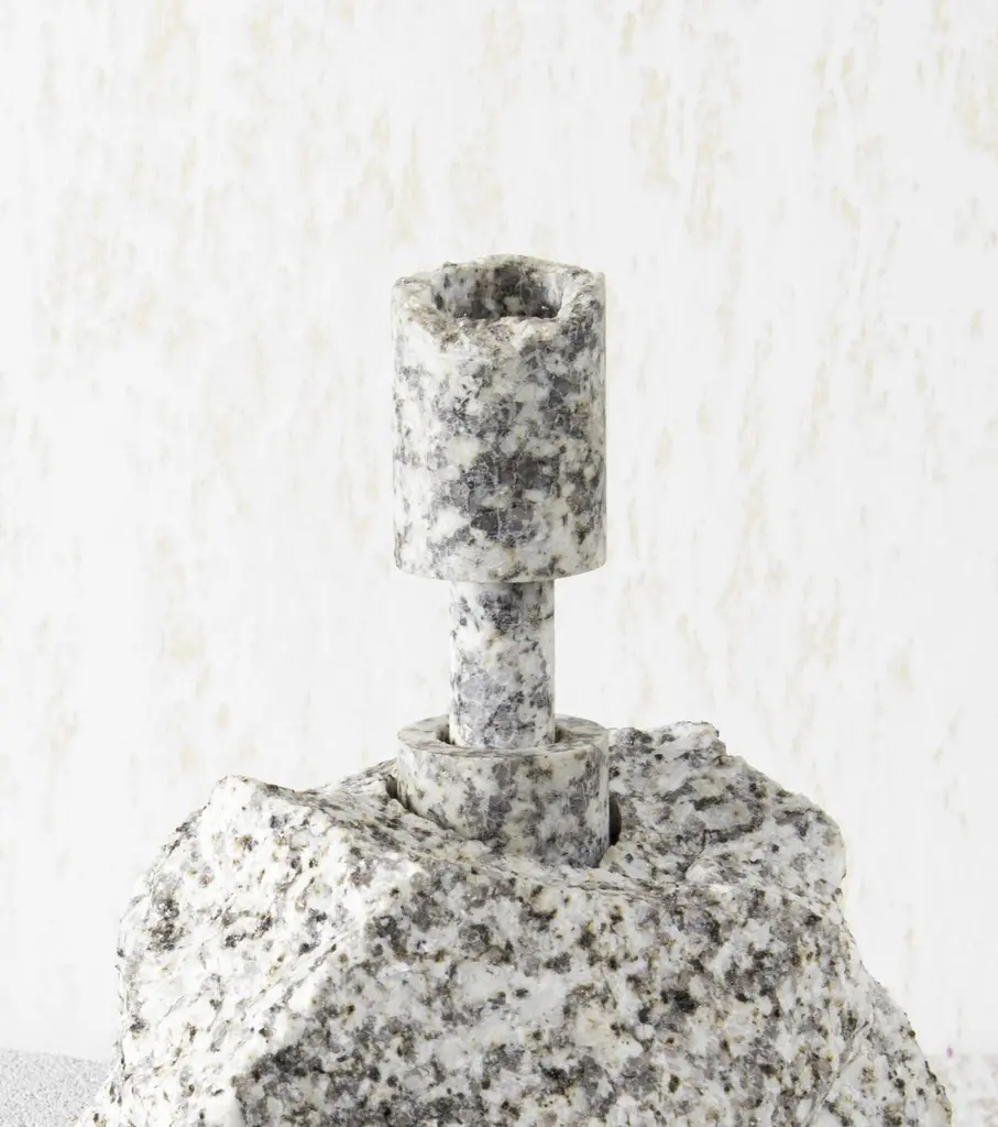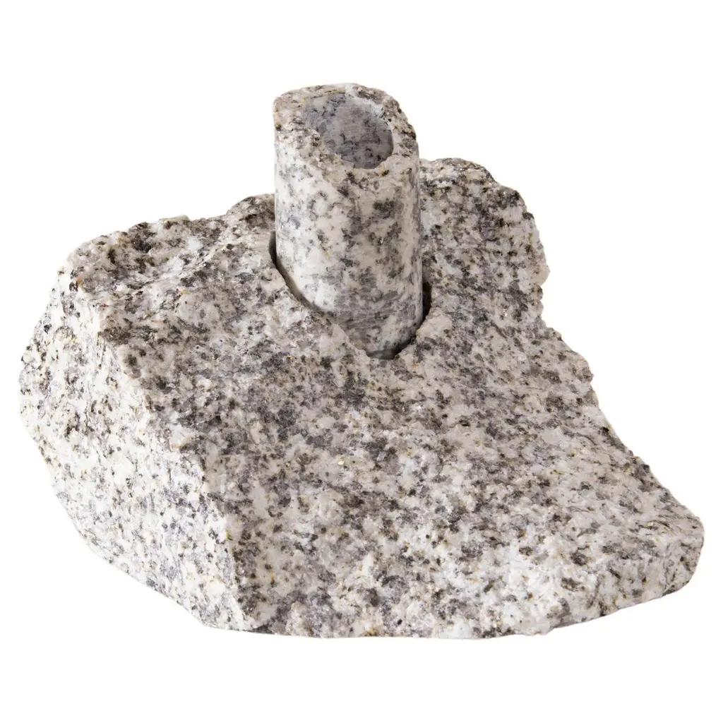 White Granite Abra Candelabra I by Studio DODimensions: D 17 x W 12.5 x H 18 cmMaterials: Granite, aluminum.3.2 kg.Stone and fire are connected in an ageless bond. A sparkle created by clashing two stones with each other has been igniting fire over centuries. At the same time stones are used to safely border campfires. The warmth of the stone and intimate flame, reflect here on our interior environment. The classical shapes of candle holders are brought to light by extracting it from the core of a stone. Set in a 21st-century interpretation, it connects a timeless design type with a primitive appearing but contemporary driven technology.Based in Antwerp, Studio DO is a stone cutting atelier founded by Dana Seachuga and Octave Vandeweghe. These two creatives work independently: Dana as a jewellery maker and Octave as an artist. For Studio DO they joined forces and share their creative visions and expertise. Driven by their affection for stone cutting, they research the material and cultural role of (gem)stones within the realm of functional objects. Using basic interventions, shapes and aesthetics, they try to search for the minimal action necessary to give a rock a (traditional) function.Studio DO works on design projects and takes commissions related to stone, art, design objects and jewellery. Label & Labour stand along each other as one, becoming inseparable.