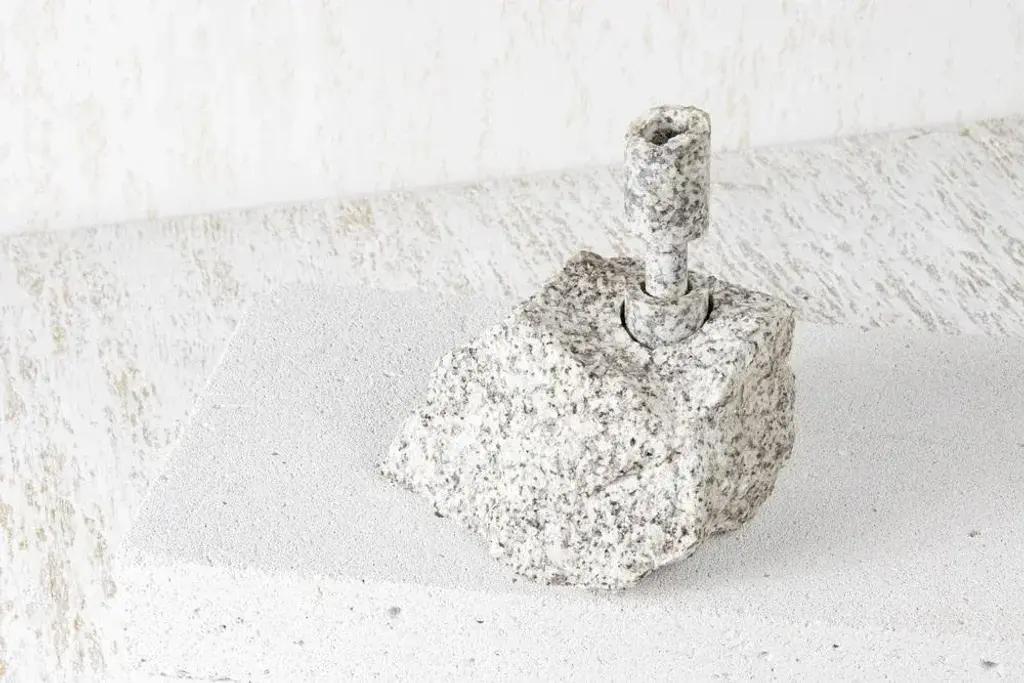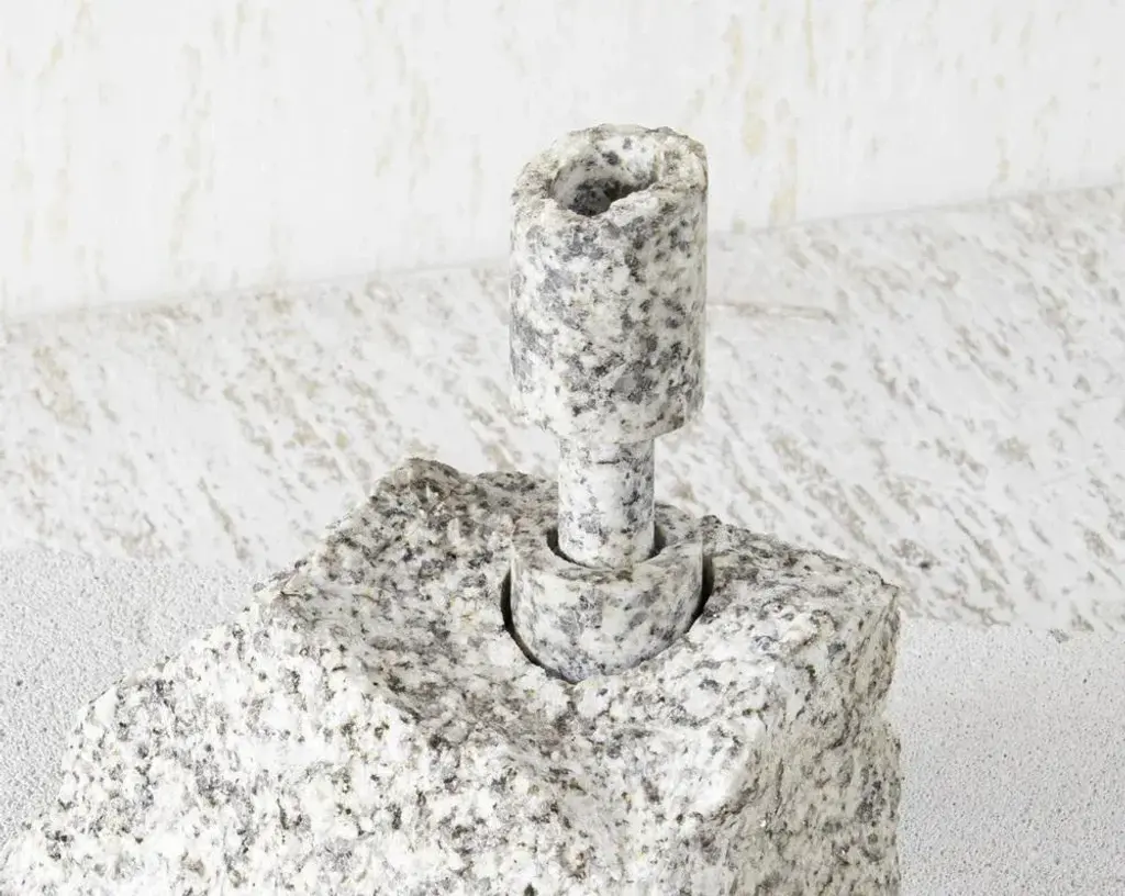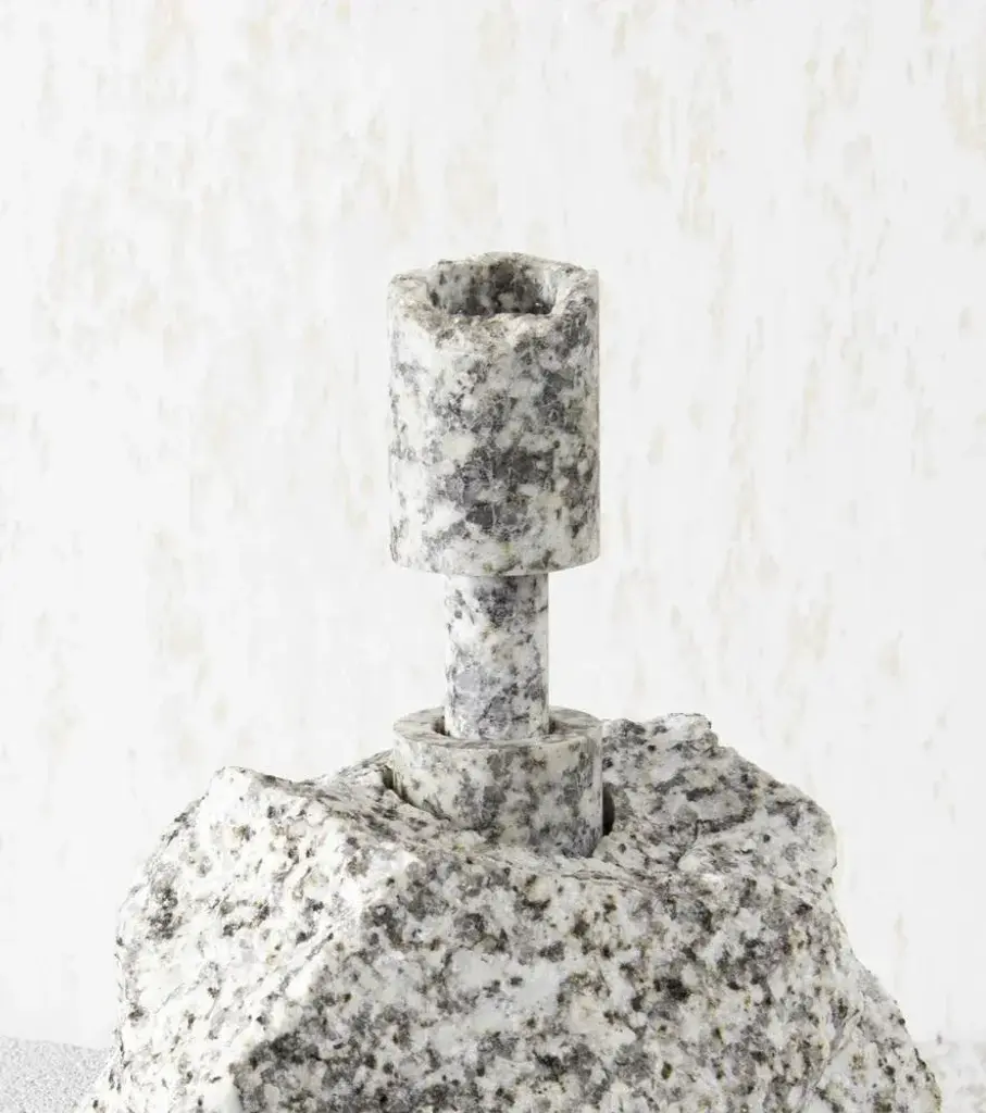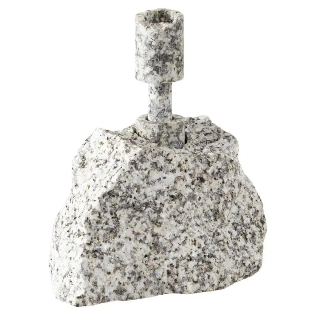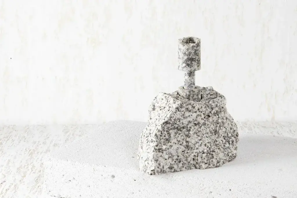 White granite abra candelabra i by studio do dimensions: d 17 x w 12.5 x h 18 cm materials: granite, aluminum. 3.2 kg. Stone and fire are connected in an ageless bond. A sparkle created by clashing two stones with each other has been igniting fire over centuries. At the same time stones are used to safely border campfires. The warmth of the stone and intimate flame, reflect here on our interior environment. The classical shapes of candle holders are brought to light by extracting it from the core of a stone.