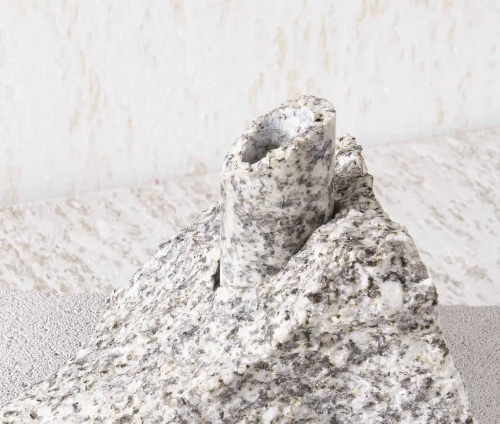 White Granite Abra Candelabra II by Studio DODimensions: D 16 x W 12.5 x H 11.5 cmMaterials: Granite, aluminum.2 kg.Stone and fire are connected in an ageless bond. A sparkle created by clashing two stones with each other has been igniting fire over centuries. At the same time stones are used to safely border campfires. The warmth of the stone and intimate flame, reflect here on our interior environment. The classical shapes of candle holders are brought to light by extracting it from the core of a stone. Set in a 21st-century interpretation, it connects a timeless design type with a primitive appearing but contemporary driven technology.Based in Antwerp, Studio DO is a stone cutting atelier founded by Dana Seachuga and Octave Vandeweghe. These two creatives work independently: Dana as a jewellery maker and Octave as an artist. For Studio DO they joined forces and share their creative visions and expertise. Driven by their affection for stone cutting, they research the material and cultural role of (gem)stones within the realm of functional objects. Using basic interventions, shapes and aesthetics, they try to search for the minimal action necessary to give a rock a (traditional) function.Studio DO works on design projects and takes commissions related to stone, art, design objects and jewellery. Label & Labour stand along each other as one, becoming inseparable.