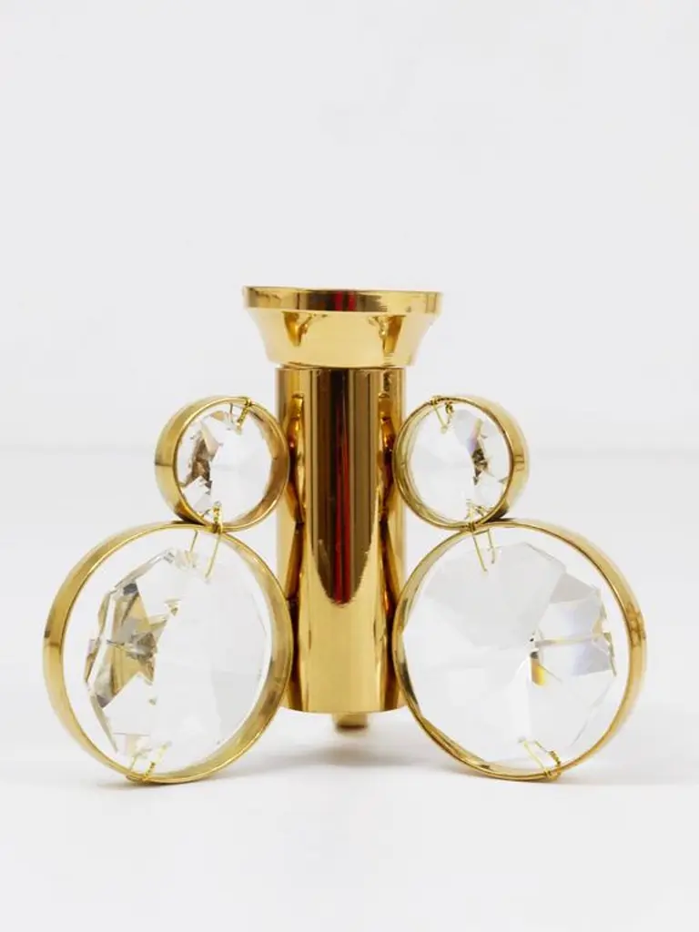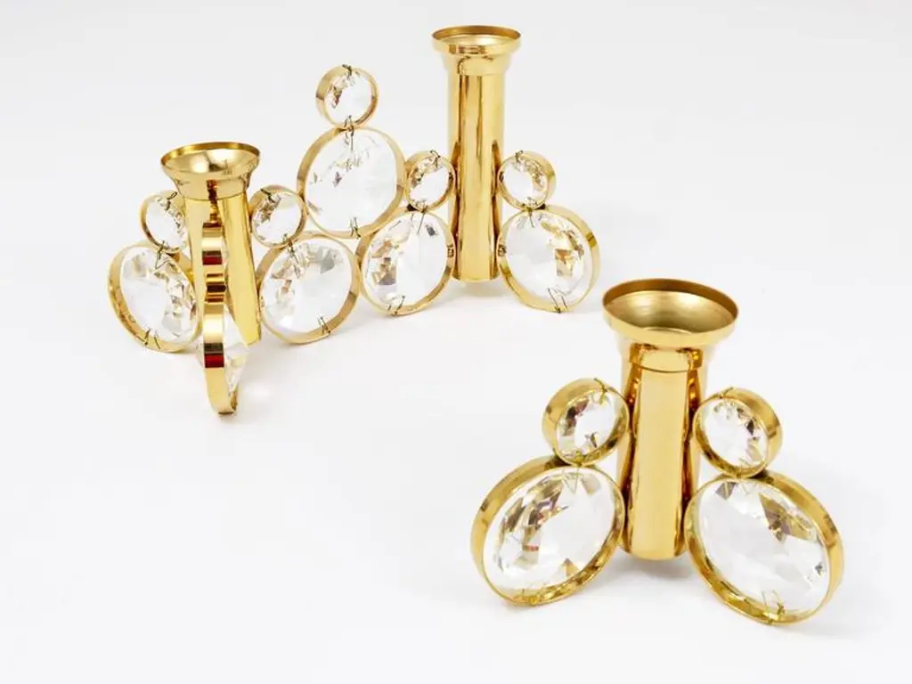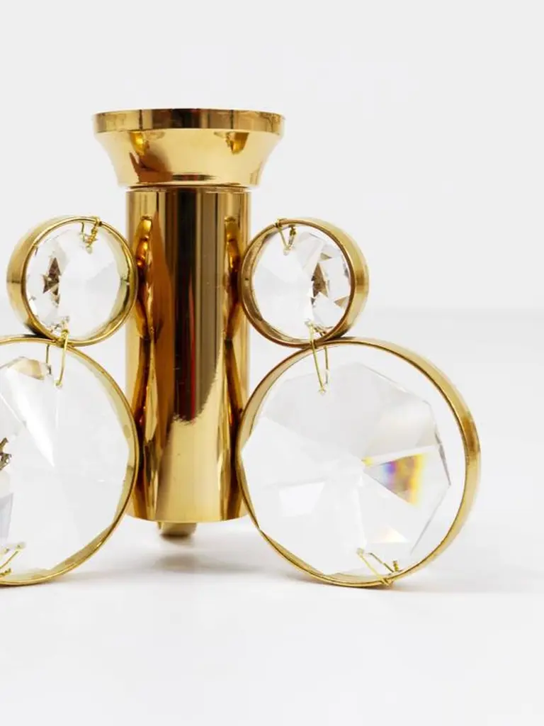 Up to 10 beautiful candle holders in the style of Gaetano Sciolari. Manufactured in the 1970s by Palwa Germany. Made of gold-plated brass with huge faceted crystals. In excellent condition. There are ten identical candleholders available, the price is per piece. We offer matching candle sticks in various sizes in our other listings.