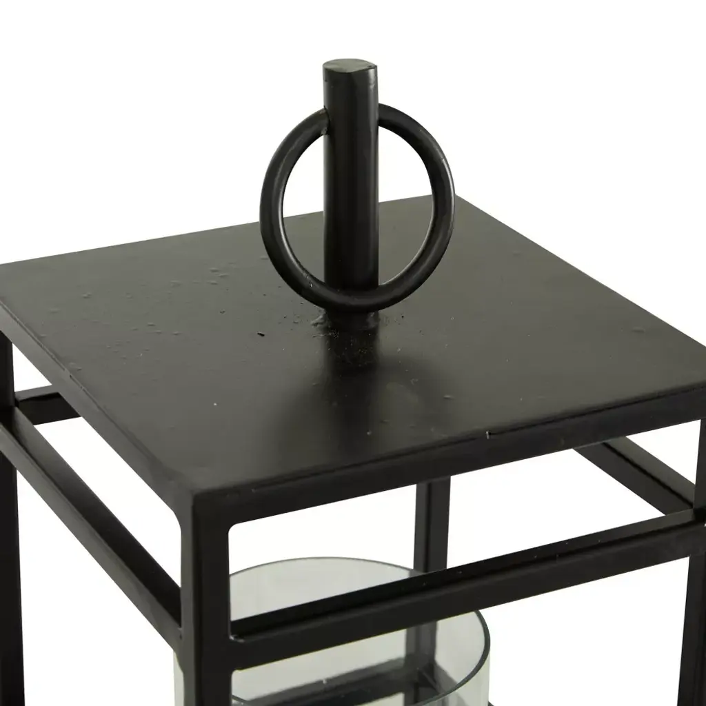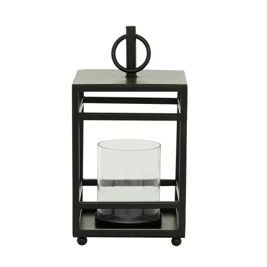 Infuse your space in the romantic candlelight glow that emits from this matte black candle lantern for home. Delight your guests and make any occasion extra special by adding a lighted or flameless candle to this lantern. Made with a sturdy base, it is perfect for creating an elegant atmosphere at your table top or mantel. This lantern style candle holder can accommodate 1 candle. This item comes shipped in one carton. Suitable for indoor use only. Made in India. Contemporary design. This lantern style pillar candle holder can accommodate 1 pillar candle.