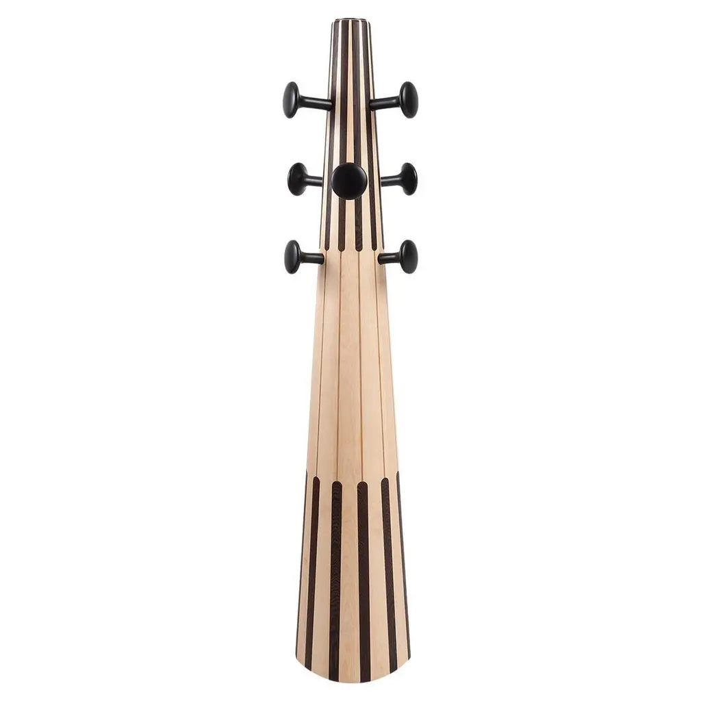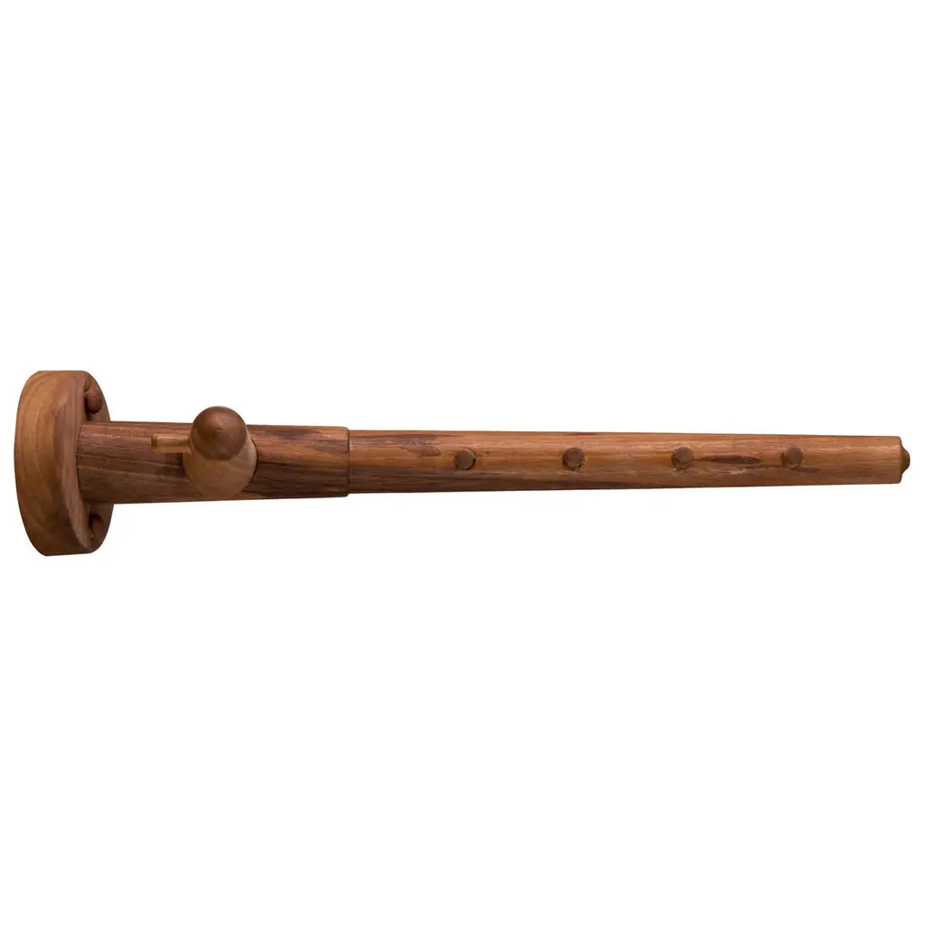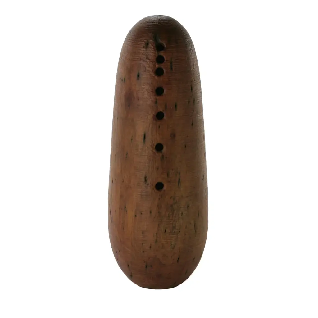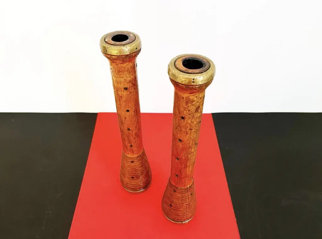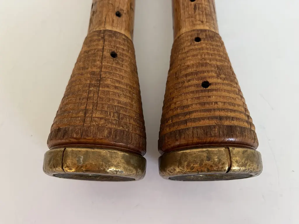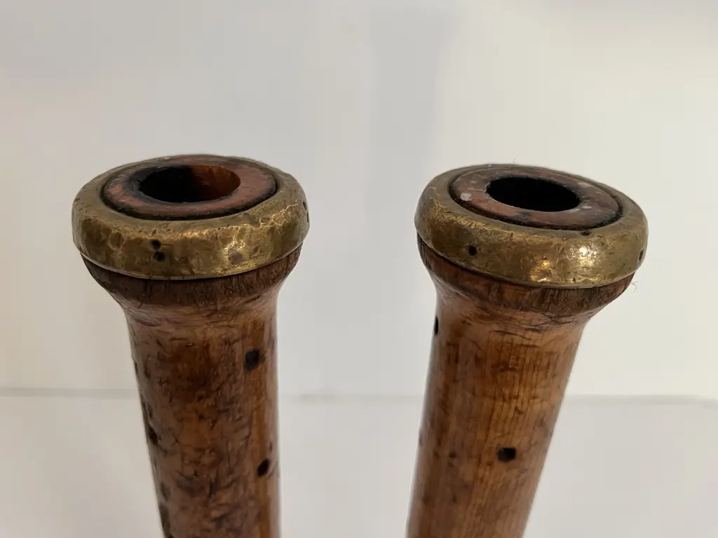 Large pair of 1960s Brutalist style Tuscan column candlesticks of pierced and carved wood with concentric ringed bases capped top and bottom with hammered brass. Uniform patina, natural wear.