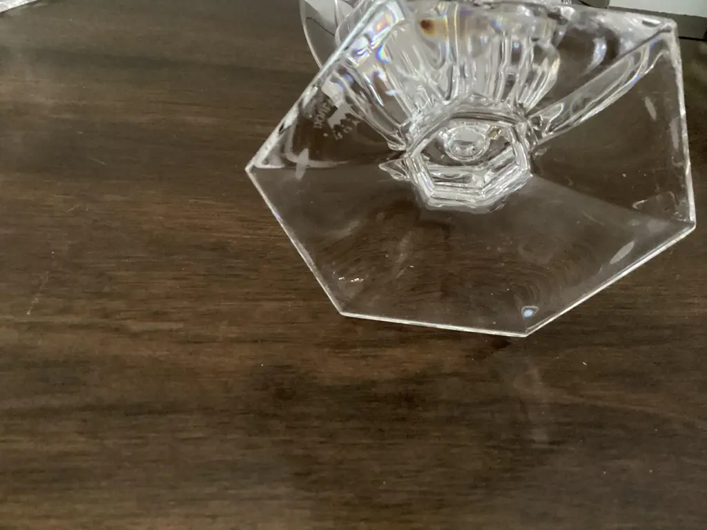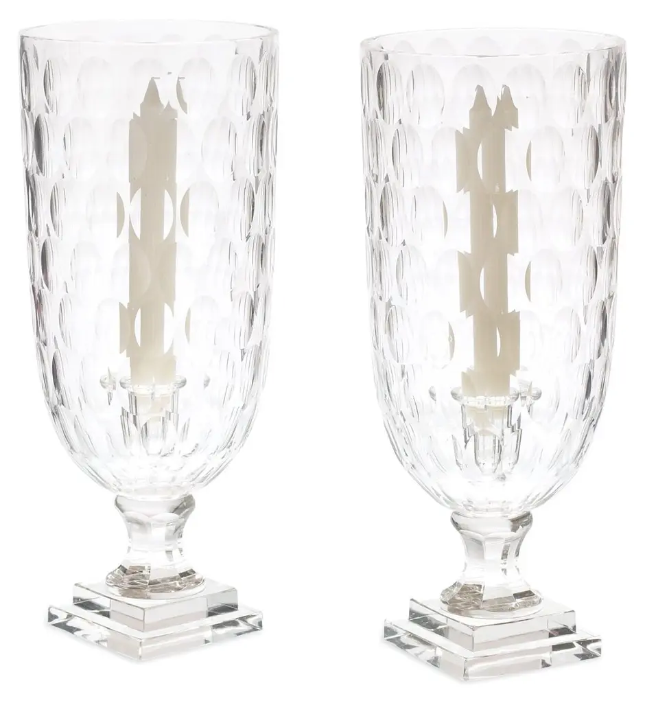 4” h x 4-1/4” diameter. Each weighs 1 lb., 7 ounces. These gorgeous candle holders make an impressive statement atop your table. They catch light readily and shine beautifully. Excellent condition. No chips or cracks. Each of these has a minor worn spot on the underside of the foot (seen in the last two photos). Thank you for visiting this listing.
